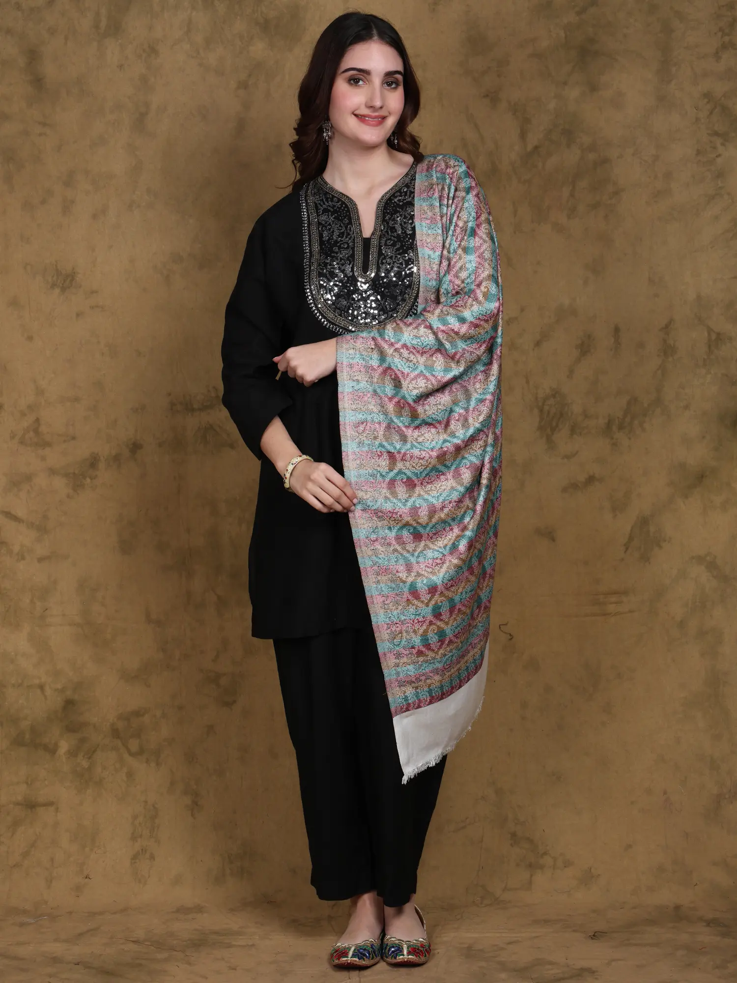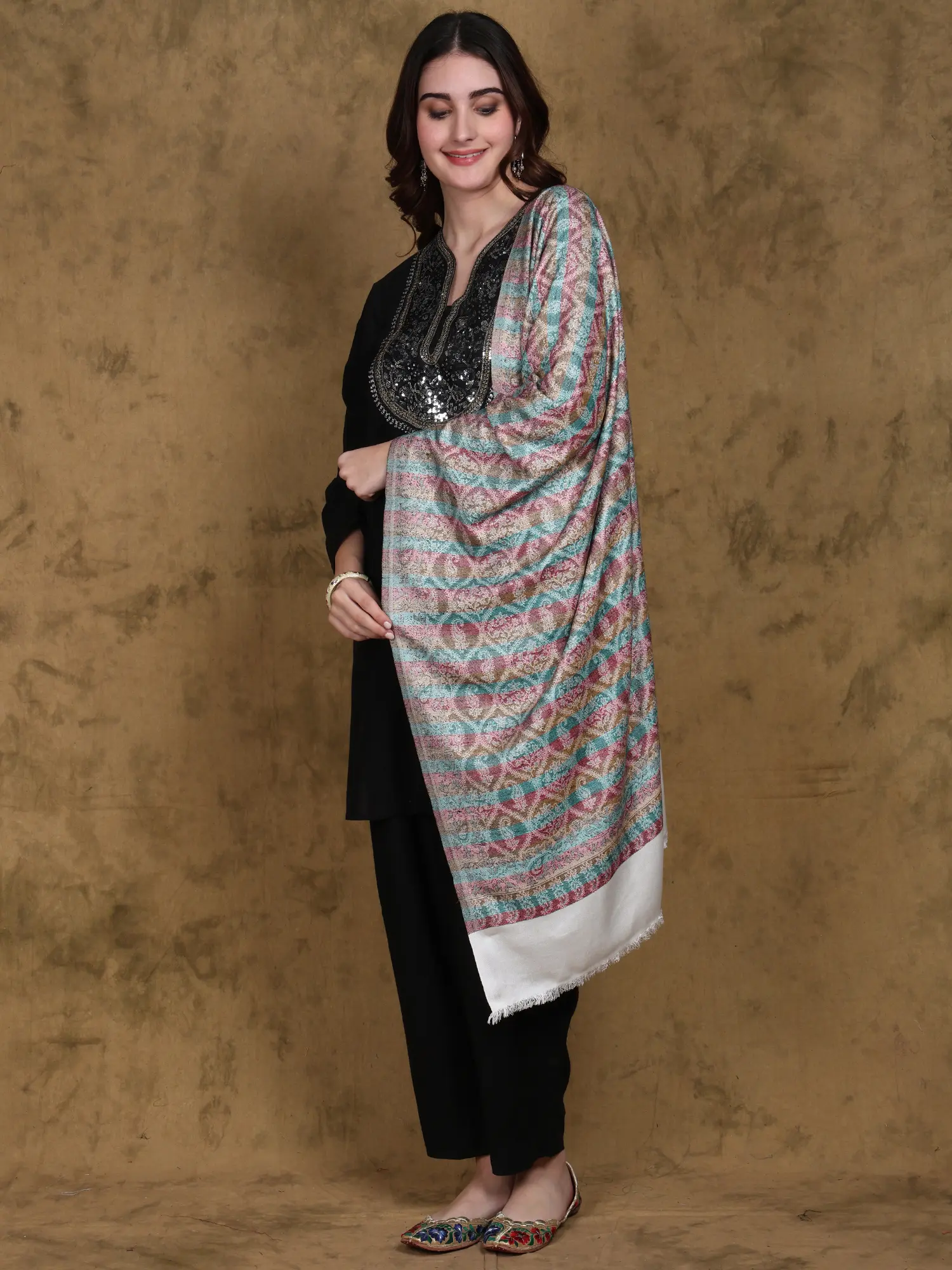 Reversible Jamawar Stole from Punjab with Woven Flowers and Paisleys