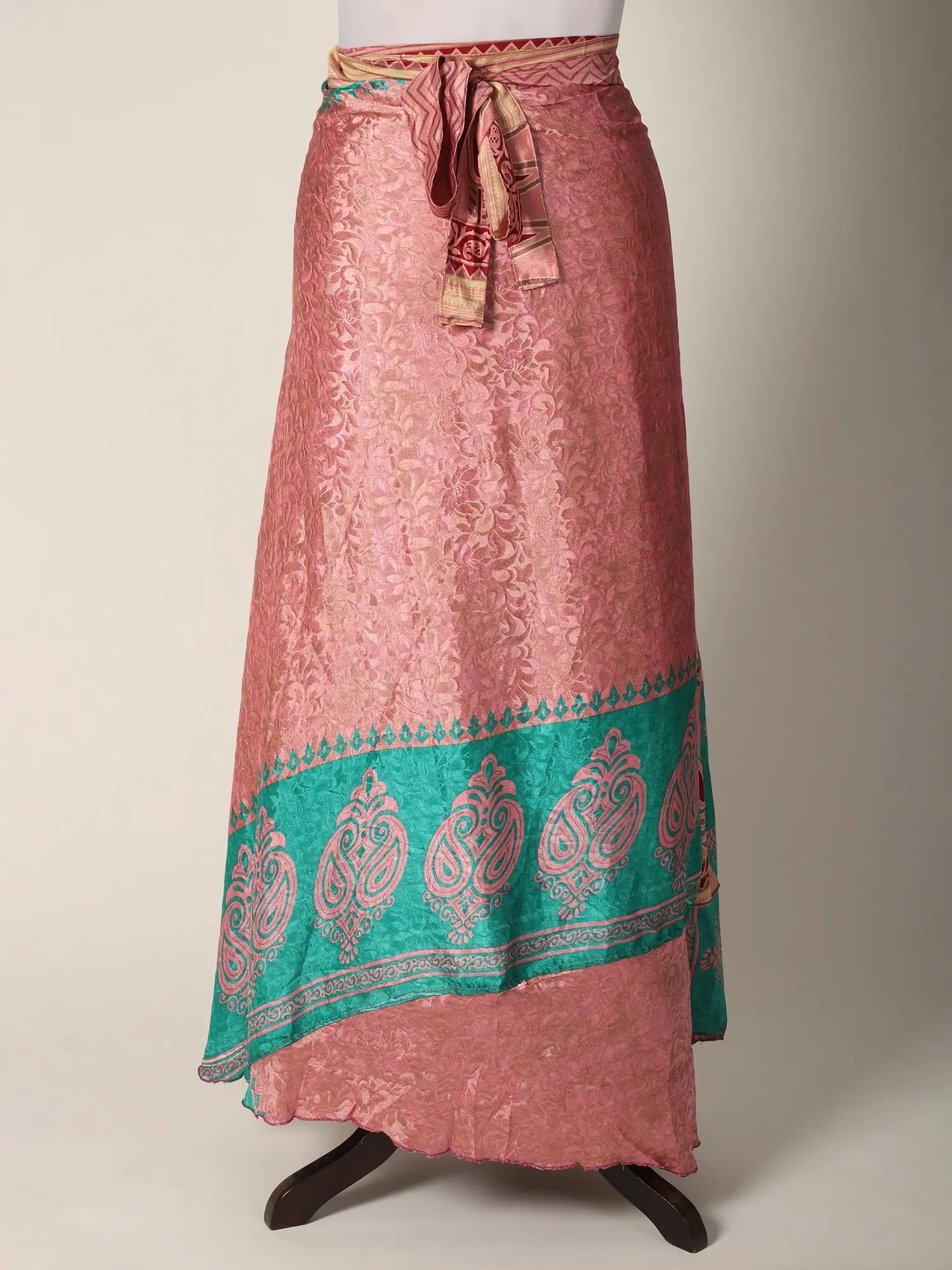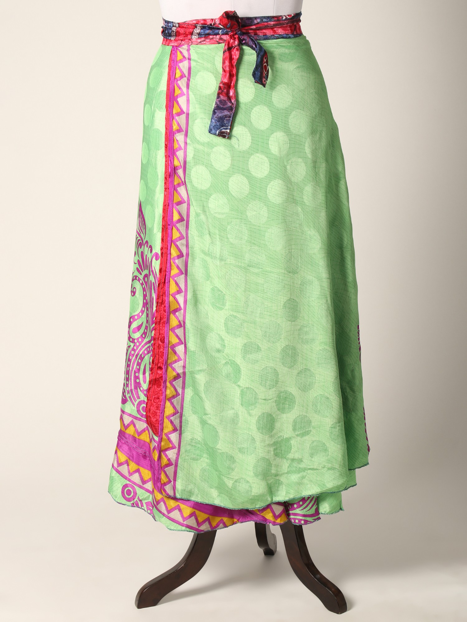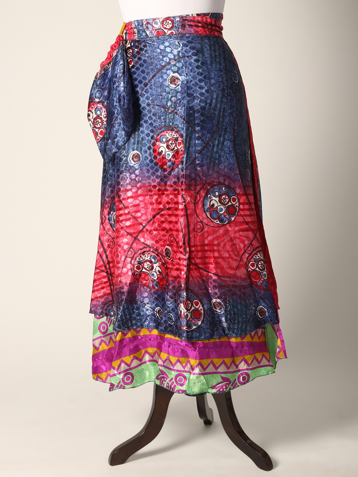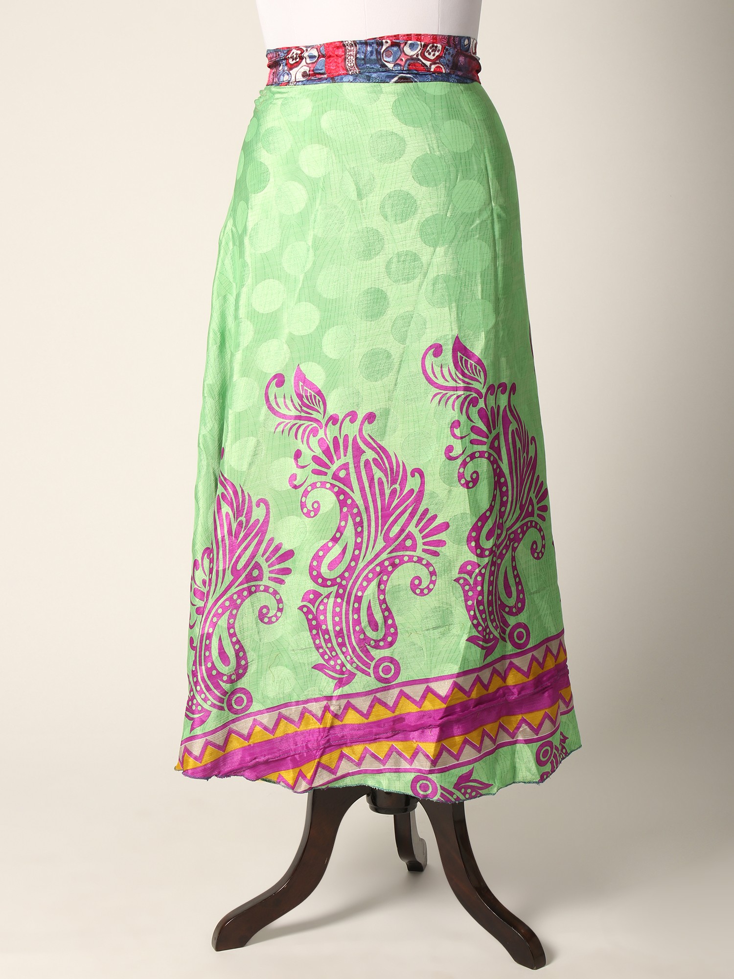 This Reversible Wrap Around Silk Printed Skirt seamlessly combines fashion and comfort in a delightful ensemble. The skirt carries the luxury of silk and offers a sumptuous feel against the skin while showcasing vibrant prints on both sides, allowing versatile styling. The wrap-around design ensures a customized fit, enhancing comfort and ease of movement.