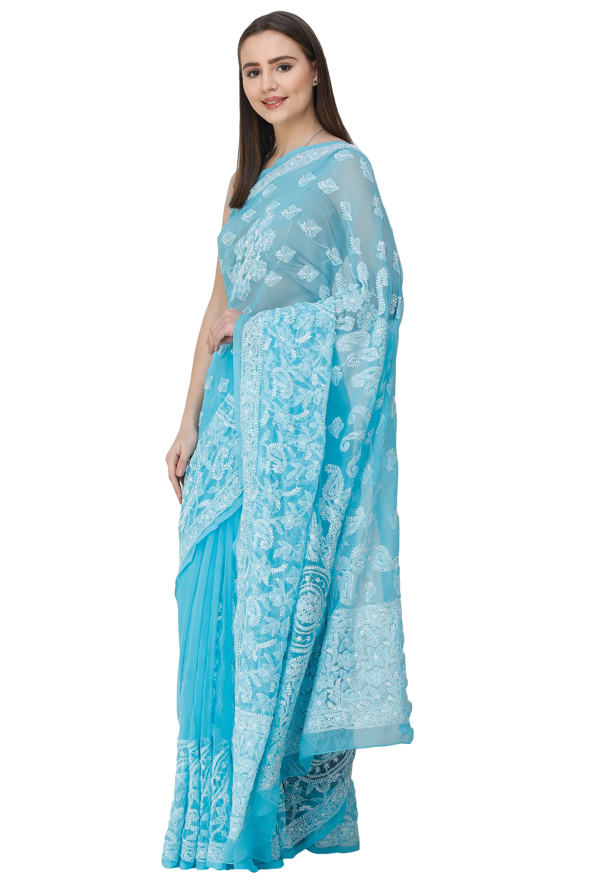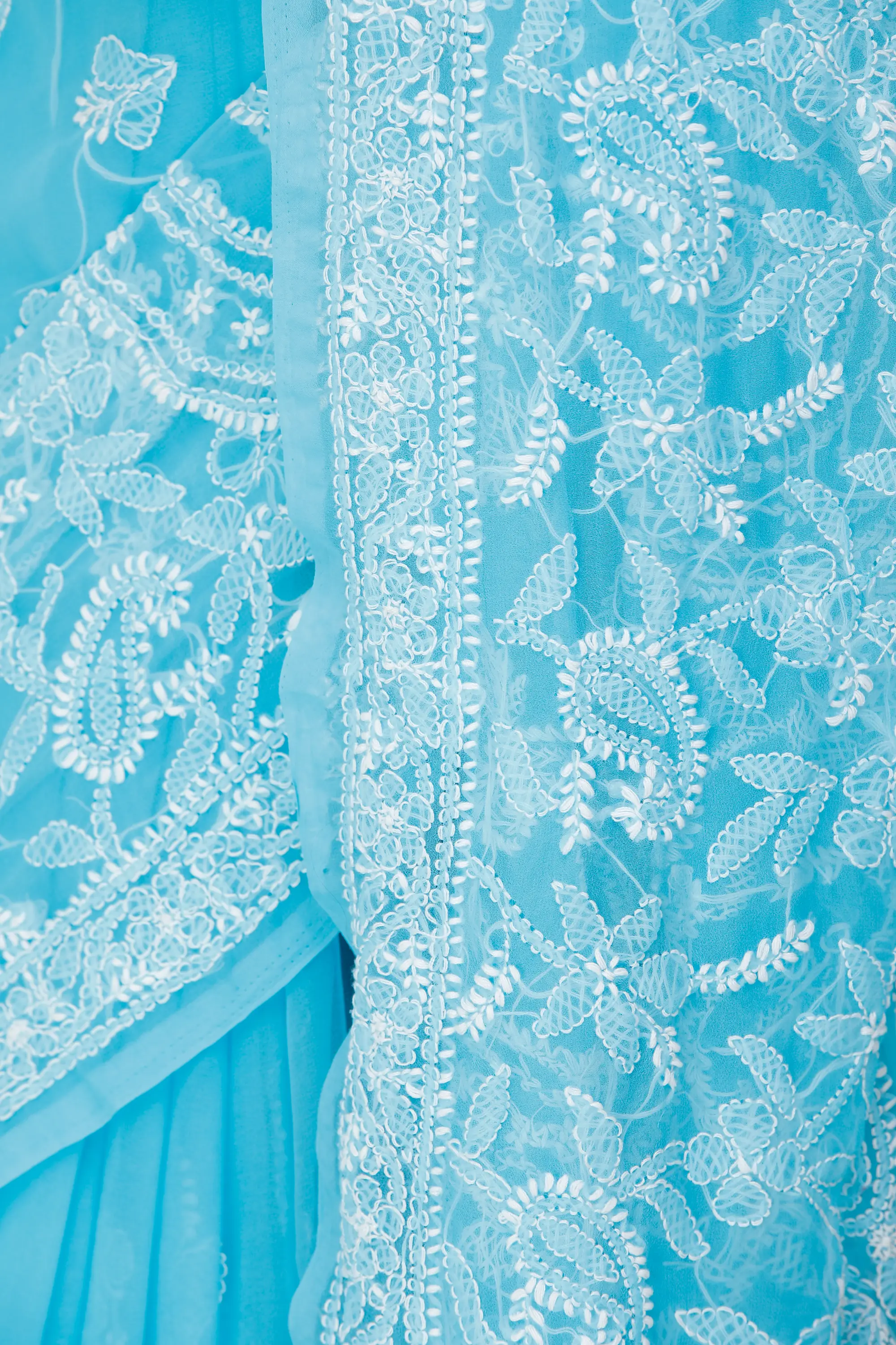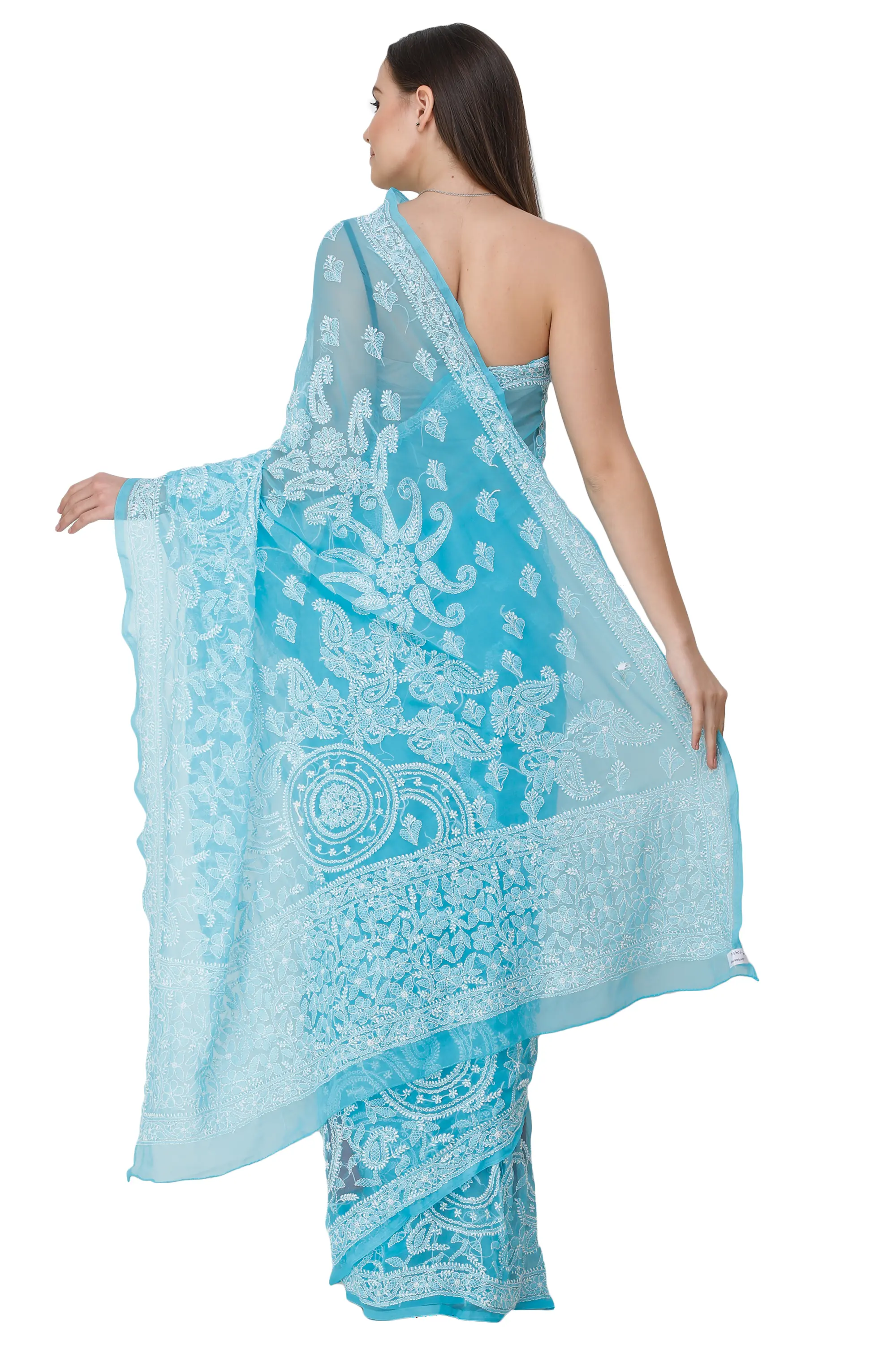 Being one of the most technically refined embroideries, Chikankari was introduced by Nur Jehan(Wife of Mughal emperor, Jahangir) at a time when no piece of textile was able to survive in the race in the long run. Like a deep blue ocean with mollusks becoming a shell, this magnificent blue sari from Lucknow with white chikankari hand-embroidery on it will get your eyes glued to this heavenly attire. The paisleys designed in a circular motion with floral in-between act as a perfect end piece for the sari’s pallu.