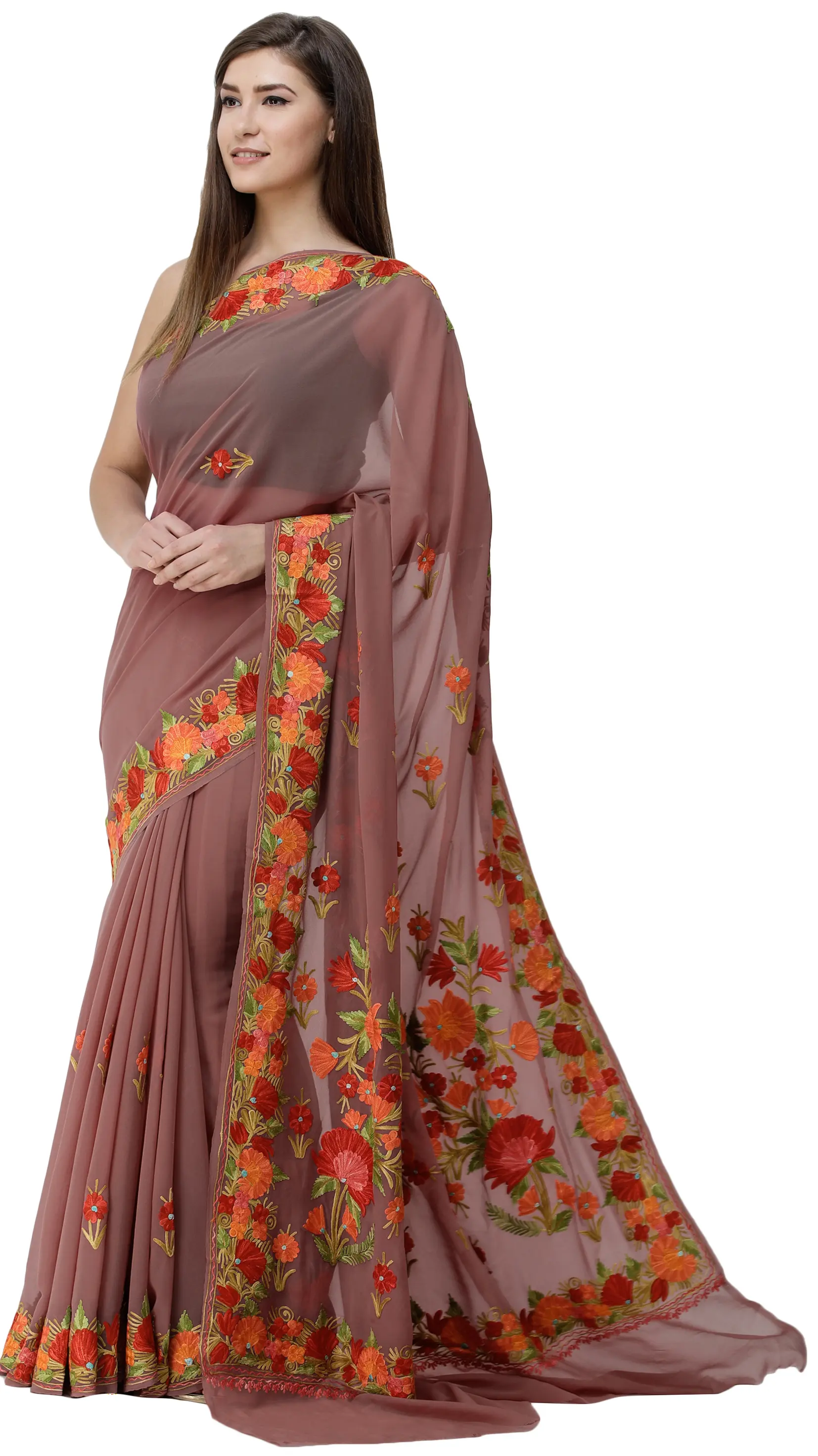 Immerse yourself in the exquisite artistry of Kashmir with this breathtaking Roan-Rouge Georgette Saree. This garment is more than just a saree; it's a wearable masterpiece, a testament to the rich heritage of Aari embroidery, a traditional craft passed down through generations in the picturesque valleys of Kashmir. The soft, flowing georgette fabric provides a luxurious canvas for the intricate hand embroidery that adorns this piece, creating a symphony of color and texture that is simply captivating.