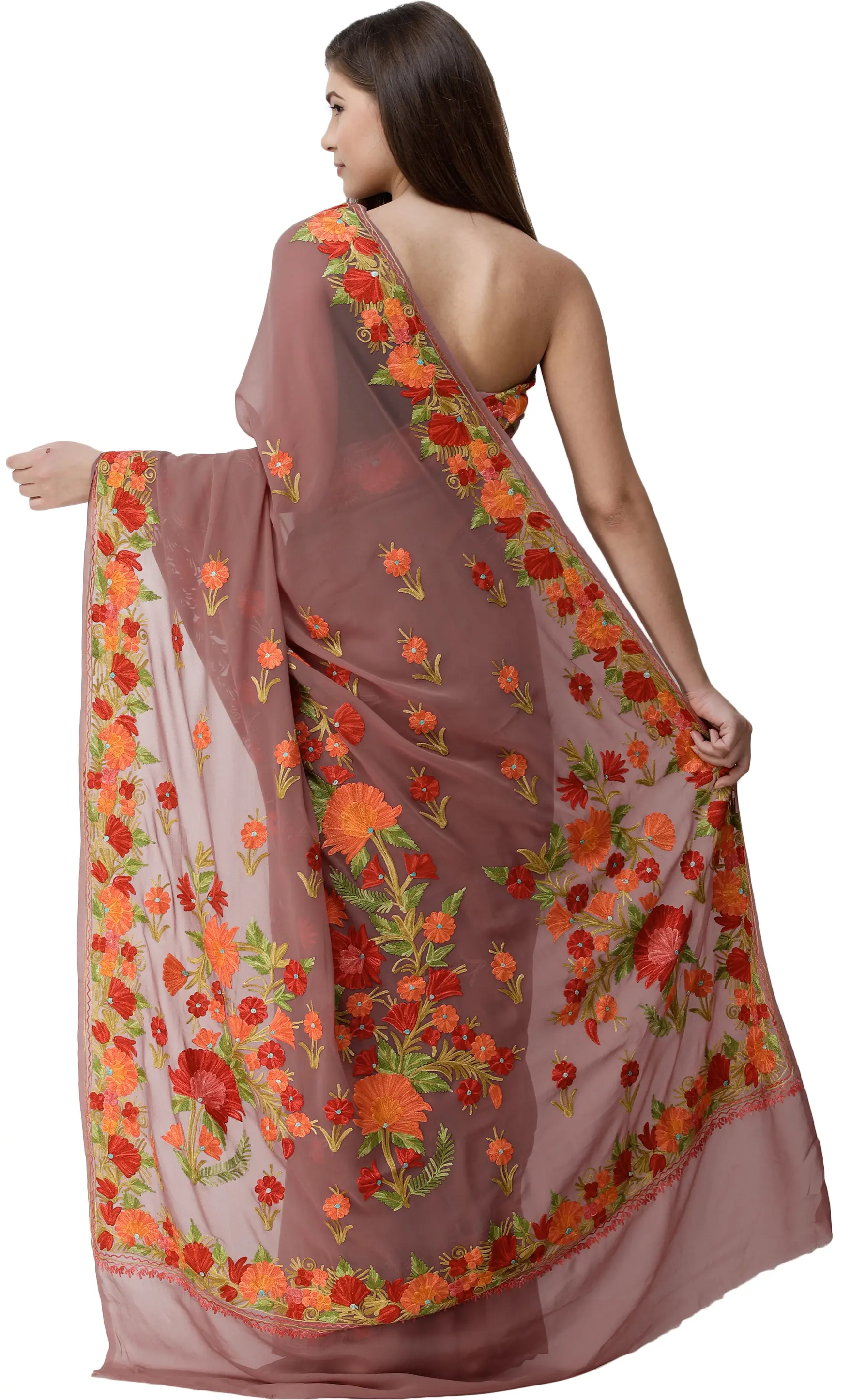 Georgette Saree with Chain Stitch Aari Embroidered Floral Border from Kashmir