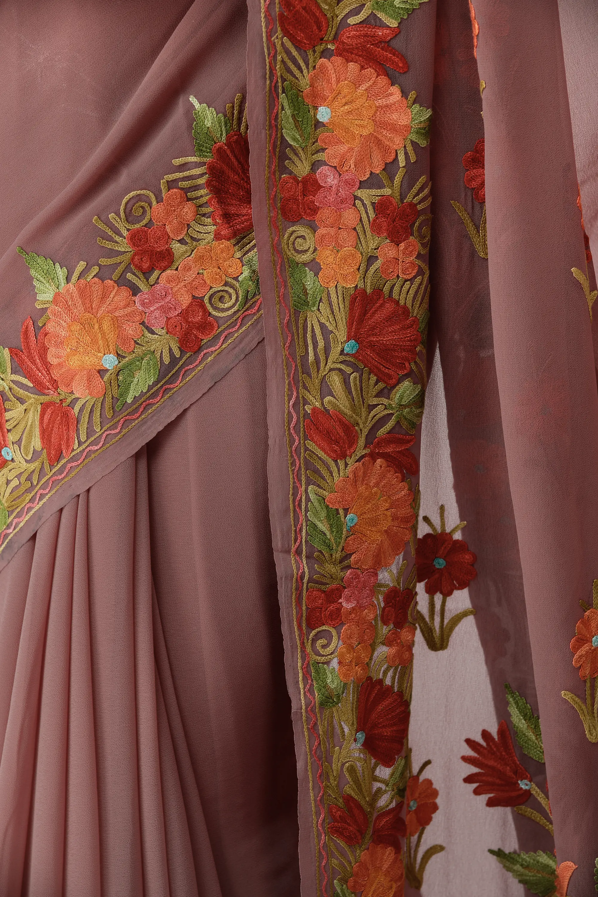Pale-Rosette Georgette Saree with Paisleys Aari Embroidery on Border and Pallu from Kashmir