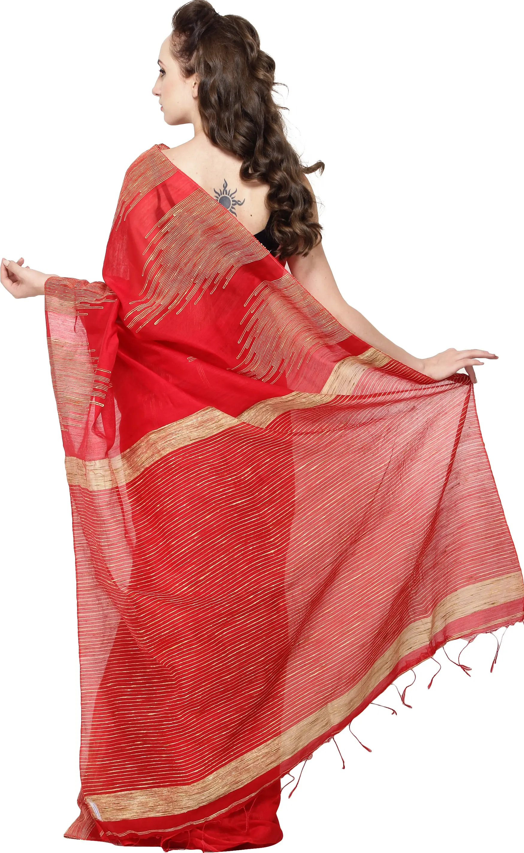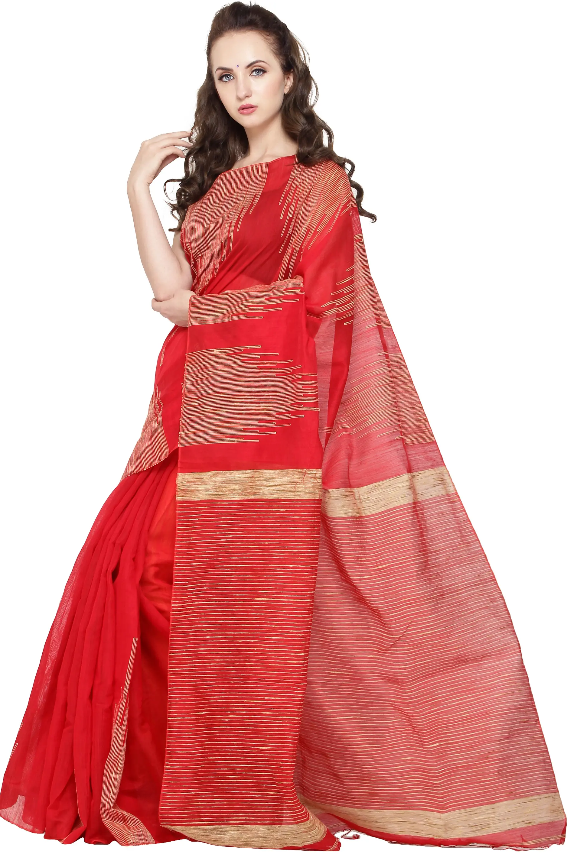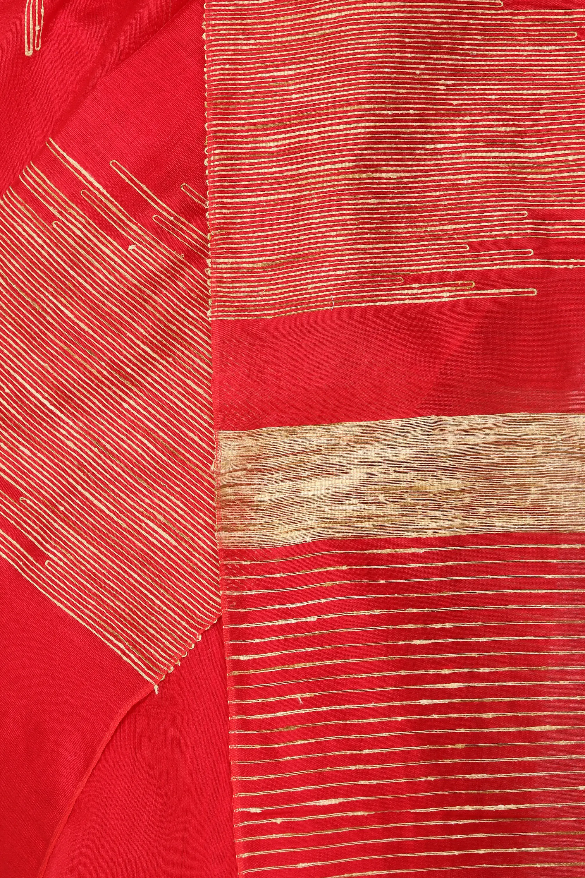 Khadi cotton is renowned for its breathability and natural texture, making this sari an ideal choice for various climates and events. It's lightweight and soft, ensuring comfort throughout the day while maintaining a graceful silhouette. Whether you're attending a festive celebration, a formal gathering, or a casual get-together, this sari promises to make you feel both elegant and at ease. The vibrant red color is universally flattering and exudes confidence and charm.