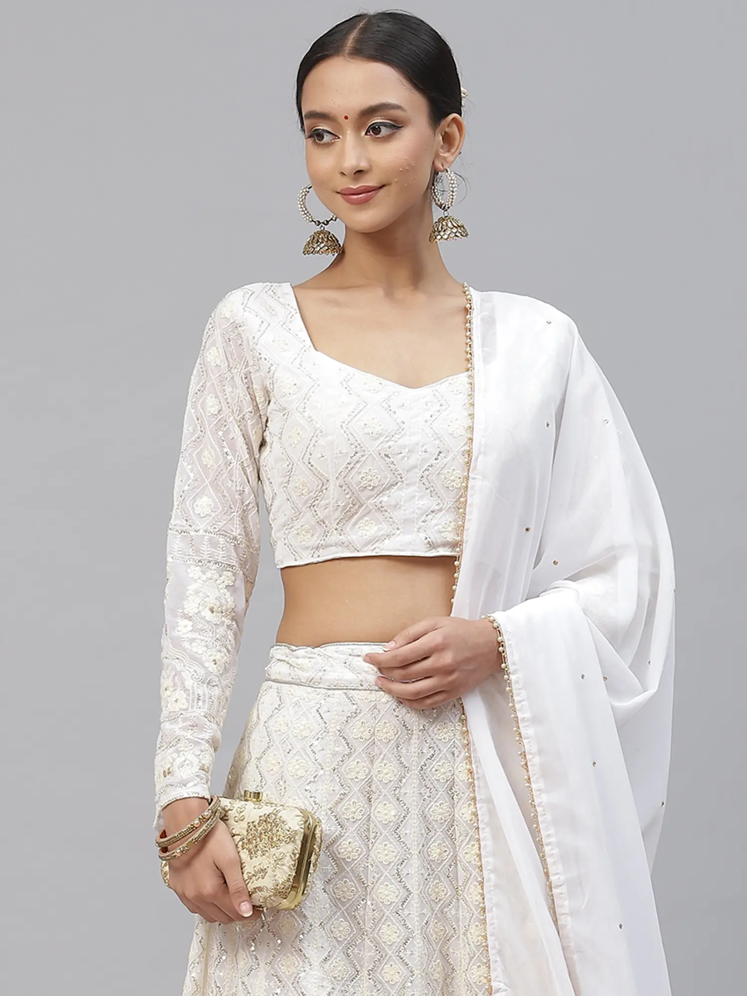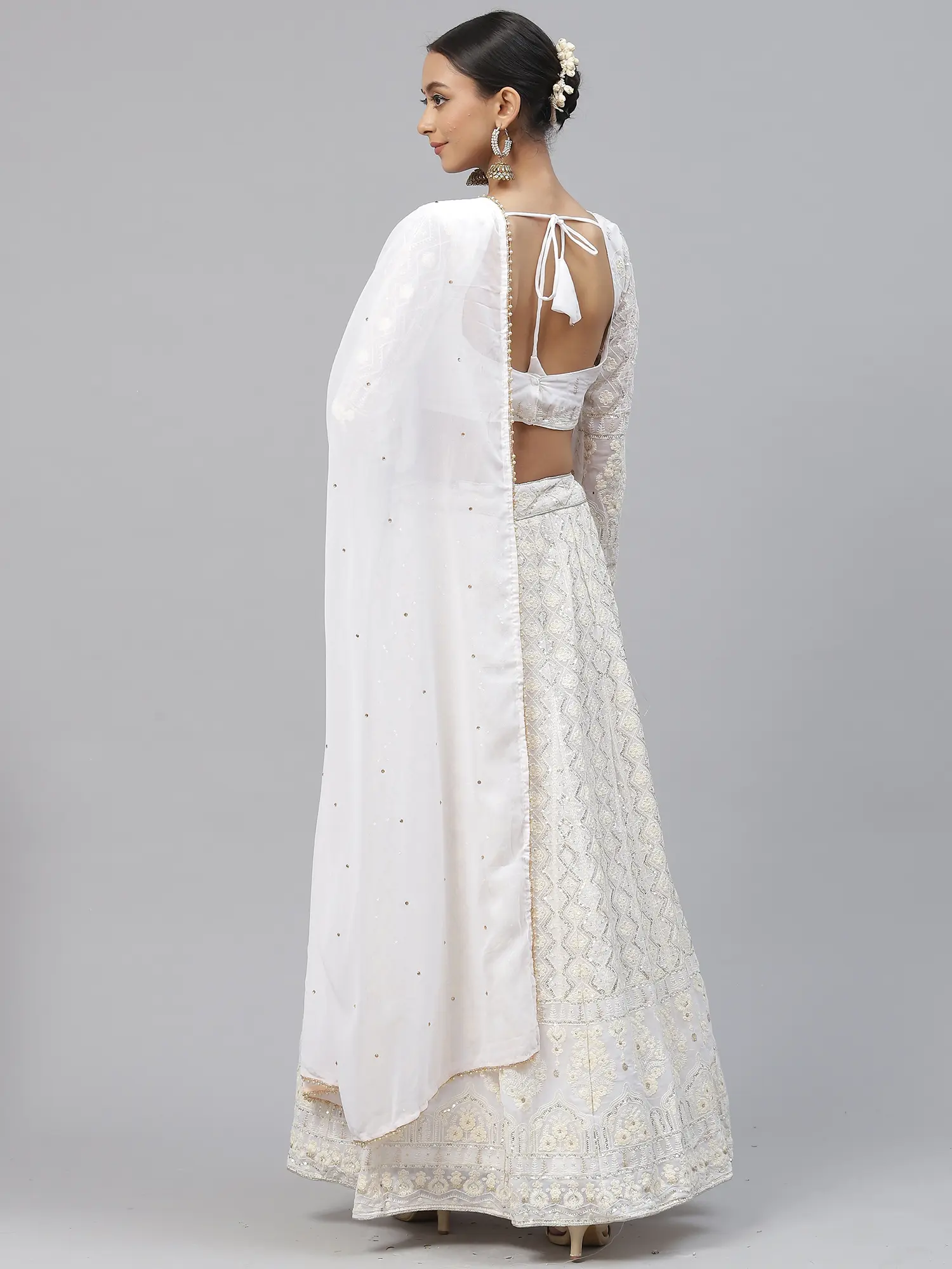 To complete this stunning bridal ensemble, a flowing dupatta crafted from lightweight faux georgette is included. The dupatta, in a pristine white shade, mirrors the delicate embroidery seen on the lehenga and choli, creating a harmonious and cohesive look. Scattered sequins or subtle embellishments are thoughtfully placed across the dupatta, adding a touch of sparkle as it moves with you. The edges are finished with a fine border, echoing the detailing of the lehenga and choli. This dupatta is designed to be draped elegantly, adding a final layer of grace and sophistication to your bridal or festive attire. This ensemble is a testament to traditional craftsmanship, reimagined for the modern bride seeking unparalleled elegance and a truly memorable look for her special day.