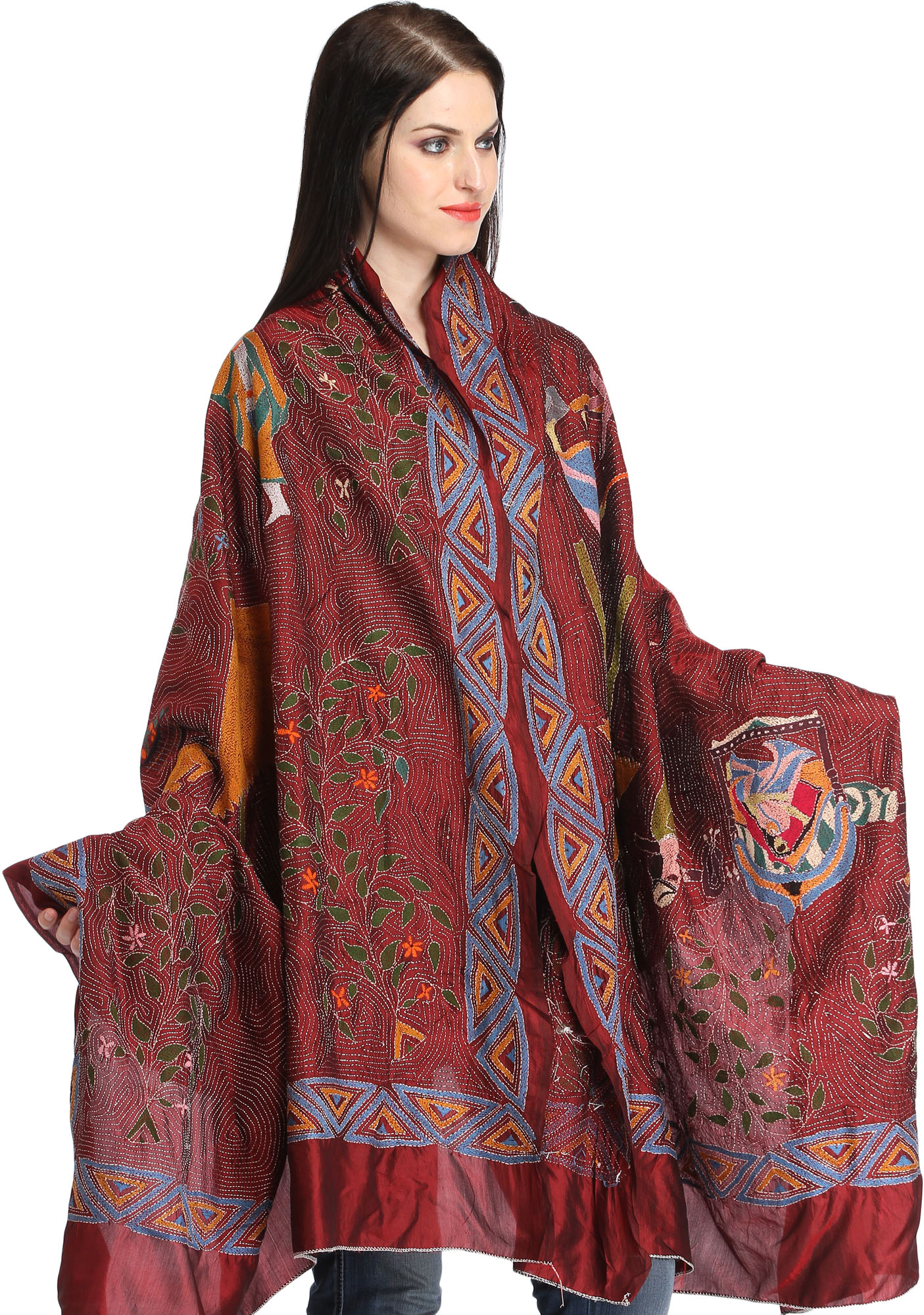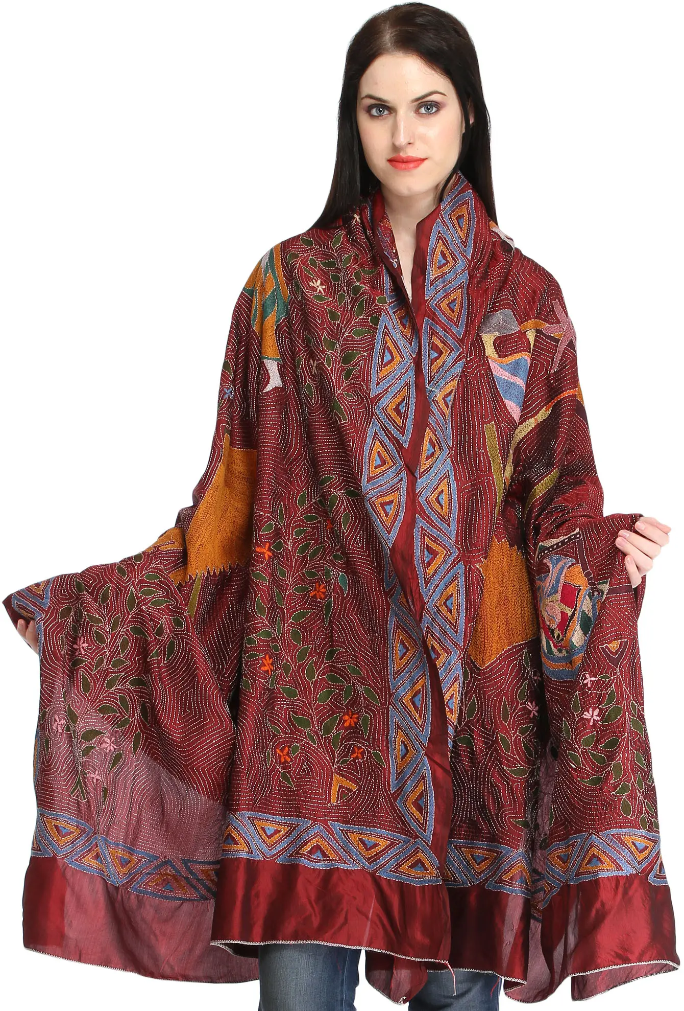 Immerse yourself in the rich cultural heritage of Kolkata with this exquisite pure silk dupatta, a true testament to the art of Kantha embroidery. Each stitch tells a story, meticulously crafted by skilled artisans to bring to life vibrant folk motifs that dance across the deep rosewood silk. This is more than just an accessory; it's a wearable piece of art, imbued with the soul of traditional Indian craftsmanship.