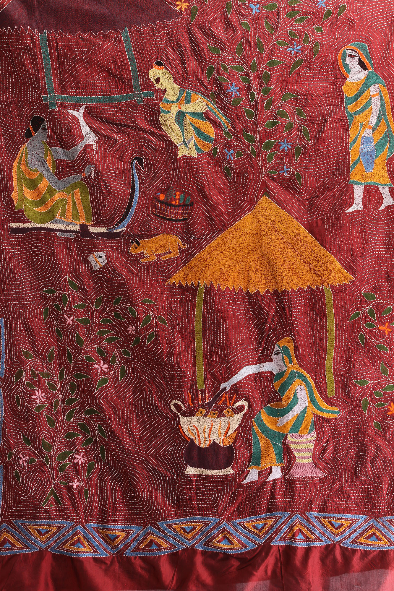 The canvas of this stunning dupatta is a luxurious pure silk, offering a soft drape and a subtle sheen that enhances the intricate hand-embroidery. The Kantha technique, characterized by its running stitches, creates a unique texture and depth, giving the folk motifs a tactile presence. The central panel is a narrative tableau, featuring stylized figures engaged in what appears to be a communal activity, perhaps tending to a garden or sharing a moment of daily life. These figures are rendered in a palette of earthy tones and bright accents, standing out against the deep, warm background. The embroidery is dense and precise, forming patterns that are both visually captivating and structurally sound, ensuring the longevity of this heirloom piece.