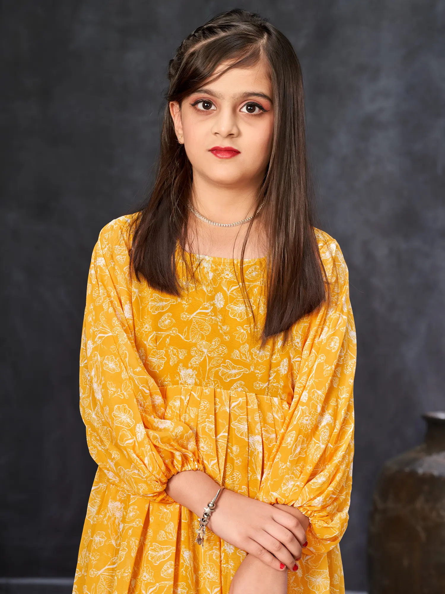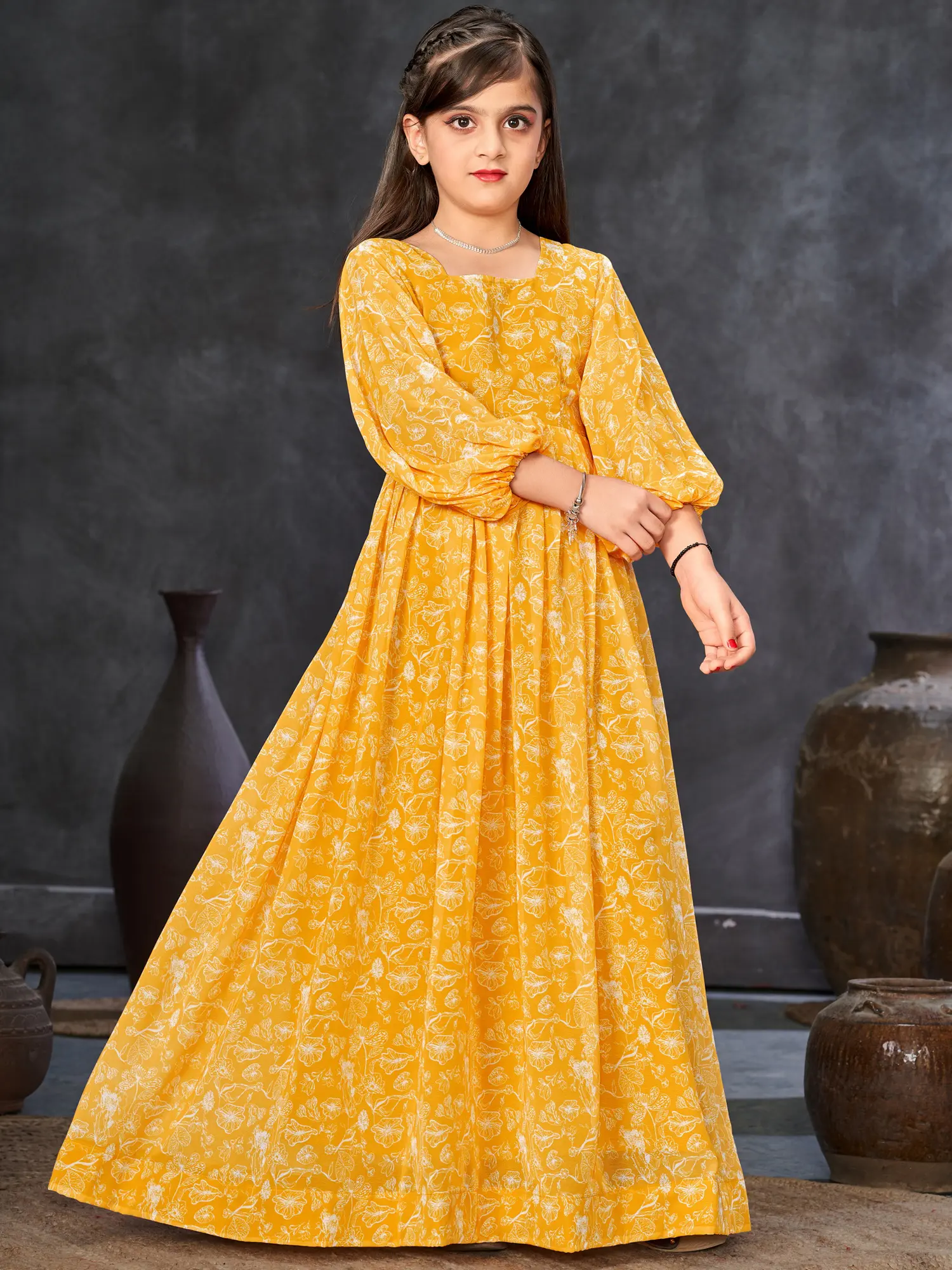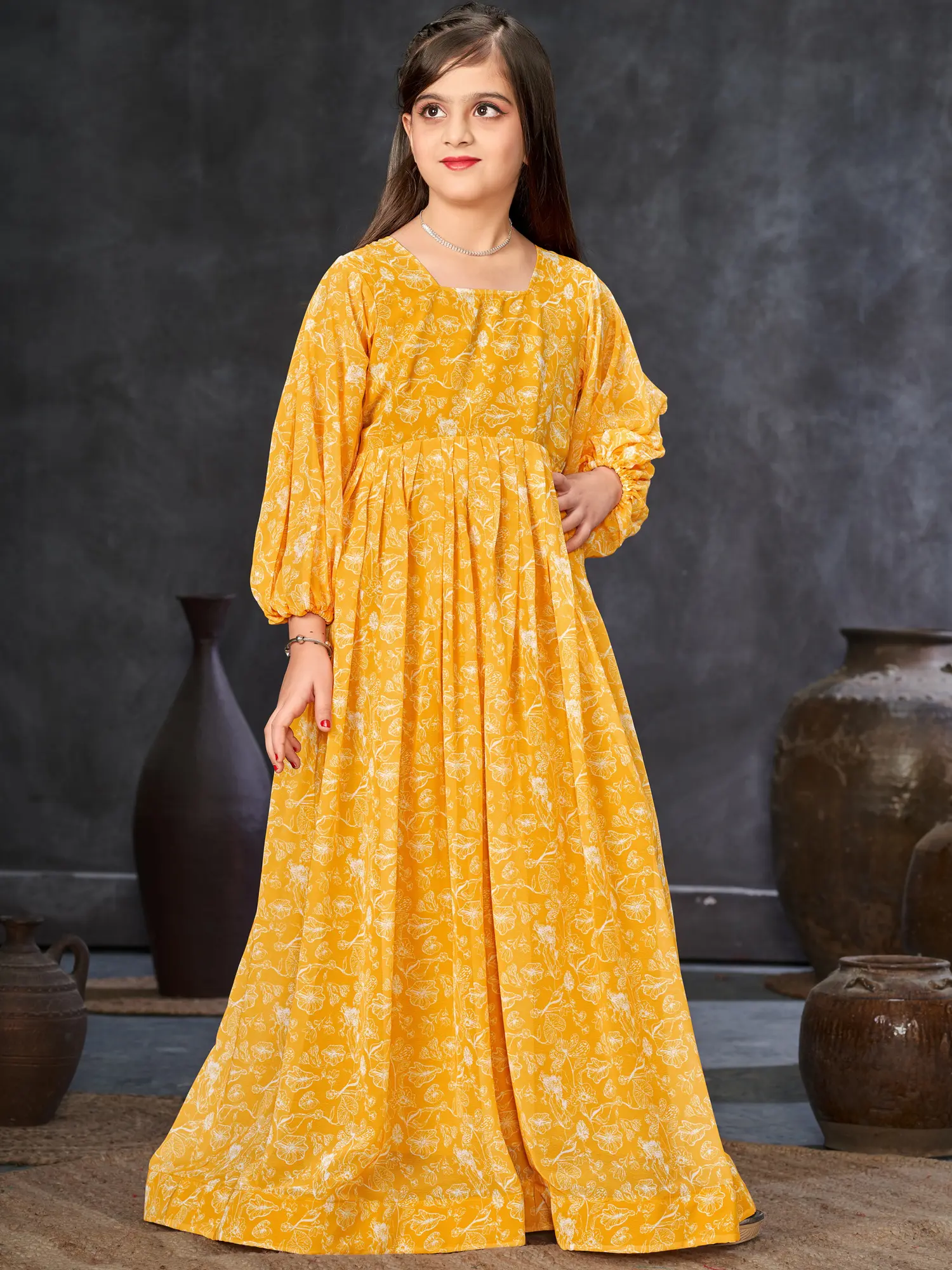 A vibrant orange color with a lovely floral print, this ethnic Indian gown for kids is a beautiful party wear. With full puffed sleeves and a square neckline, the Anarkali style gowns give a princess-like feel. The soft and flowing georgette fabric creates a comfy fit, allowing the little ones to enjoy their time while looking dotting.