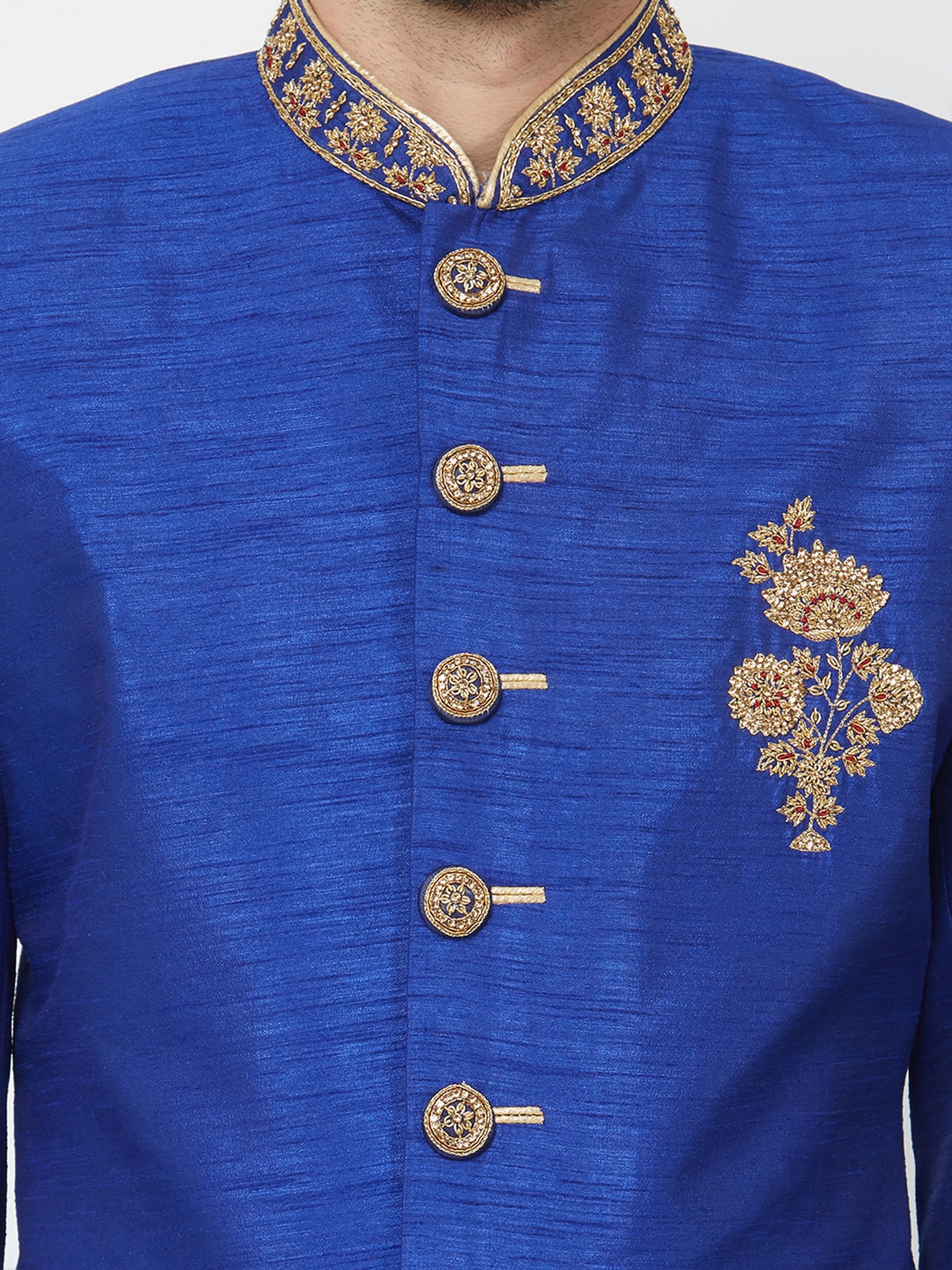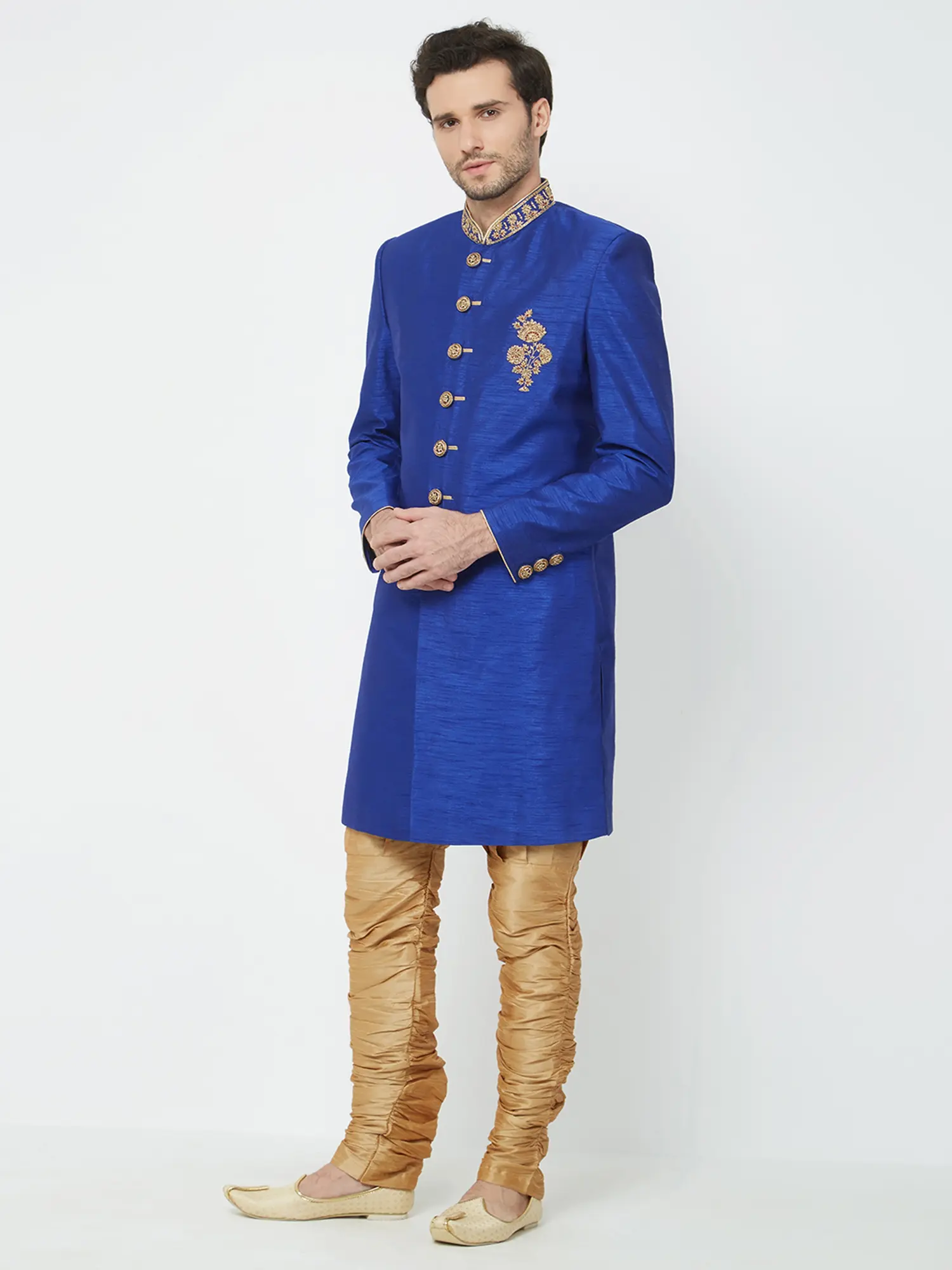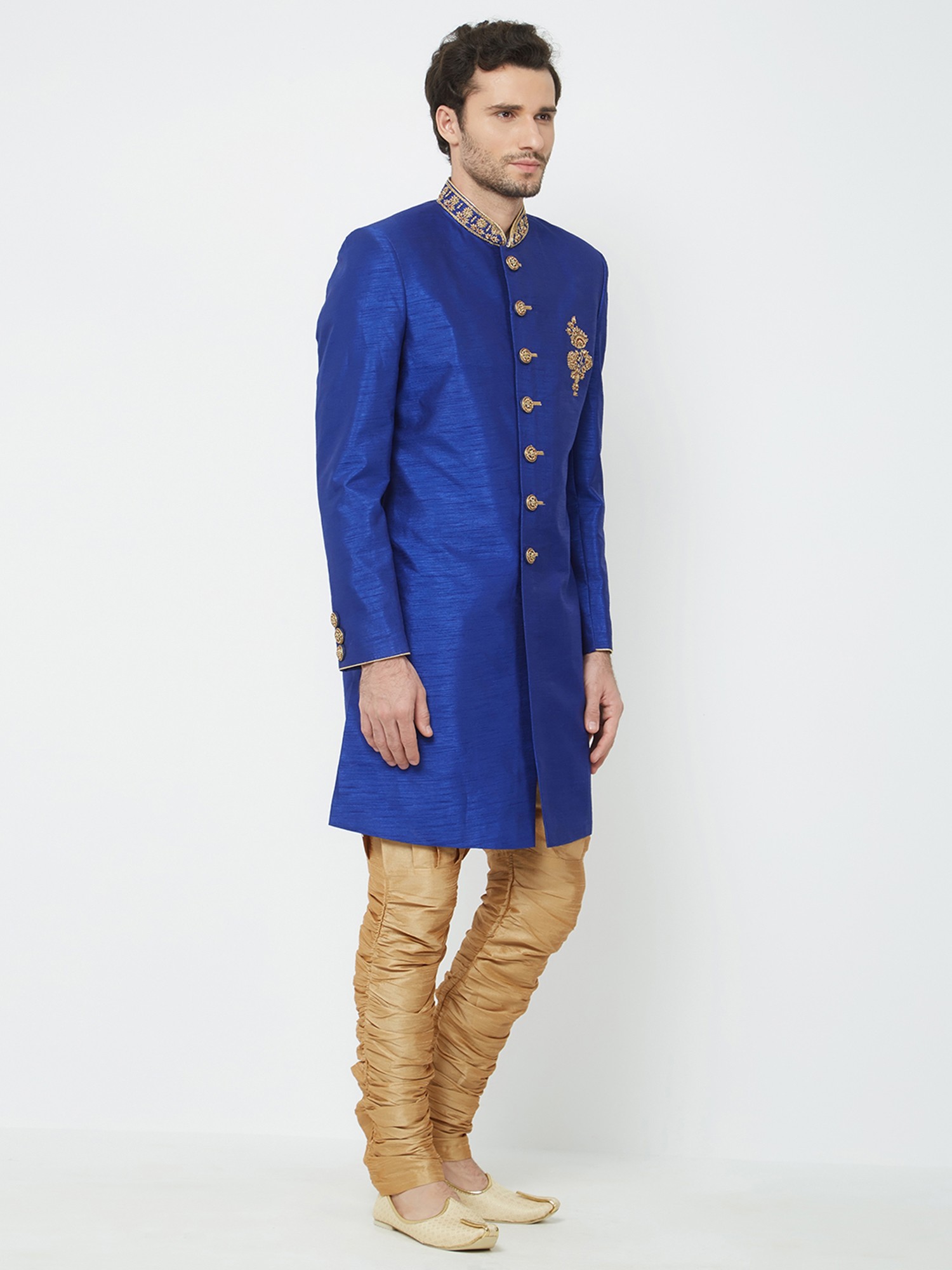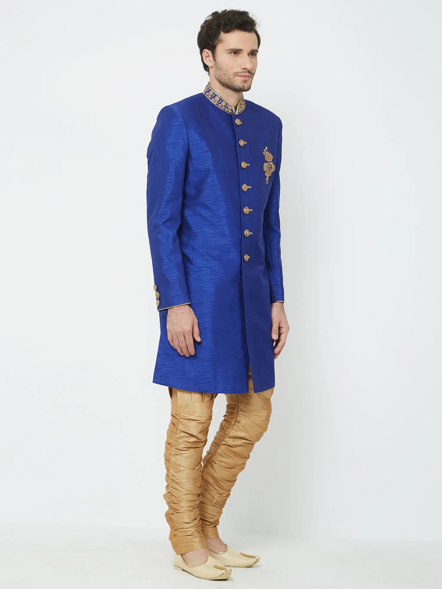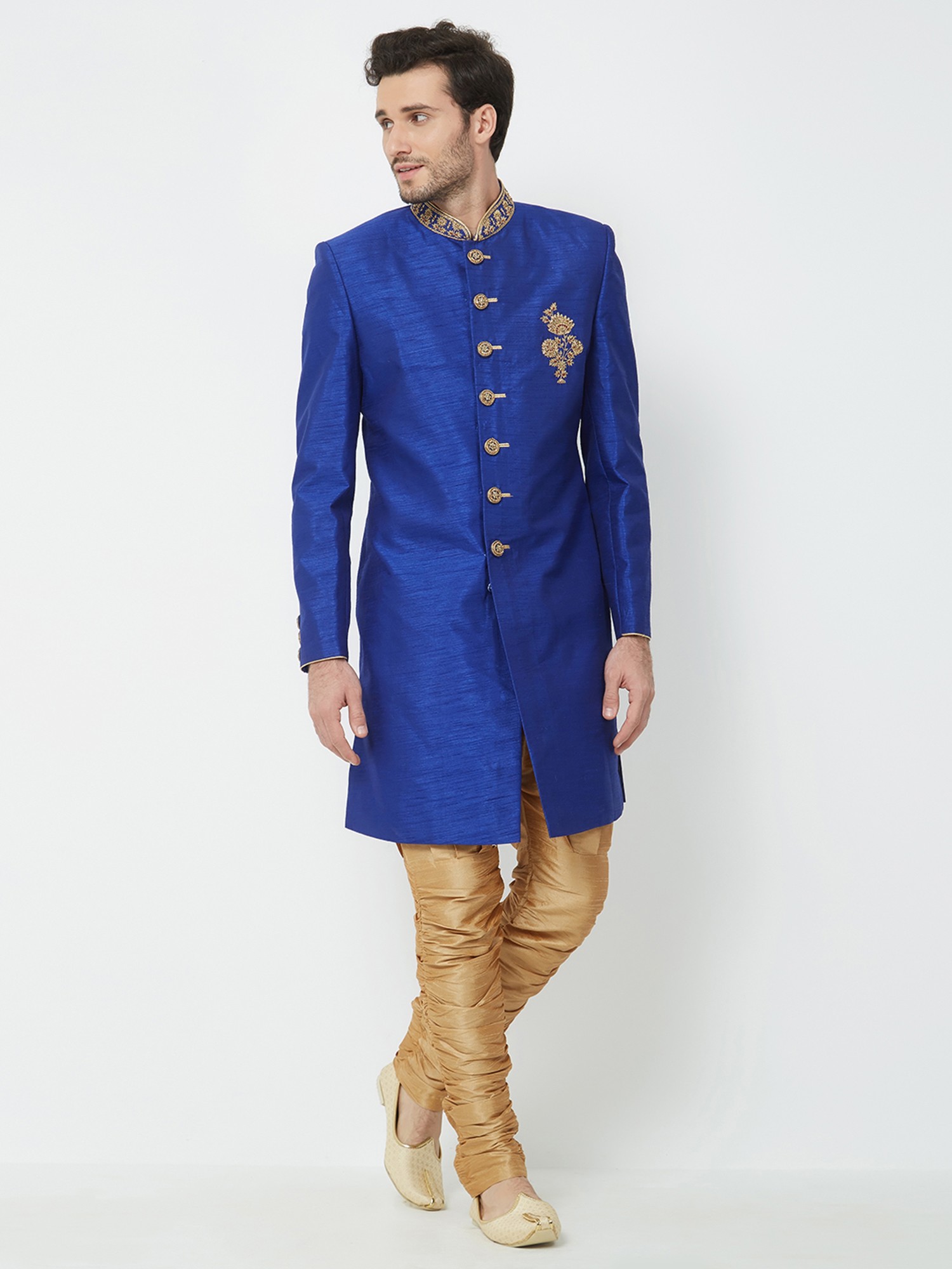 Features a vibrant royal blue silk Sherwani adorned with intricate gold embroidery on the collar and chest.