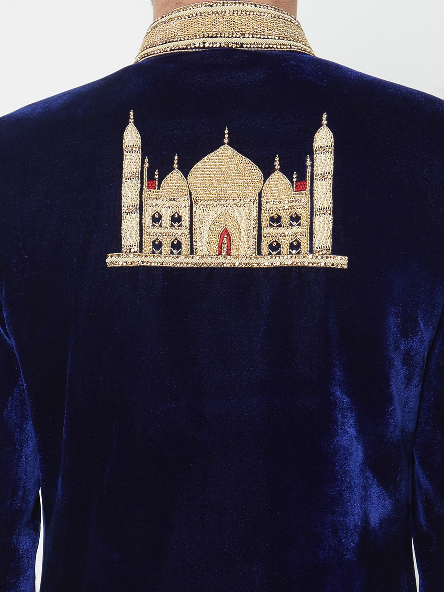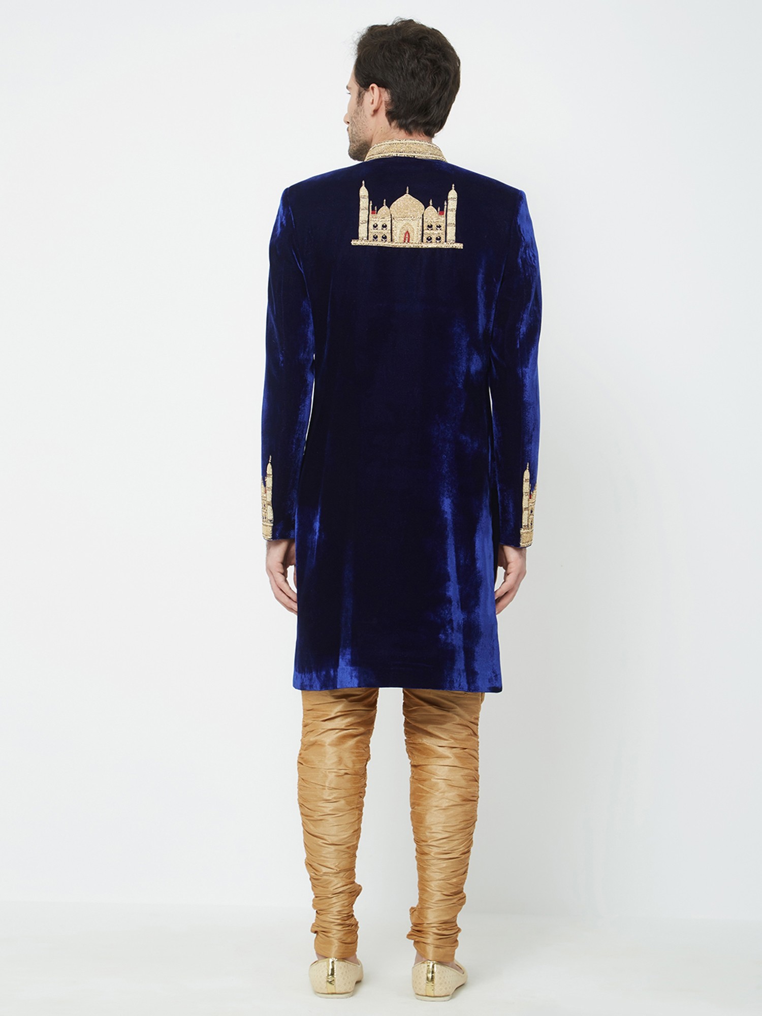 Adorned with intricate gold embroidery depicting architectural marvels on cuffs and hem.