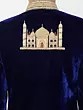 The rich, deep hue of the velvet is adorned with breathtaking gold embroidery, depicting architectural marvels that evoke a sense of grandeur and history. The cuffs are intricately embellished, drawing the eye with their detailed patterns, while the hem is graced with a majestic façade of ornate buildings. Complementing this is a regal pocket square, accented with gold chains and tassels, adding a final touch of distinguished flair. The rich texture of the velvet art silk provides a sumptuously smooth feel against your skin.