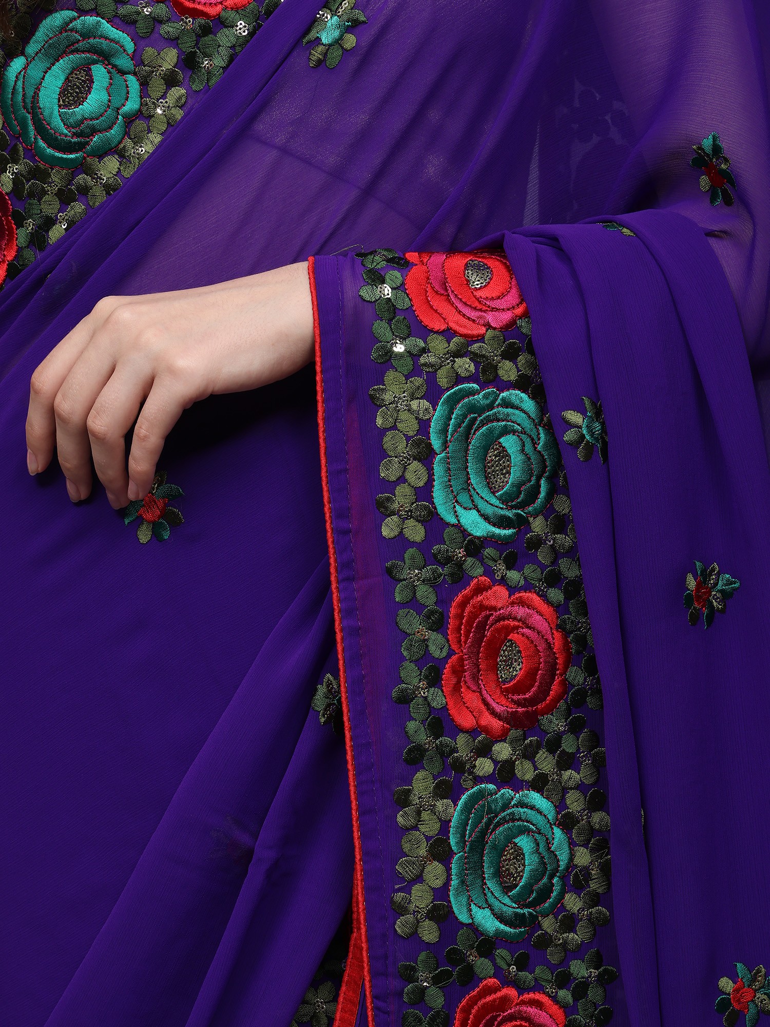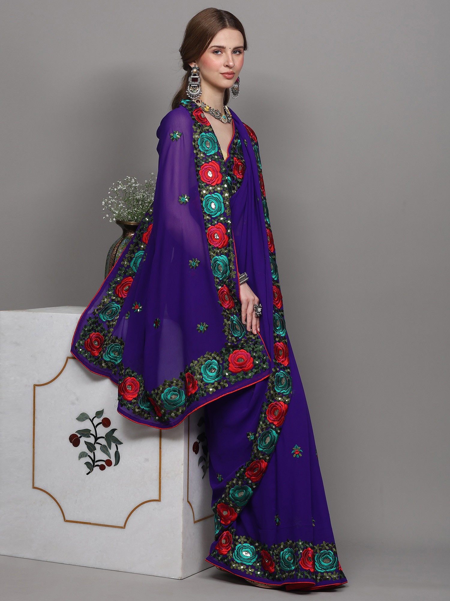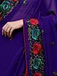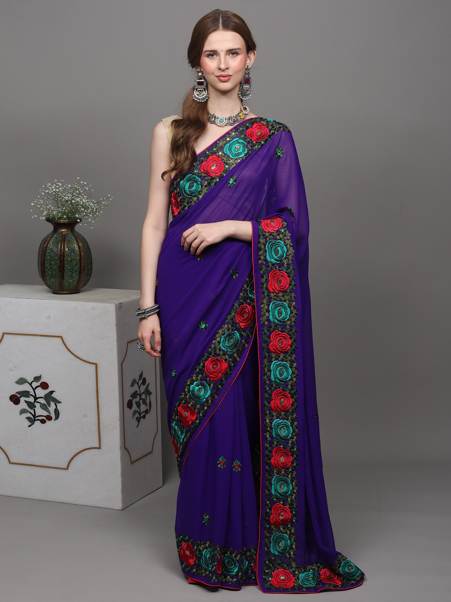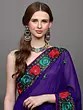 The Royal-Purple Sari with Parsi Embroidered Roses on the border is a graceful everyday wear choice. Crafted from lightweight georgette, it offers comfort and style for all occasions. The sari receives a delightful splash of colors with the large floral patterns intricately woven into its fabric. These Parsi embroidered roses add a touch of timeless charm and elegance to the drape. Whether it's a casual outing or a special day, this sari effortlessly blends fashion and tradition, creating a lovely and versatile option for all days. Embrace the beauty of this royal-purple sari and make every day a celebration of grace and sophistication.