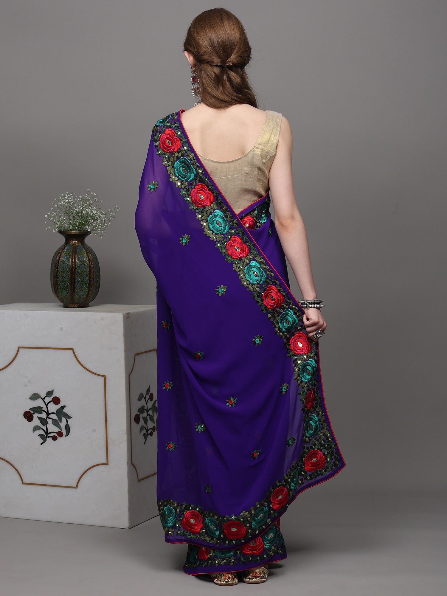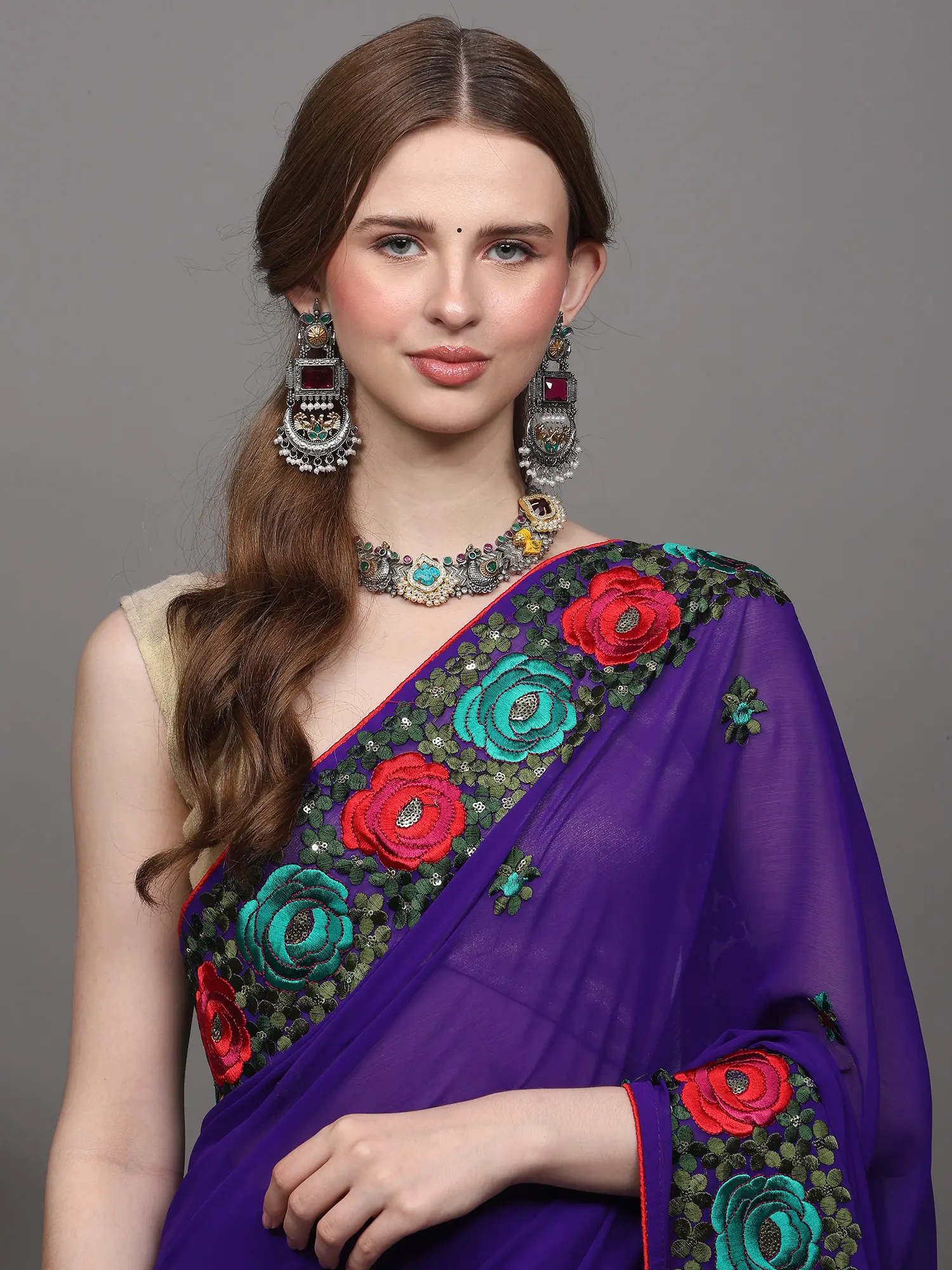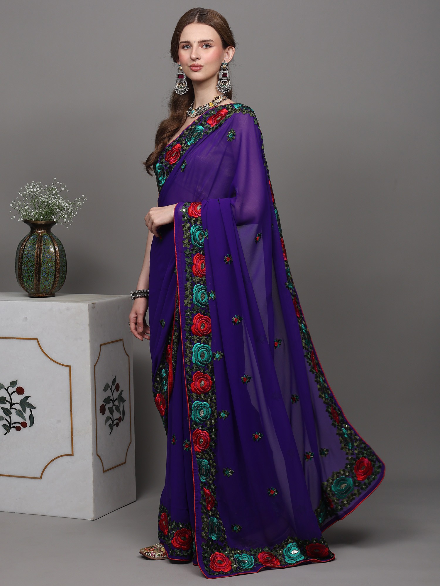 The Royal-Purple Sari with Parsi Embroidered Roses on the border is a graceful everyday wear choice. Crafted from lightweight georgette, it offers comfort and style for all occasions. The sari receives a delightful splash of colors with the large floral patterns intricately woven into its fabric. These Parsi embroidered roses add a touch of timeless charm and elegance to the drape. Whether it's a casual outing or a special day, this sari effortlessly blends fashion and tradition, creating a lovely and versatile option for all days. Embrace the beauty of this royal-purple sari and make every day a celebration of grace and sophistication.