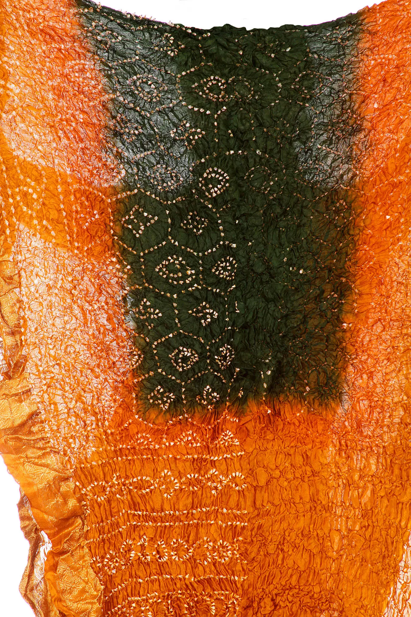 The stole is further enhanced by a striking contrast of deep, forest green, artfully integrated into the tie-dye design. This bold combination creates a visually captivating effect, adding depth and personality to the piece. The interplay between the rust and green hues, along with the characteristic crinkled texture achieved through the Bandhani process, lends the stole a sense of artisanal charm and bohemian flair. Subtle shimmering threads are woven into the silk, catching the light and adding an understated elegance, perfect for both daytime and evening wear. ––––––––––––––––––––