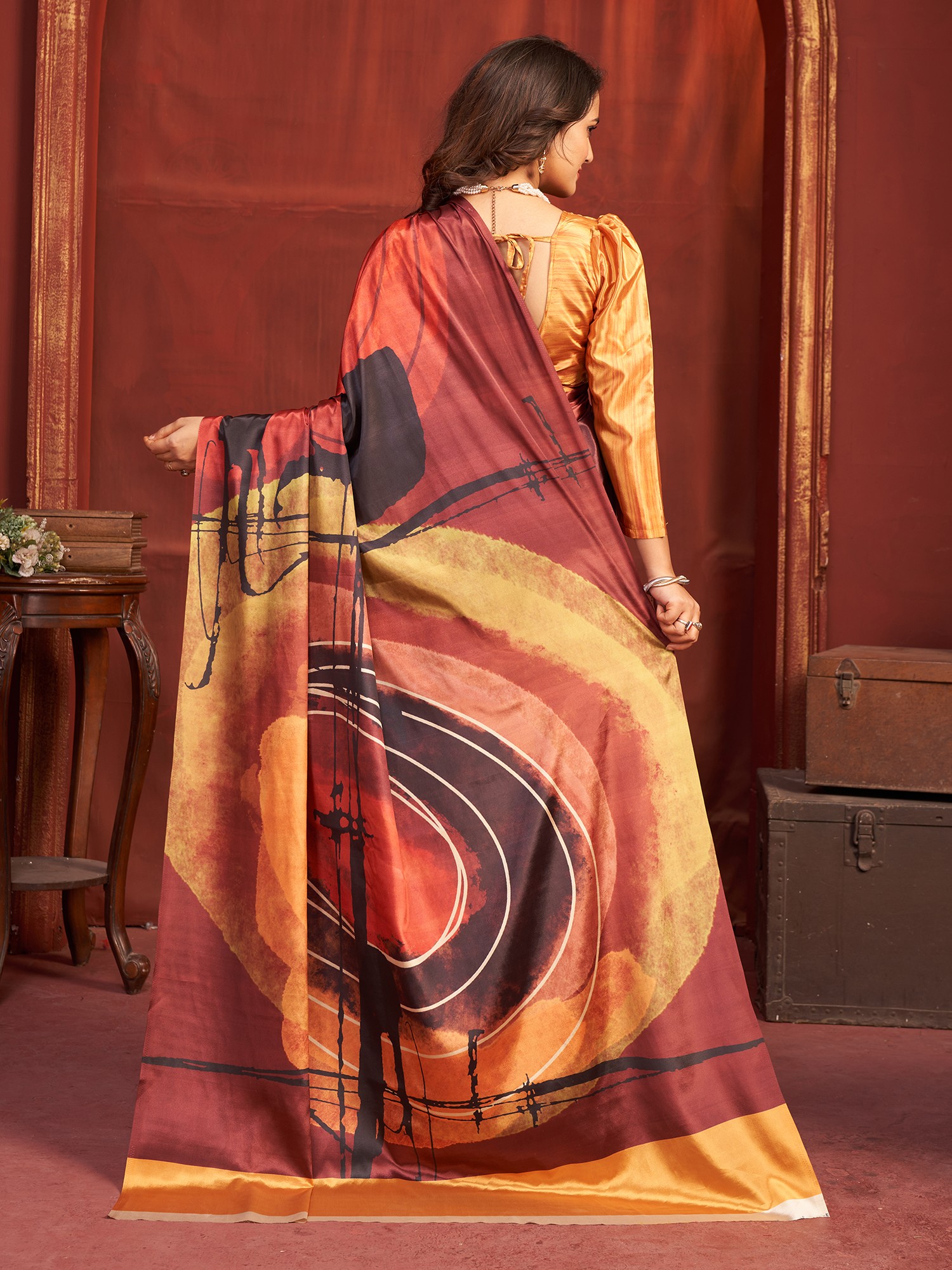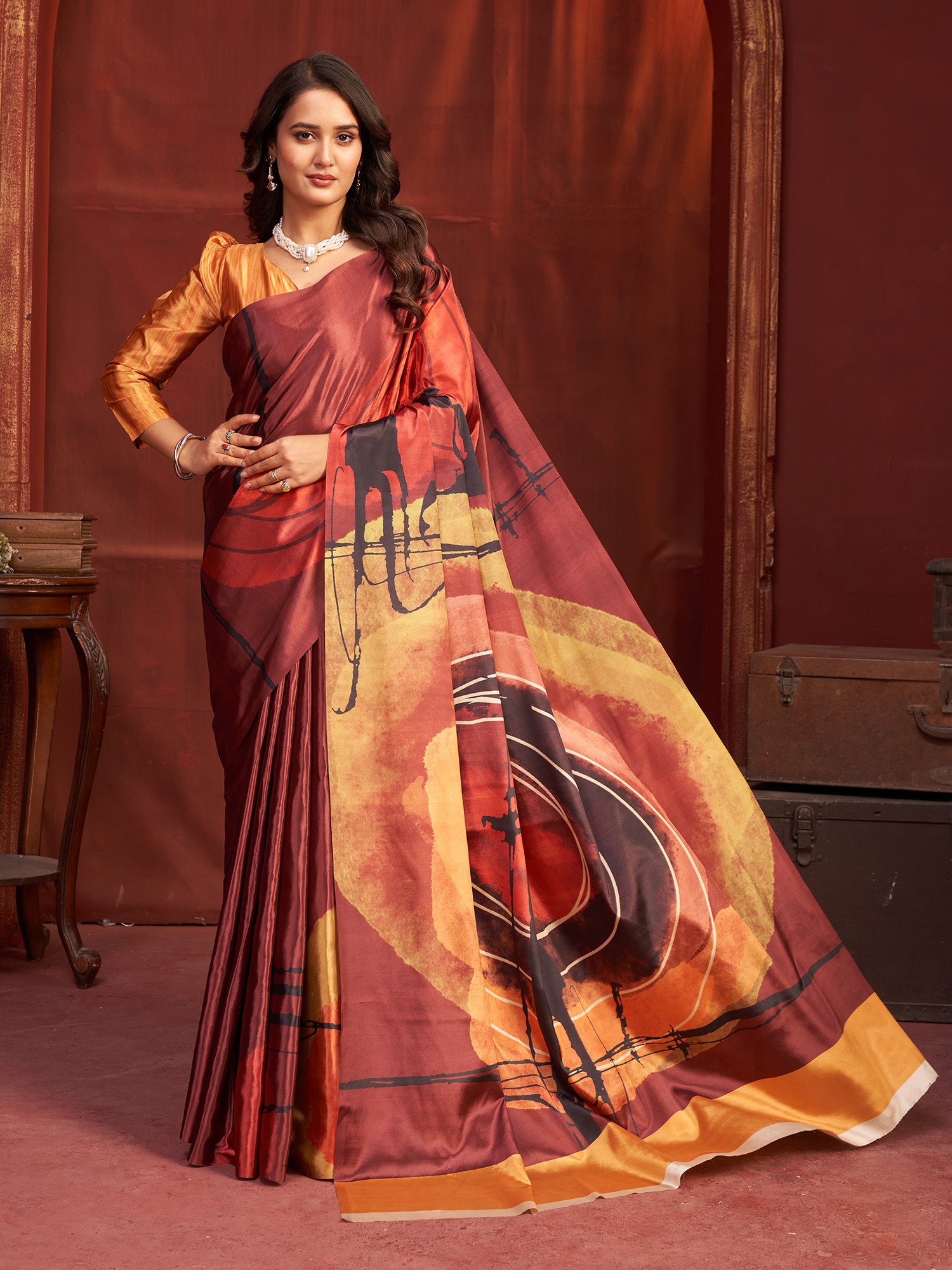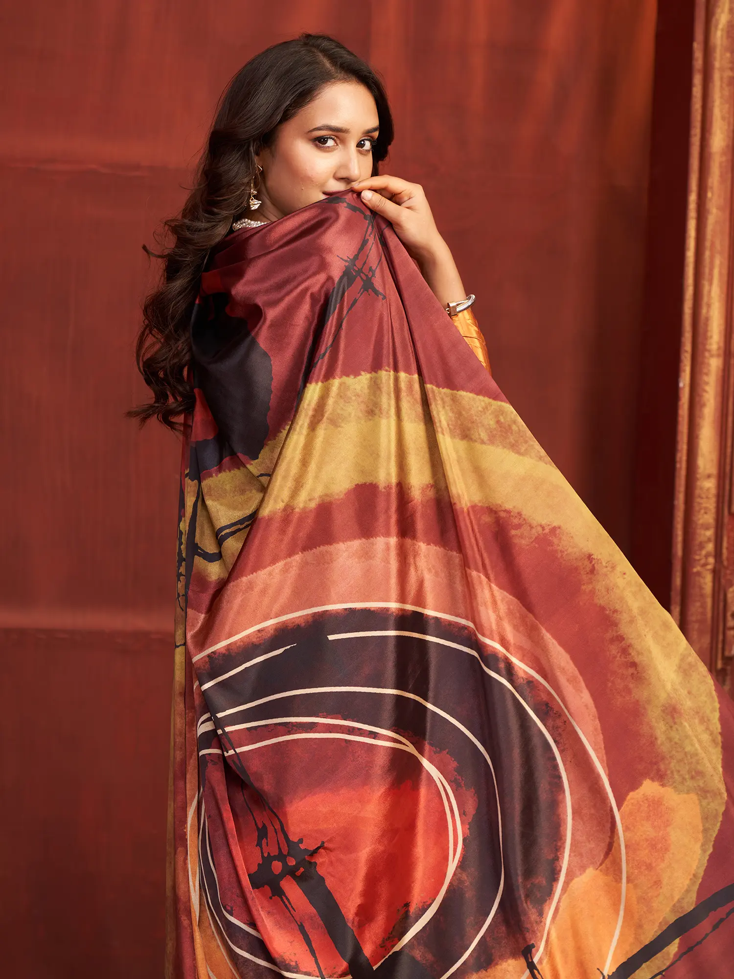 The true magic of this saree lies in its stunning, colorful designer print. Inspired by abstract art, bold brushstrokes and dynamic lines dance across the fabric in a symphony of vibrant oranges, warm yellows, deep browns, and stark black accents. This contemporary interpretation of traditional motifs ensures that you will stand out with a unique and fashionable statement. The print is not merely decorative; it is a work of art that transforms the saree into a wearable masterpiece, evoking a sense of creativity and individual flair.