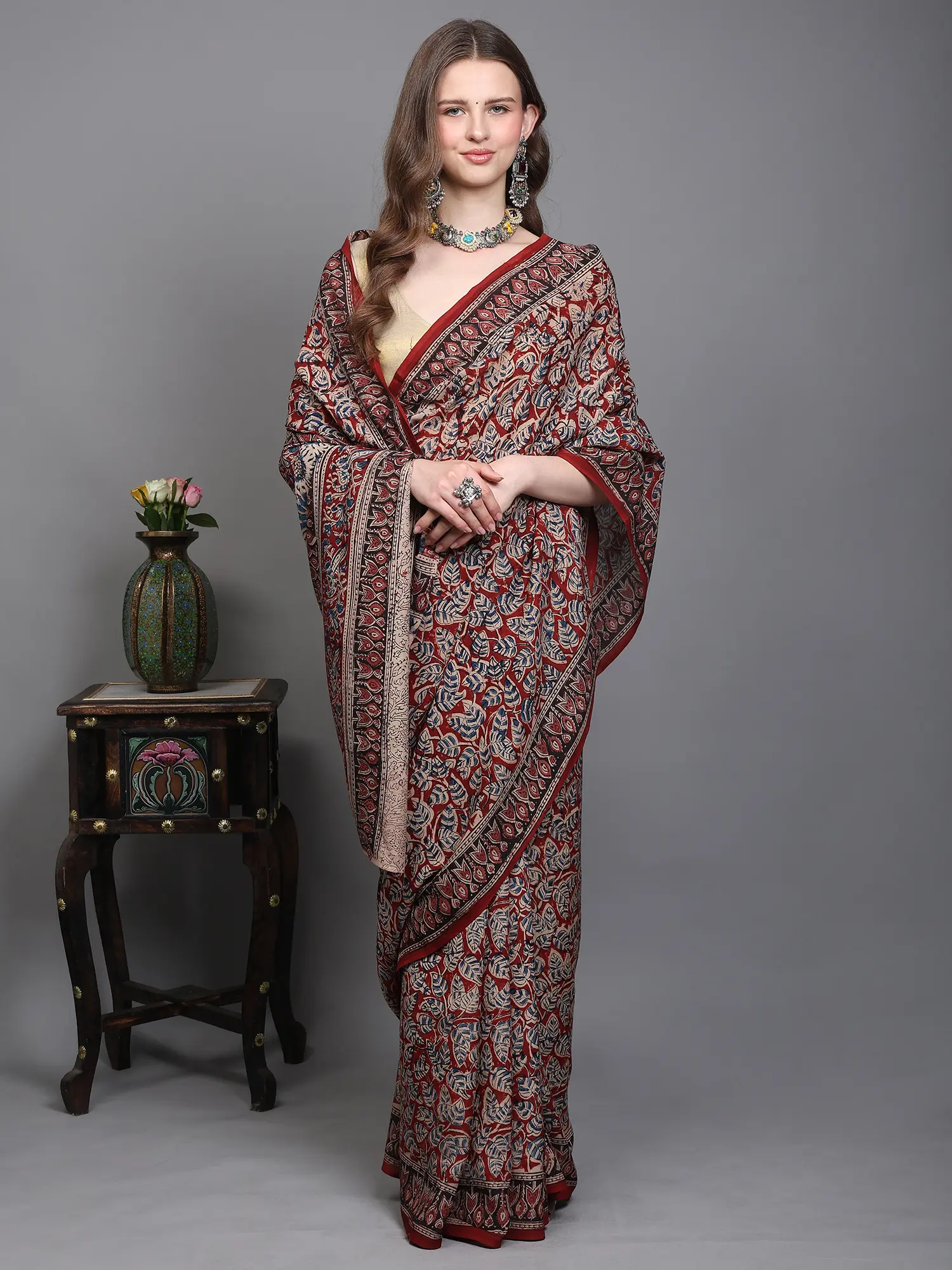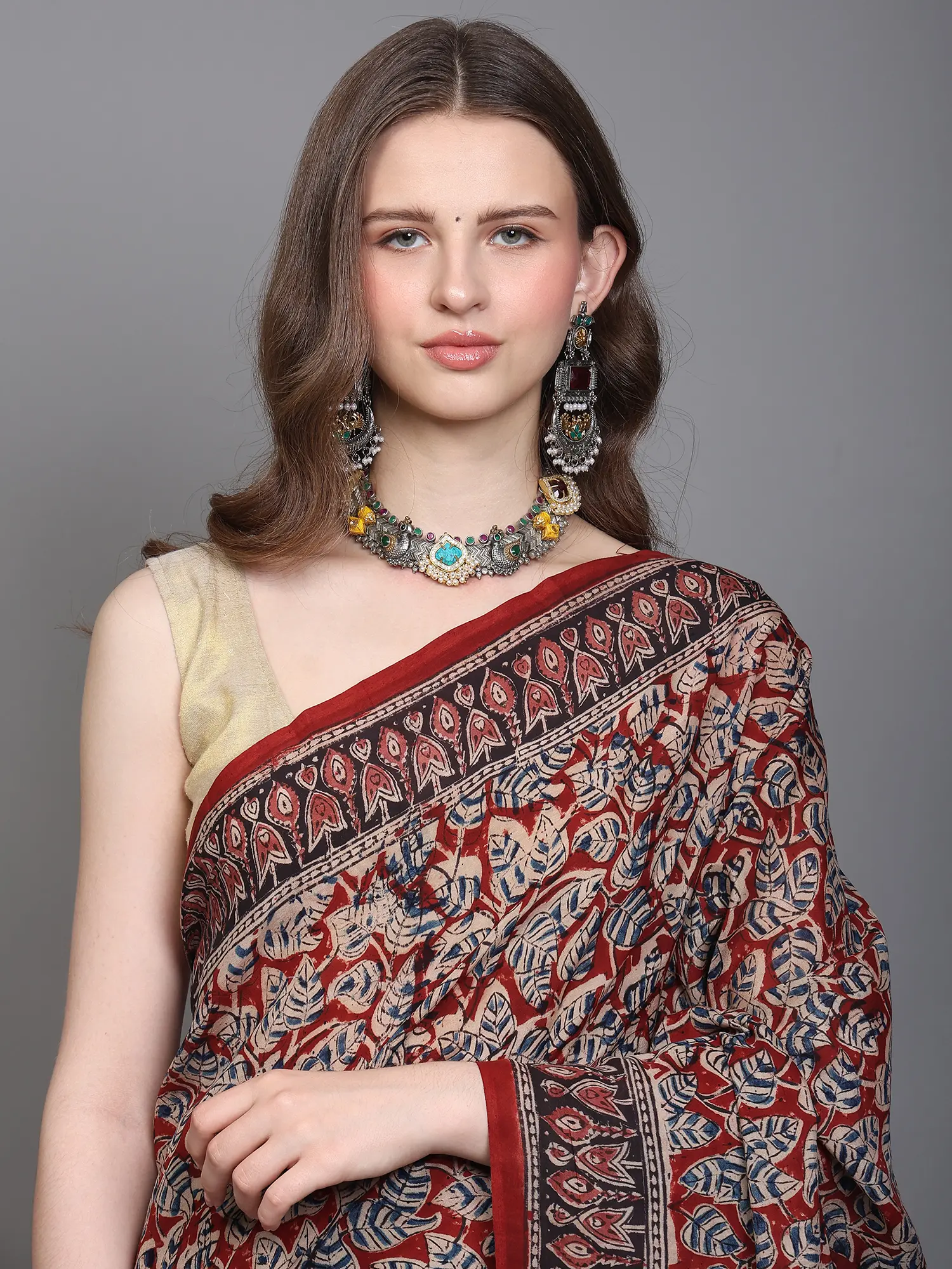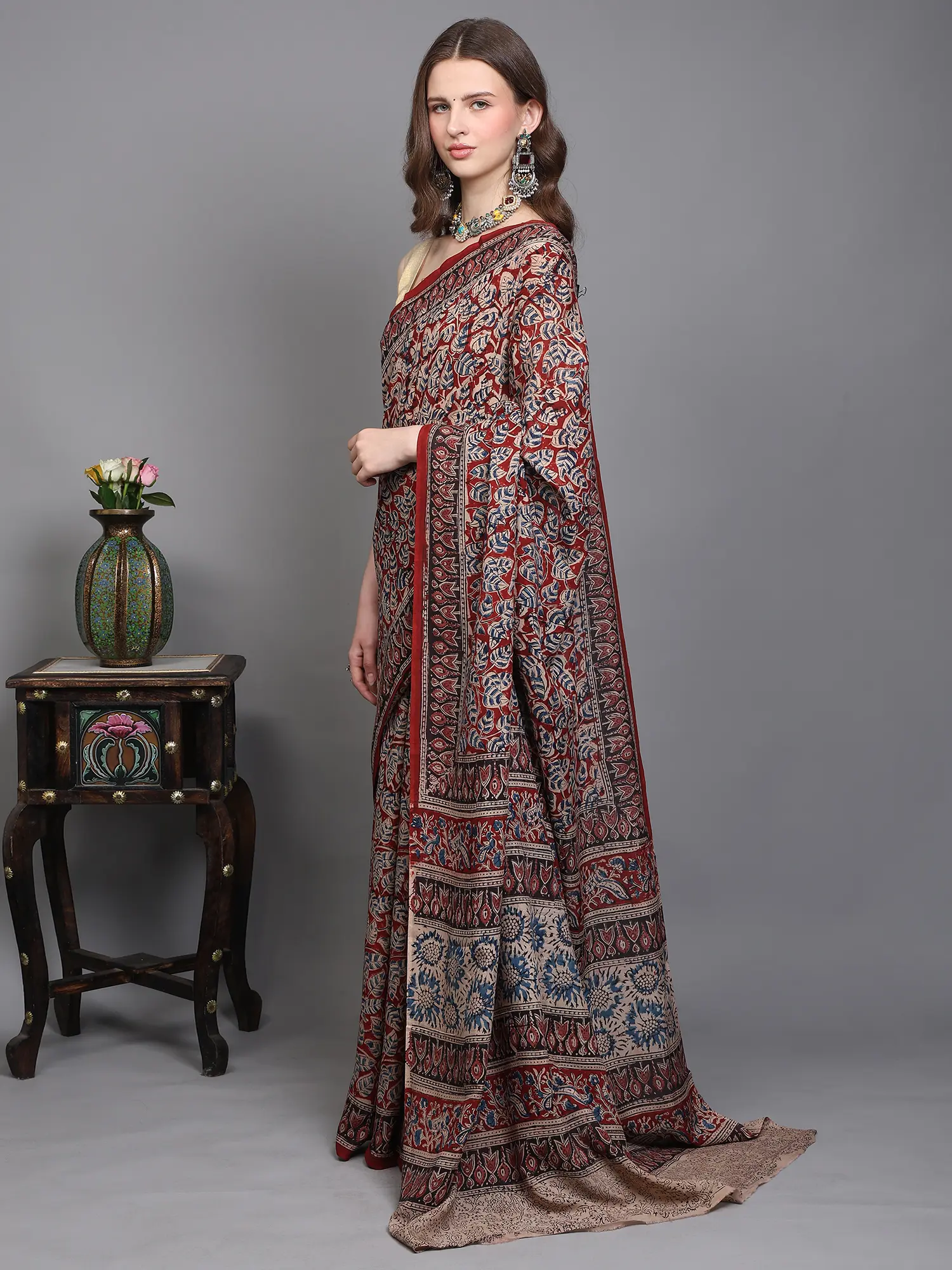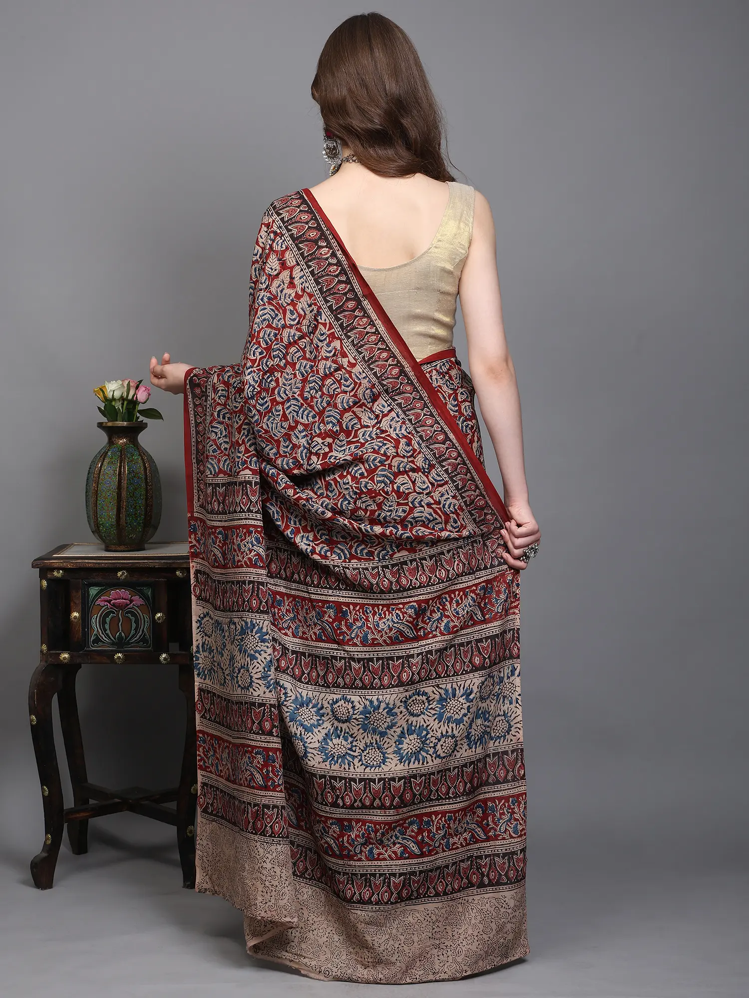 Tussar Silk Floral Hand Painted Pen Kalamkari Silk Saree For Festival Occasion