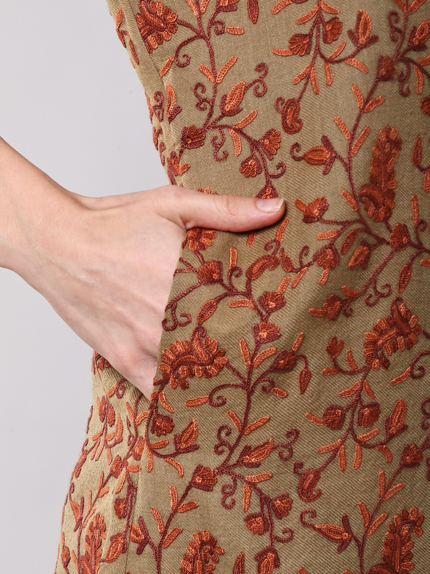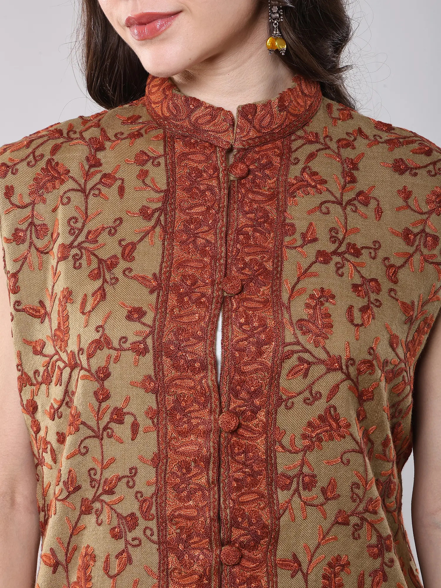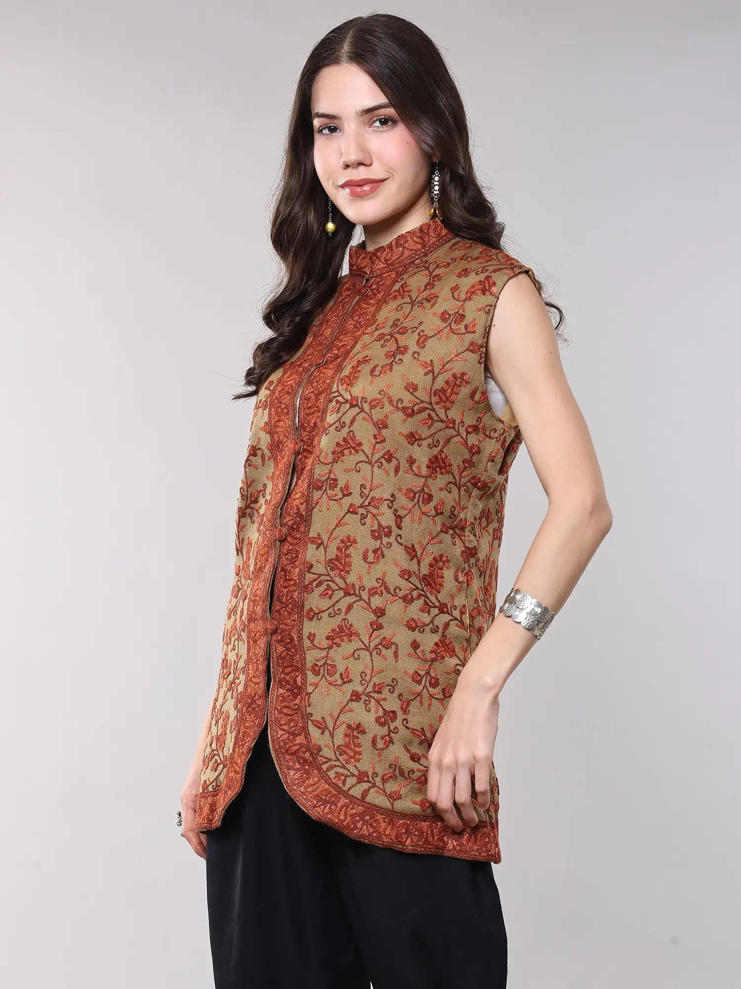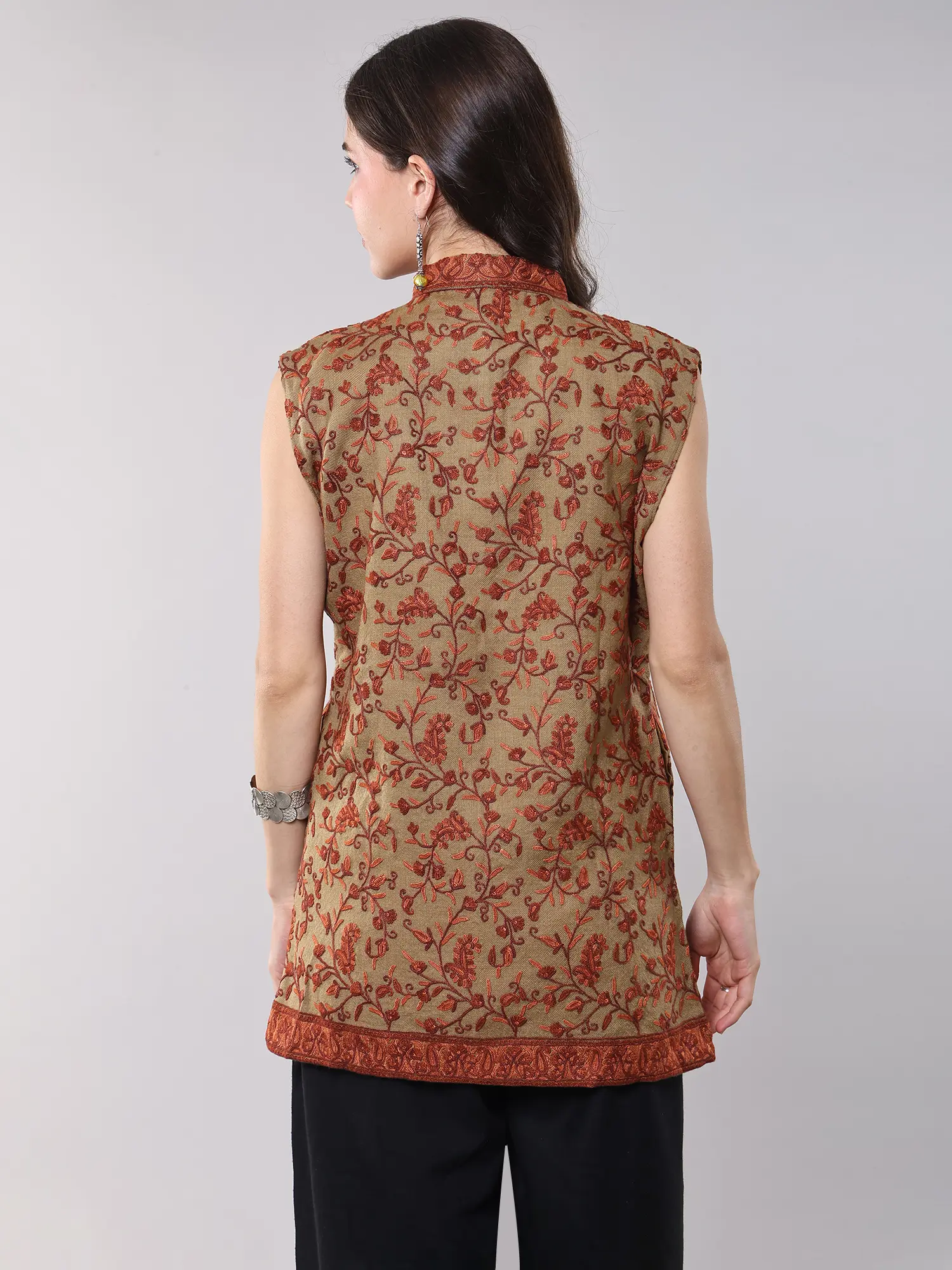 Experience the legacy of Kashmiri artisans in every thread. Crafted from the finest pure wool, this sleeveless jacket embodies centuries of tradition. The intricate Aari embroidery, a technique passed down through generations, adorns the fabric with breathtaking precision. Each paisley vine is meticulously hand-stitched, creating a tapestry of vibrant color and delicate detail that speaks of dedication and skill.