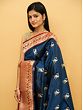 On the blue field of the saree, single parrots are shown perched on a branch while on the border are motifs of birds along with flowing vegetation, symbolizing richness and auspiciousness in life.