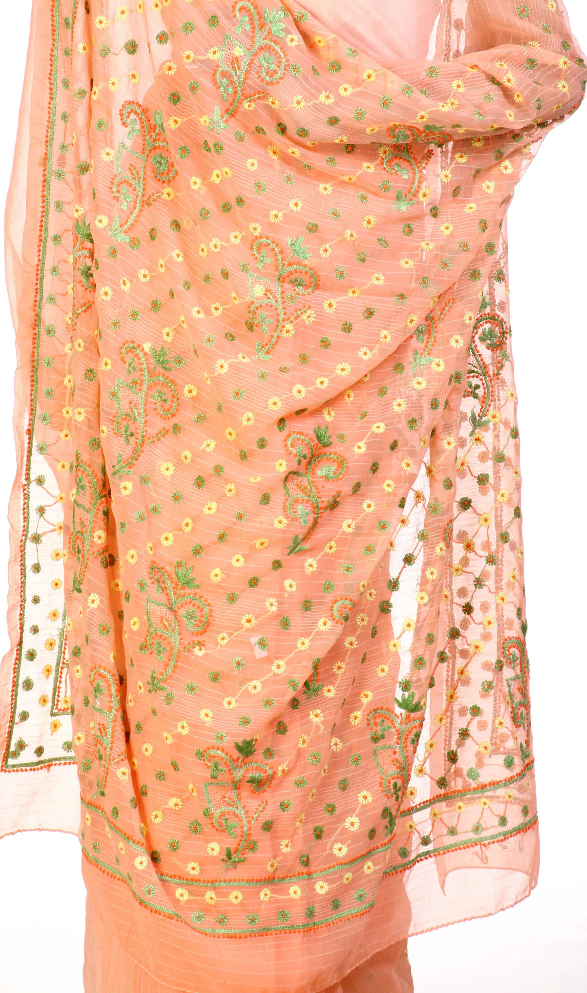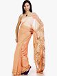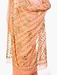 The endpiece is the most glamorous aspect of this saree. It is densely embroidered in quintessential Lucknavi style with miniscule flowers in pale green and yellow, punctuated by extensive snatches of vine here and there. Matching embroidery is to be found along the thin border and more of those flowers across the field of the saree. This chiffon number is best teamed with the sleekest of your mother’s hand-me-downs.
