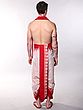 The dhoti, generously proportioned at 180 inches in length and 46 inches in width, drapes with fluid grace, offering supreme comfort and a silhouette that speaks of understated sophistication. Complementing this is the angavastram, measuring 90 inches by 46 inches, its vibrant red hue punctuated by a striking Ikat temple border that adds a captivating visual appeal. This border, a classic motif, draws the eye with its geometric precision and symbolic significance, enhancing the overall aesthetic.