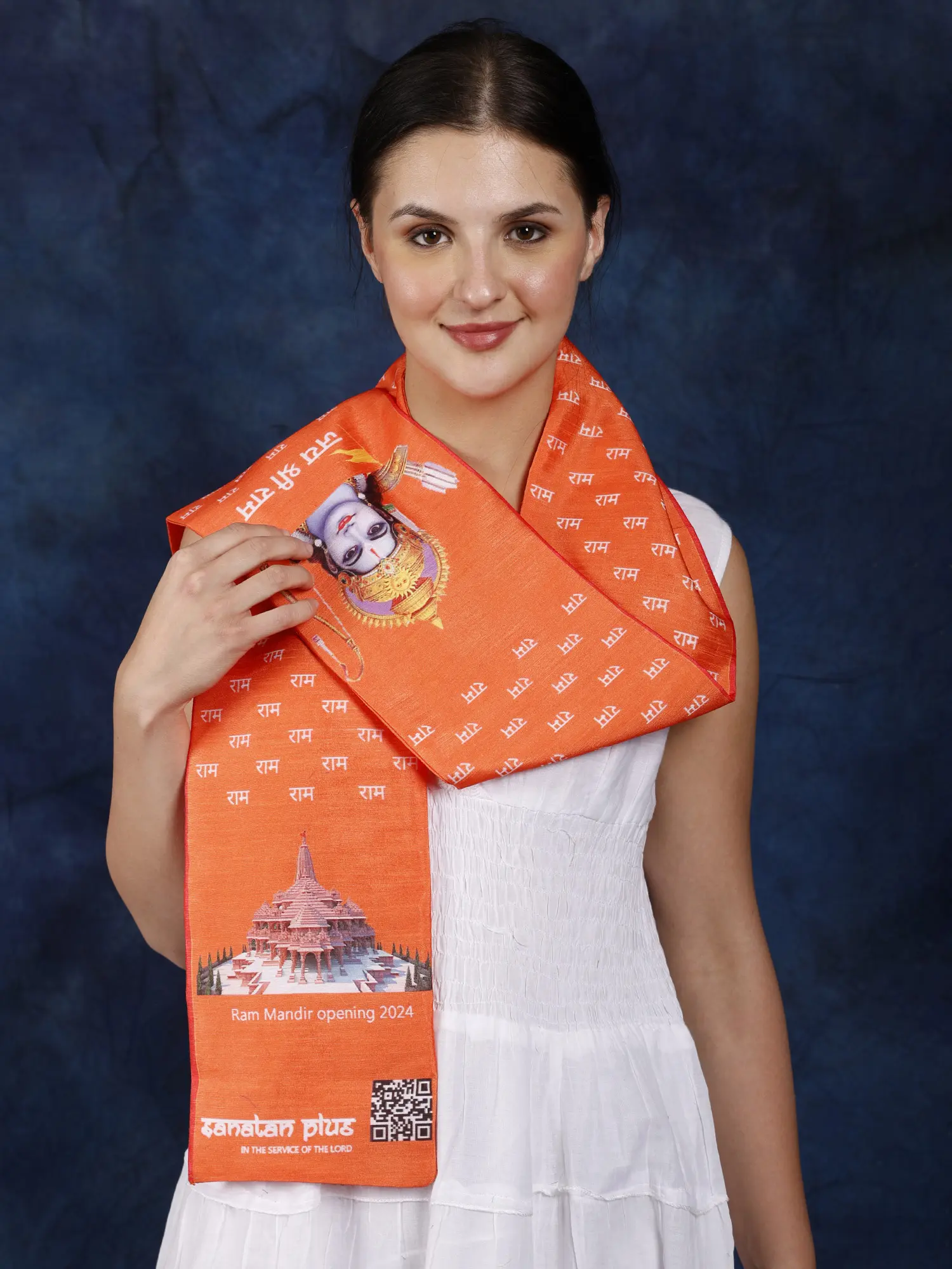 This Bhagwa Prayer Scarf is more than just an accessory; it is a statement of faith and a connection to a rich cultural heritage. It can be a perfect accompaniment for attending religious ceremonies, visiting temples, or participating in devotional gatherings. The presence of the Ayodhya Mandir imagery further enhances its significance, representing a beacon of faith and a pilgrimage site for devotees. Carry the blessings and divine presence of Lord Rama with you wherever you go, enhancing your spiritual practice and embodying your devotion in a beautiful and meaningful way.