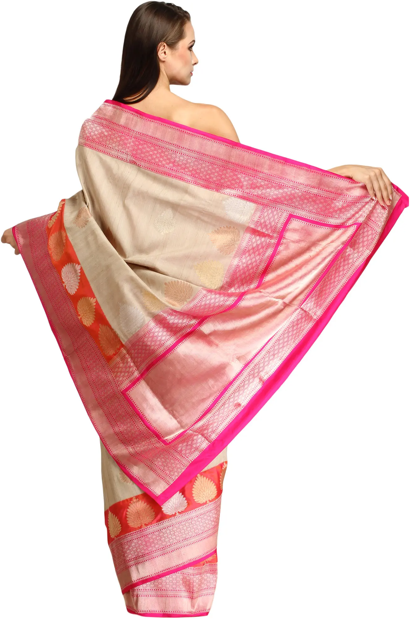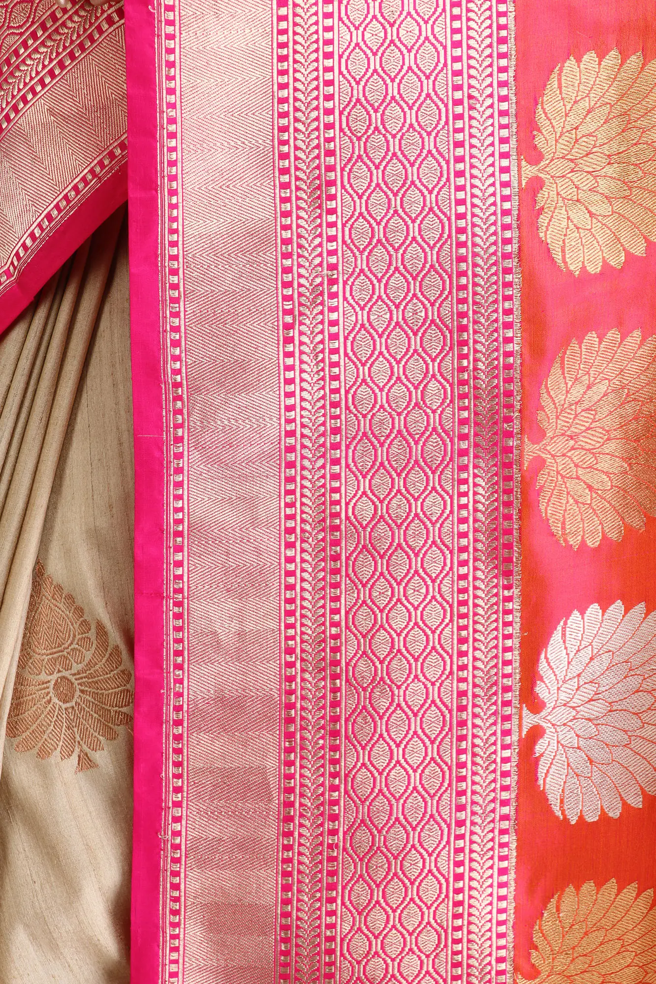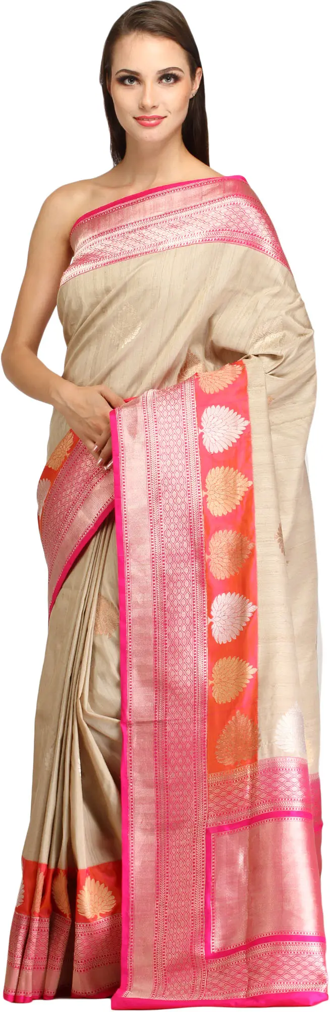 Sandshell and Pink Sari from Banaras with Zari-Woven Trees on Border and Brocaded Pallu