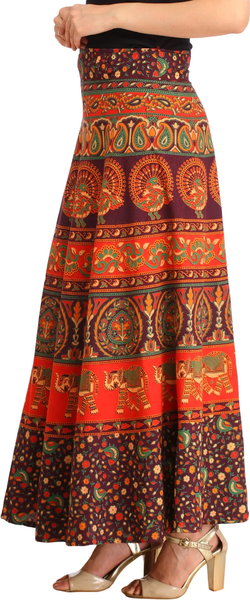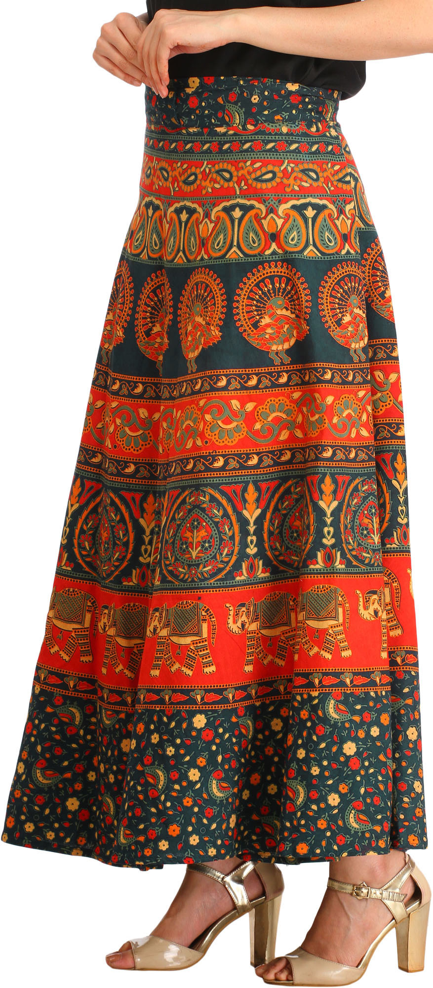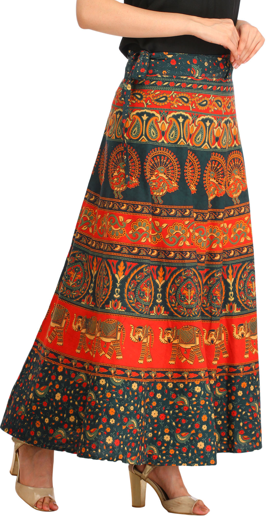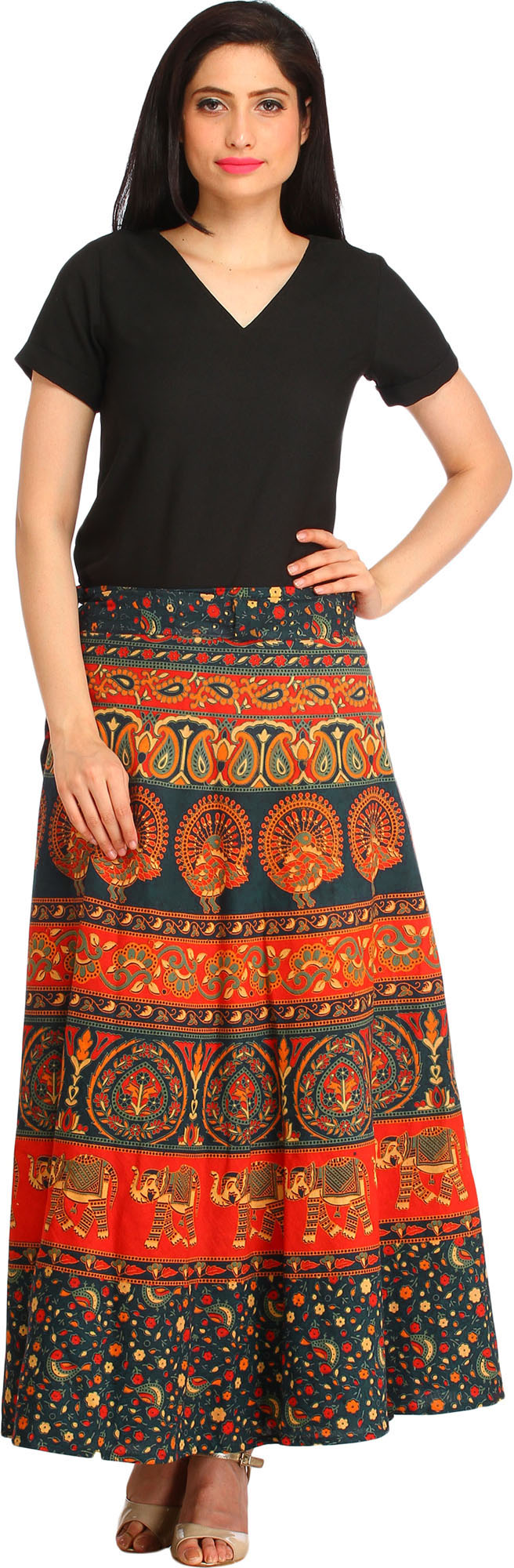 Elevate your style with the vibrant allure of a Sanganeri Wrap-Around Long Skirt adorned in captivating prints of peacocks and elephants. This skirt is a canvas of rich cultural artistry, showcasing the essence of Sanganer's renowned printing techniques.