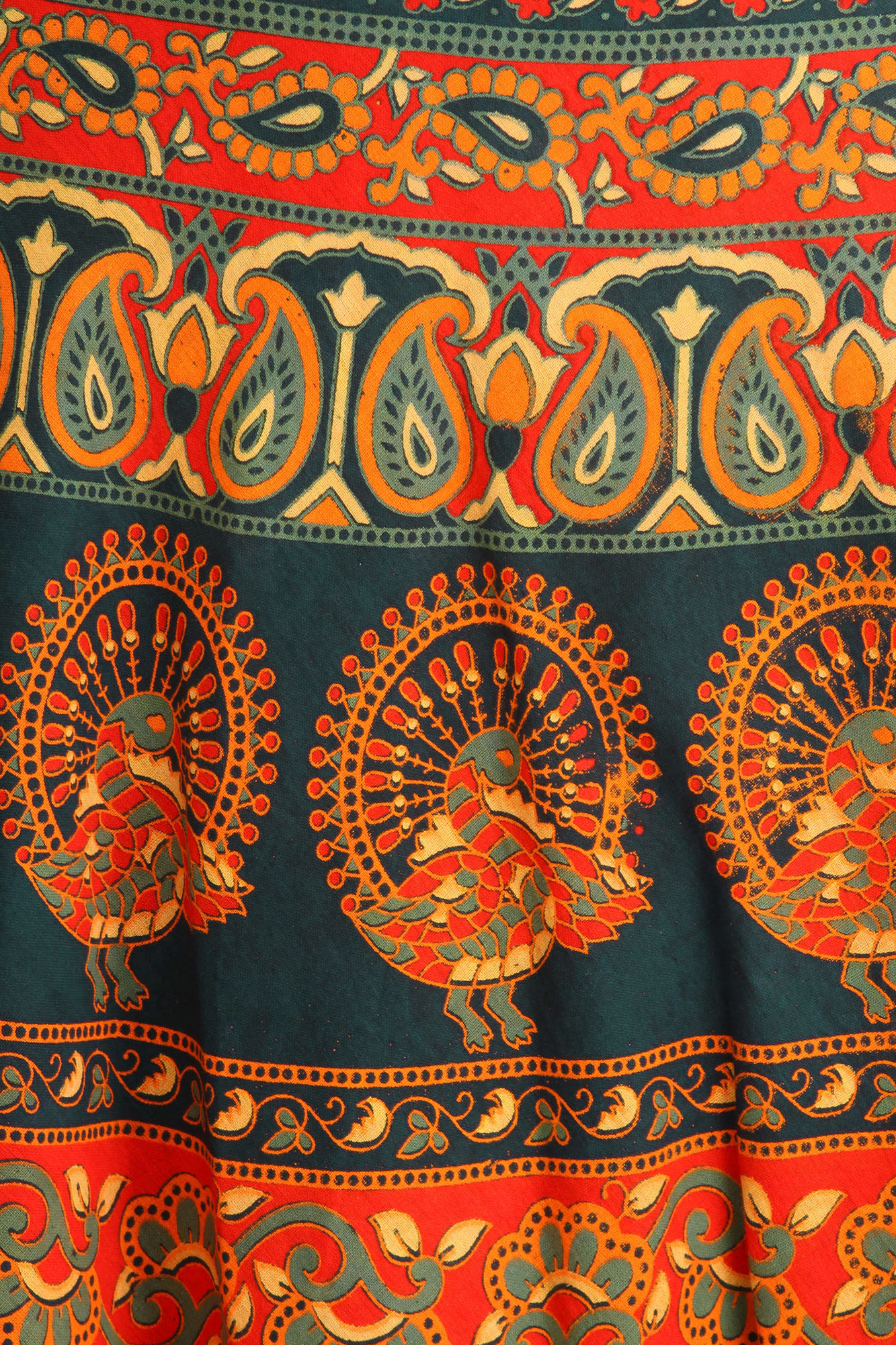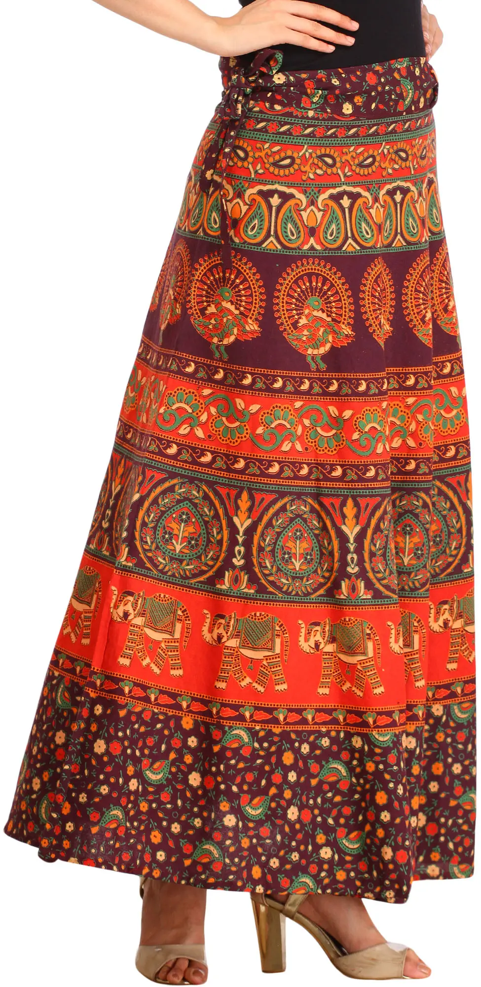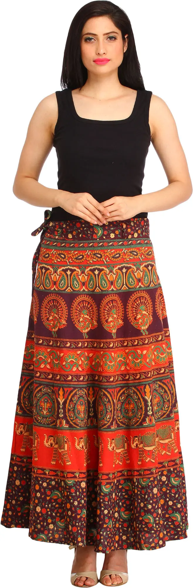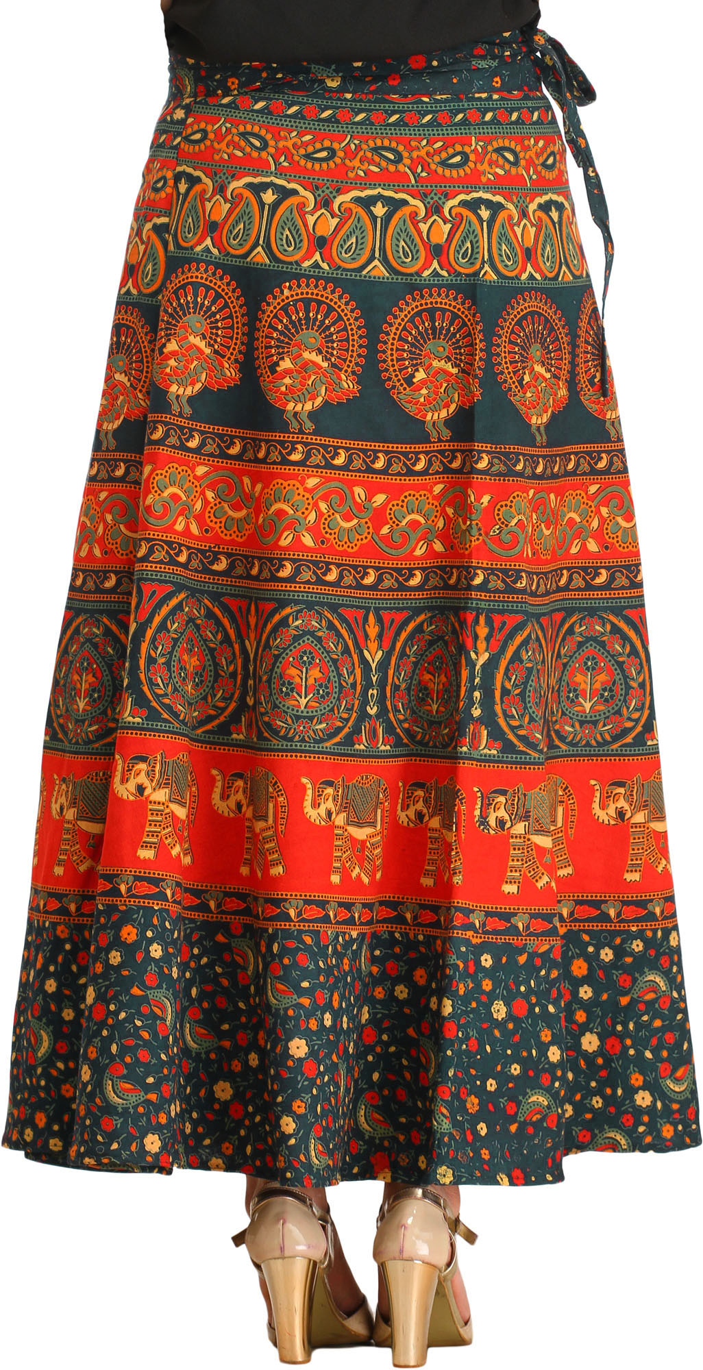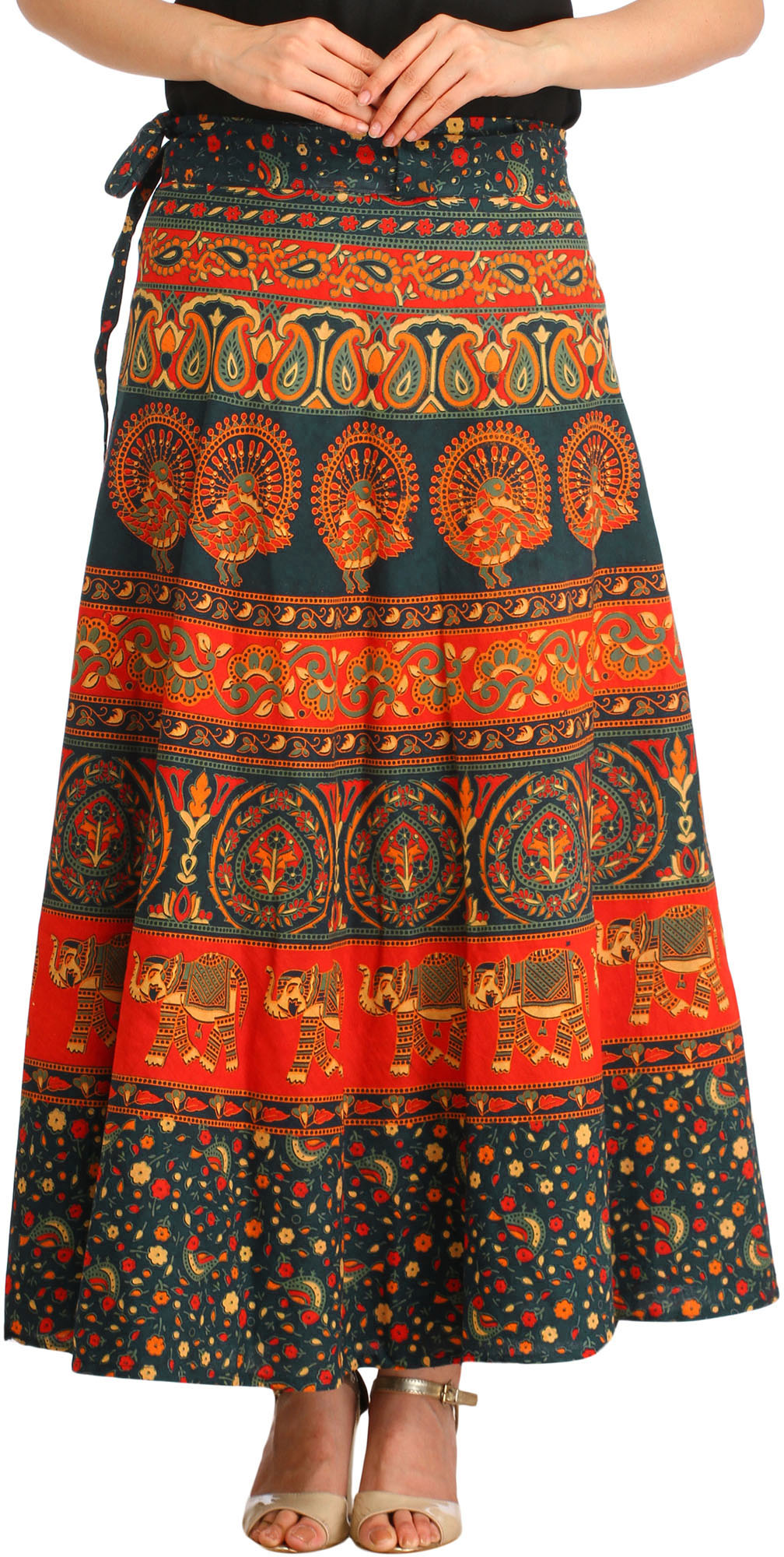 Elevate your style with the vibrant allure of a Sanganeri Wrap-Around Long Skirt adorned in captivating prints of peacocks and elephants. This skirt is a canvas of rich cultural artistry, showcasing the essence of Sanganer's renowned printing techniques.