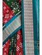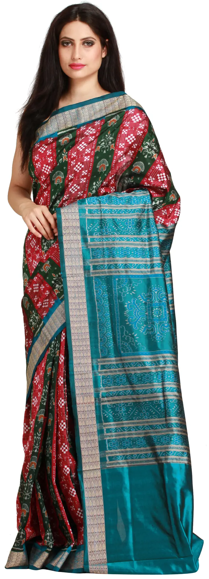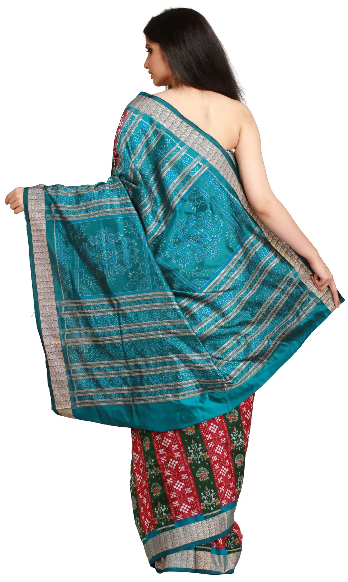 The defining feature of this magnificent creation is its intricate Ikat weave. Known as "the language of the loom," Ikat is a complex dyeing technique where threads are resist-dyed before being woven, resulting in blurred, artistic patterns. In this sari, the Ikat work comes alive in a mesmerizing display of geometric motifs and stylized floral designs. The sangria-red and green hues are interspersed with delicate white and subtle orange accents, forming rhythmic bands and motifs that are characteristic of Sambhalpuri craftsmanship. The pallu, in a captivating shade of turquoise, is adorned with a denser and more elaborate Ikat pattern, providing a stunning contrast and a focal point for the entire drape.