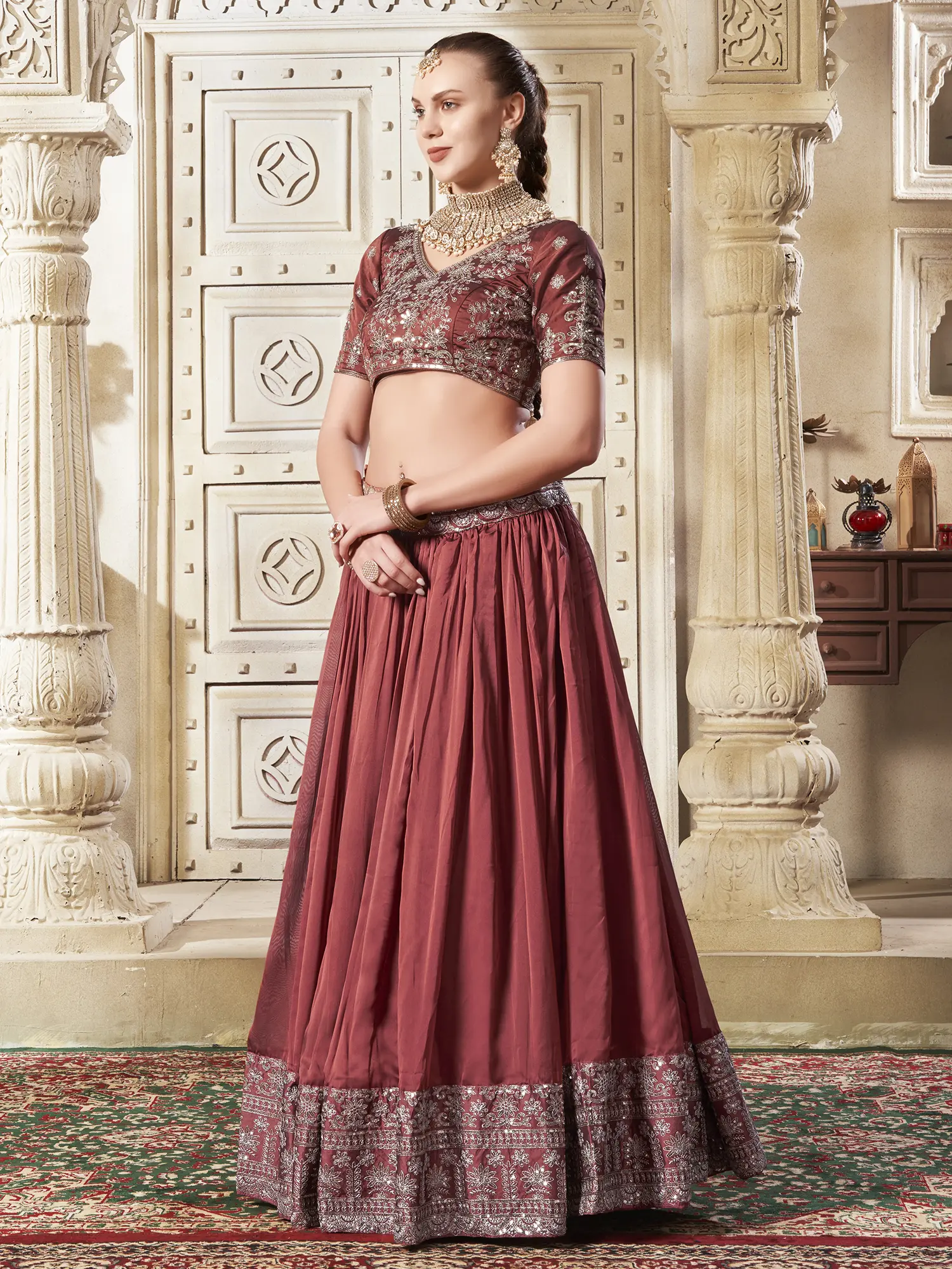 Step into the spotlight and exude timeless grace with this exquisite lehenga choli and dupatta ensemble. Crafted from premium Rangoli silk, this outfit promises a luxurious feel and a sophisticated drape, making it the perfect choice for your most cherished occasions, especially your bridal trousseau. The rich, sanguine-brown hue evokes a sense of warmth and opulence, beautifully complemented by intricate detailing that speaks of artisanal craftsmanship.