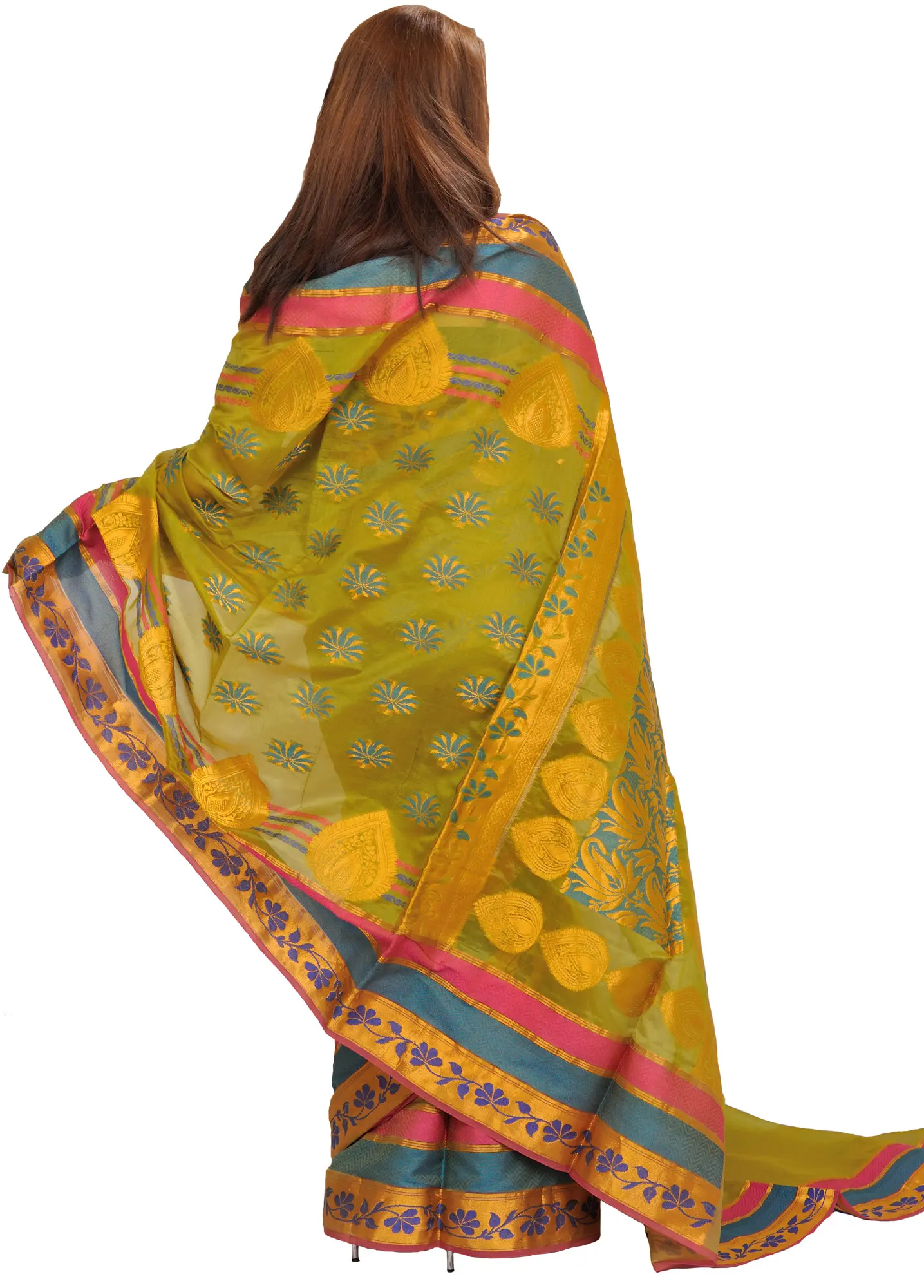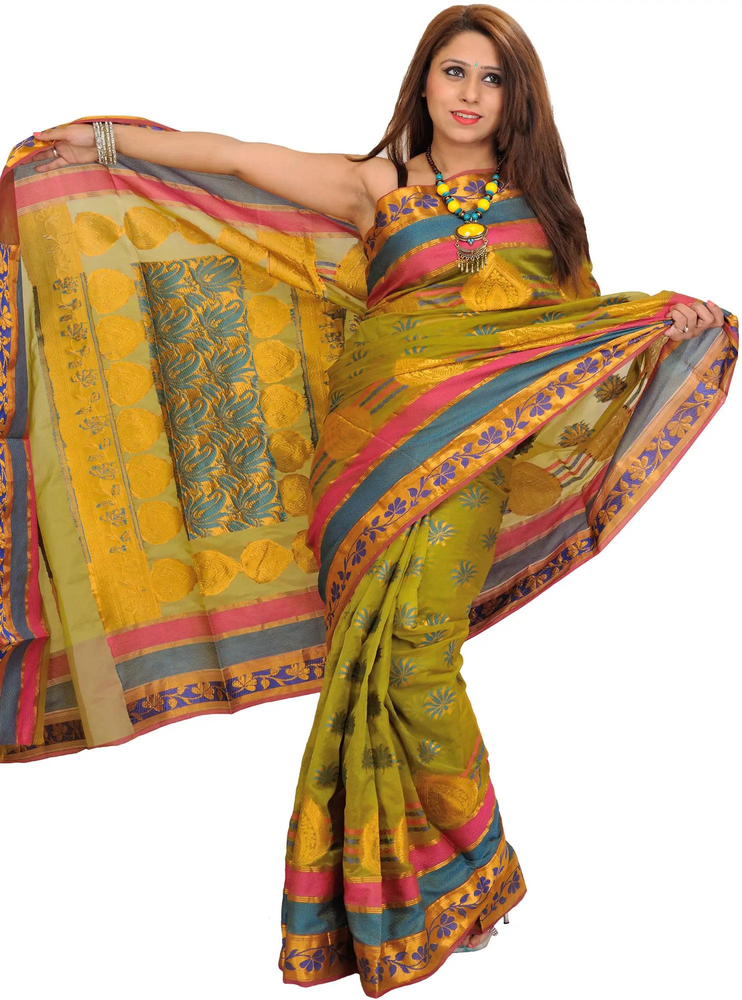 Vibrant, peppy, and stylish words are perfect to describe the Banarasi saree you see here. The use of multiple colors in its drape and bold embellishments with golden and colorful threads, make this a stunning party wear Banarasi.