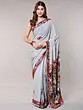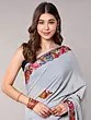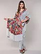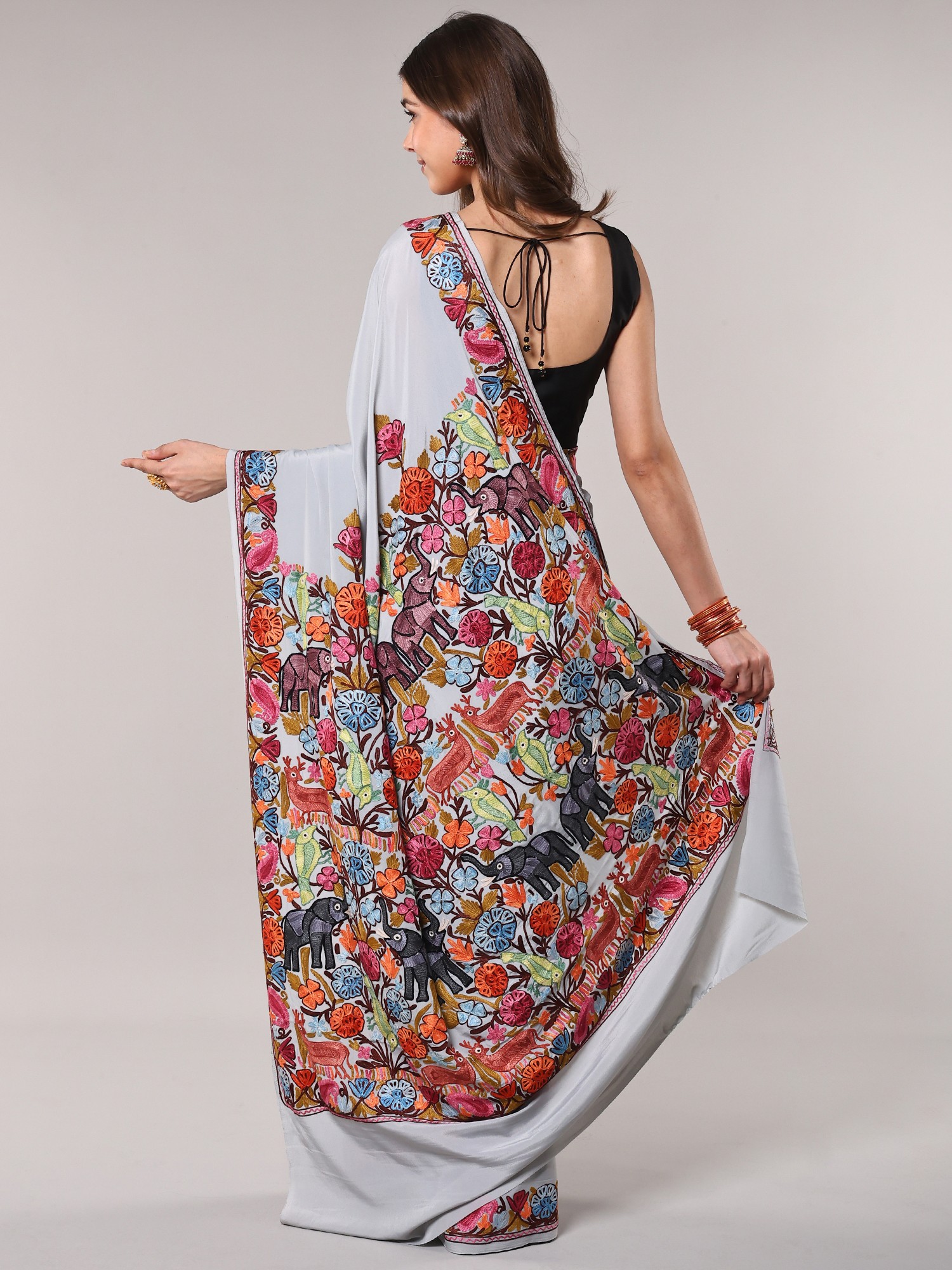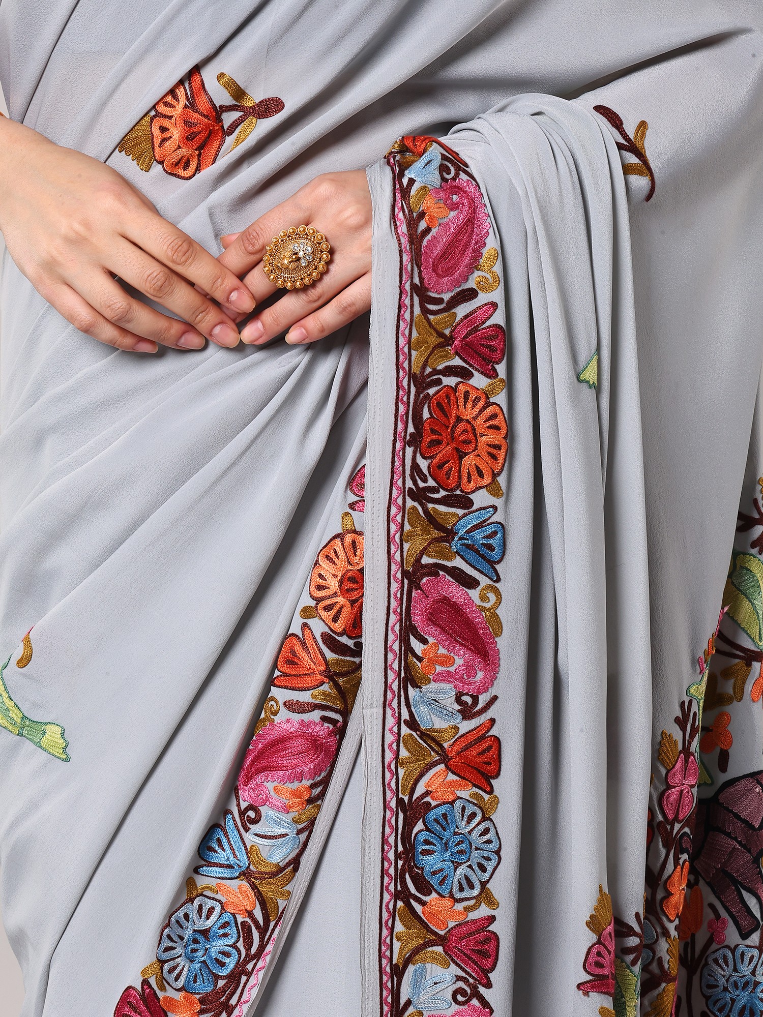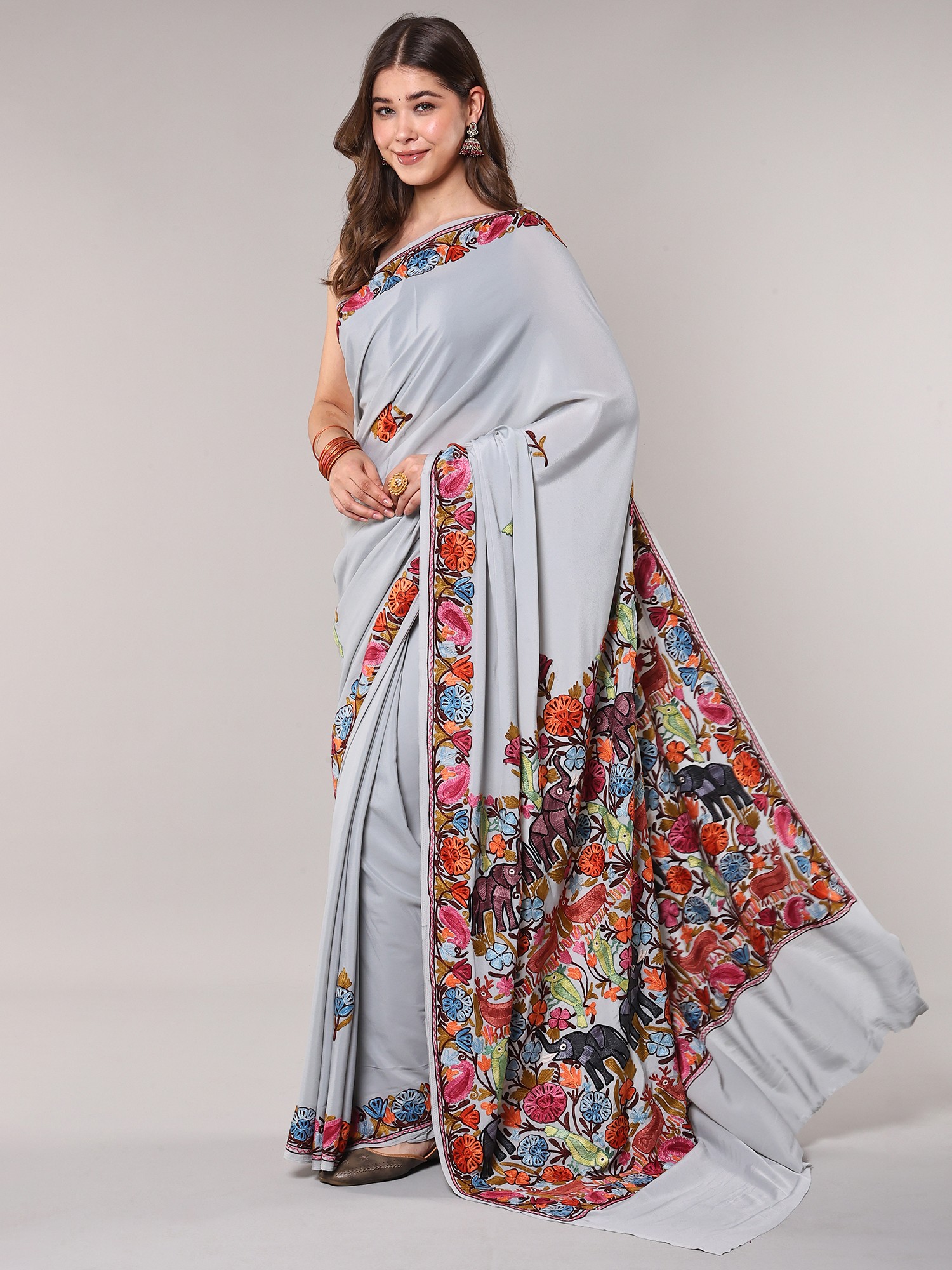 Glacier-Gray Kashmiri Saree with Aari Floral-Embroidery on Border and Pallu