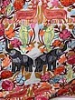 The highlight of this exquisite saree is its elaborate Aari embroidery. Unlike machine embroidery, Aari work is done by hand using a hook-like needle, allowing for incredibly detailed and textured designs. Here, the embroidery depicts a lively jungle teeming with life. Graceful elephants, their forms rendered in shades of grey and accented with subtle pink and purple hues, wander through a profusion of colorful flora. Lush green leaves and a riot of flowers in vibrant reds, oranges, fuchsias, and deep pinks create a captivating contrast against the serene white backdrop. Tiny birds, rendered in delightful shades of teal and pink, add further charm and movement to the scene. The embroidery flows along the border of the saree, cascading down to create a dramatic and eye-catching effect.