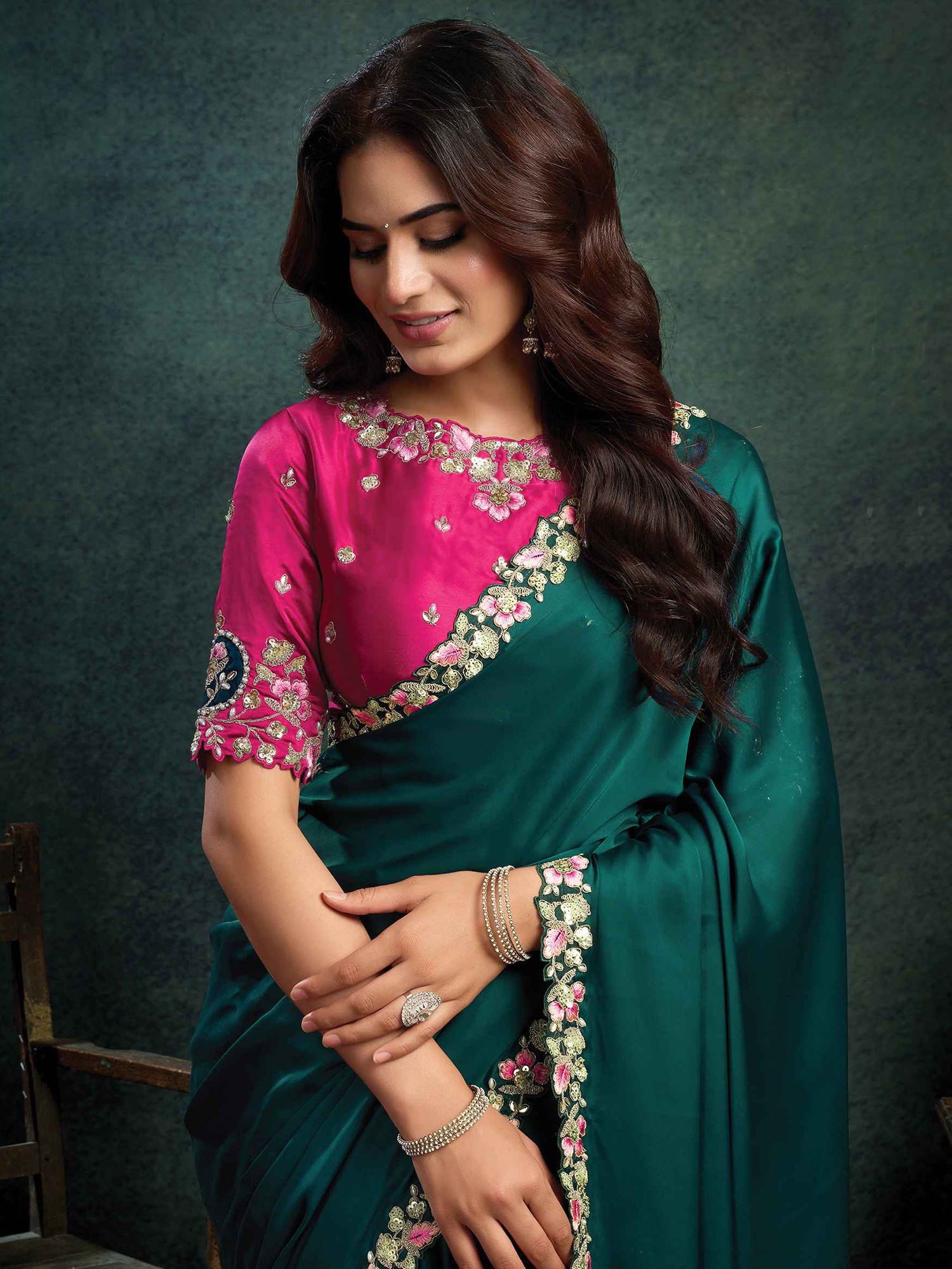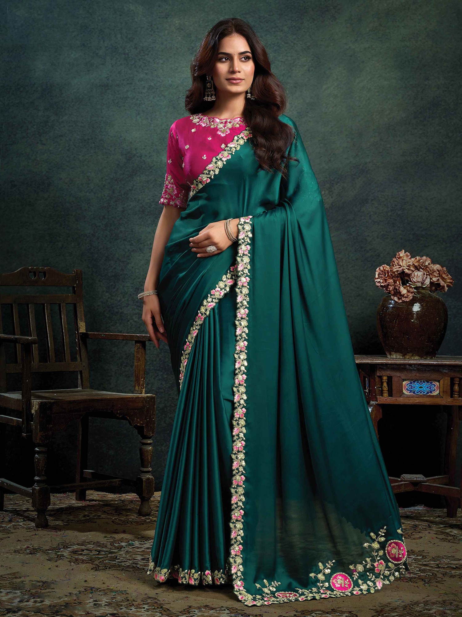 Designer Satin Silk Saree With Multi Thread Motif Embroidery Stone Work And Applique Handcrafted Party Wear Saree For Women