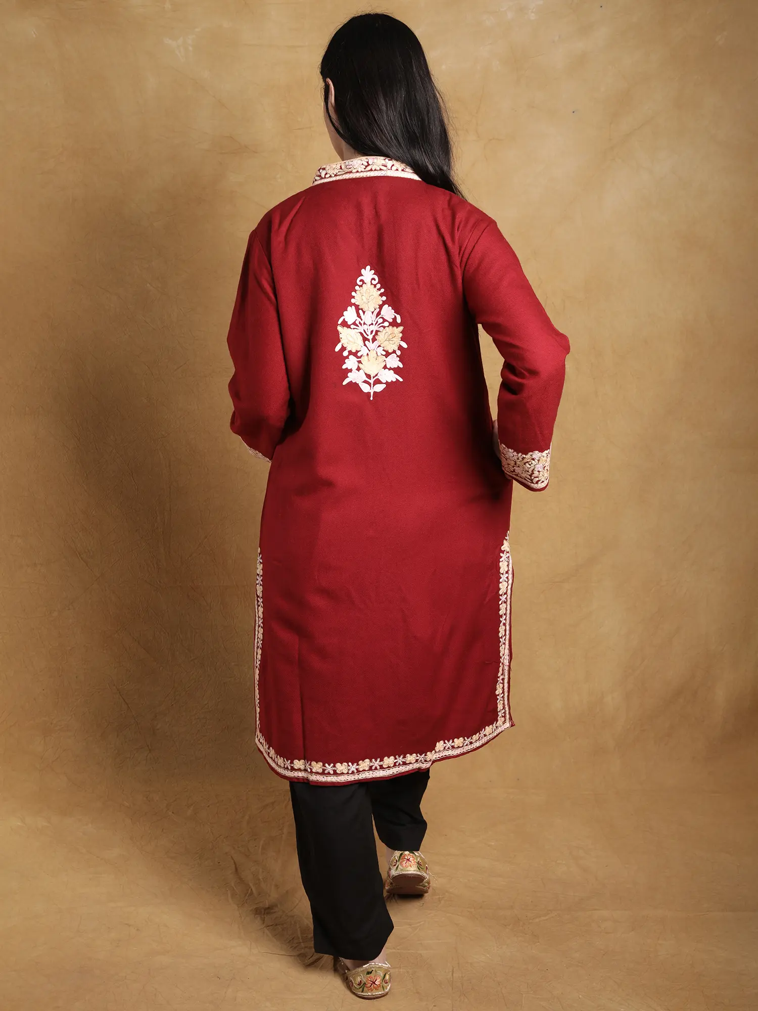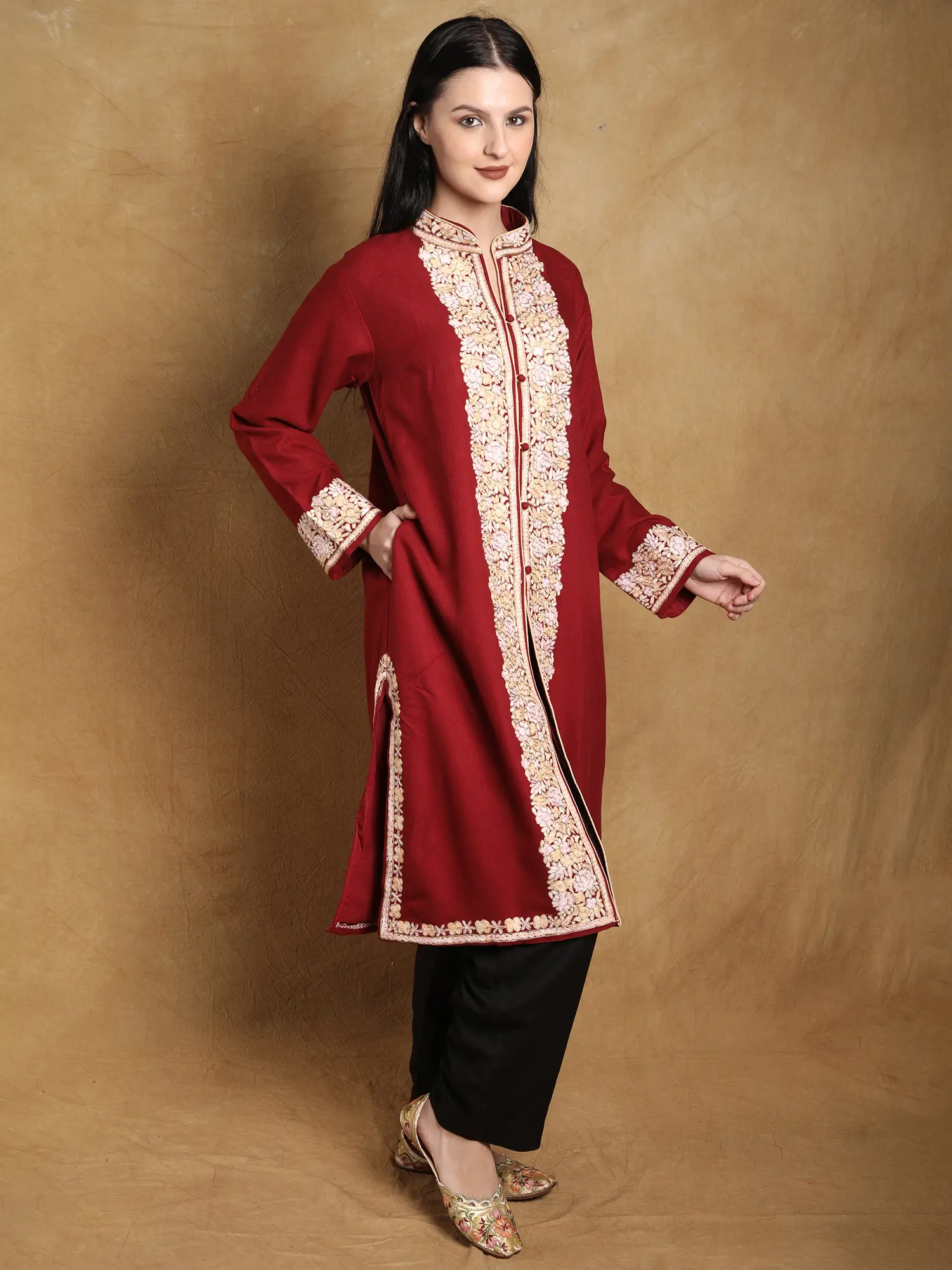 Savvy-Red Kashmiri Plain Long Jacket with Floral Aari Embroidered Patch on Border