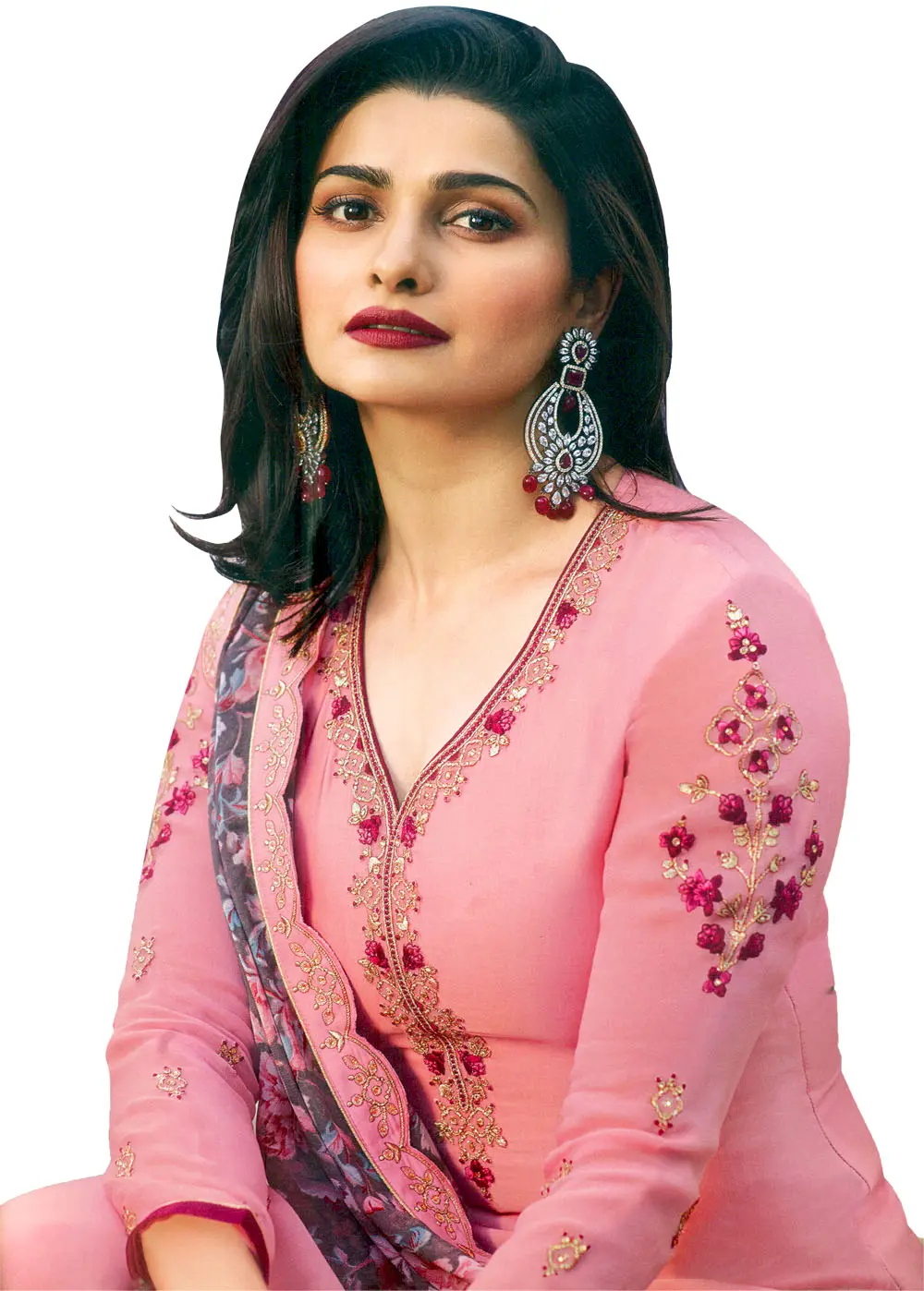 The Sea-Pink Prachi Palazzo Salwaar Kameez is more than just an outfit; it's an expression of refined taste and a celebration of intricate craftsmanship. The palazzo pants offer a modern silhouette, providing ease of movement and a contemporary edge. The rich satin fabric ensures a smooth, elegant flow, while the detailed embroidery and vibrant print add a touch of opulence. Whether you're attending a wedding, a festive celebration, or a formal dinner, this ensemble will ensure you stand out with its sophisticated charm and timeless appeal. Dress it up with statement jewelry and elegant heels for a truly unforgettable look.