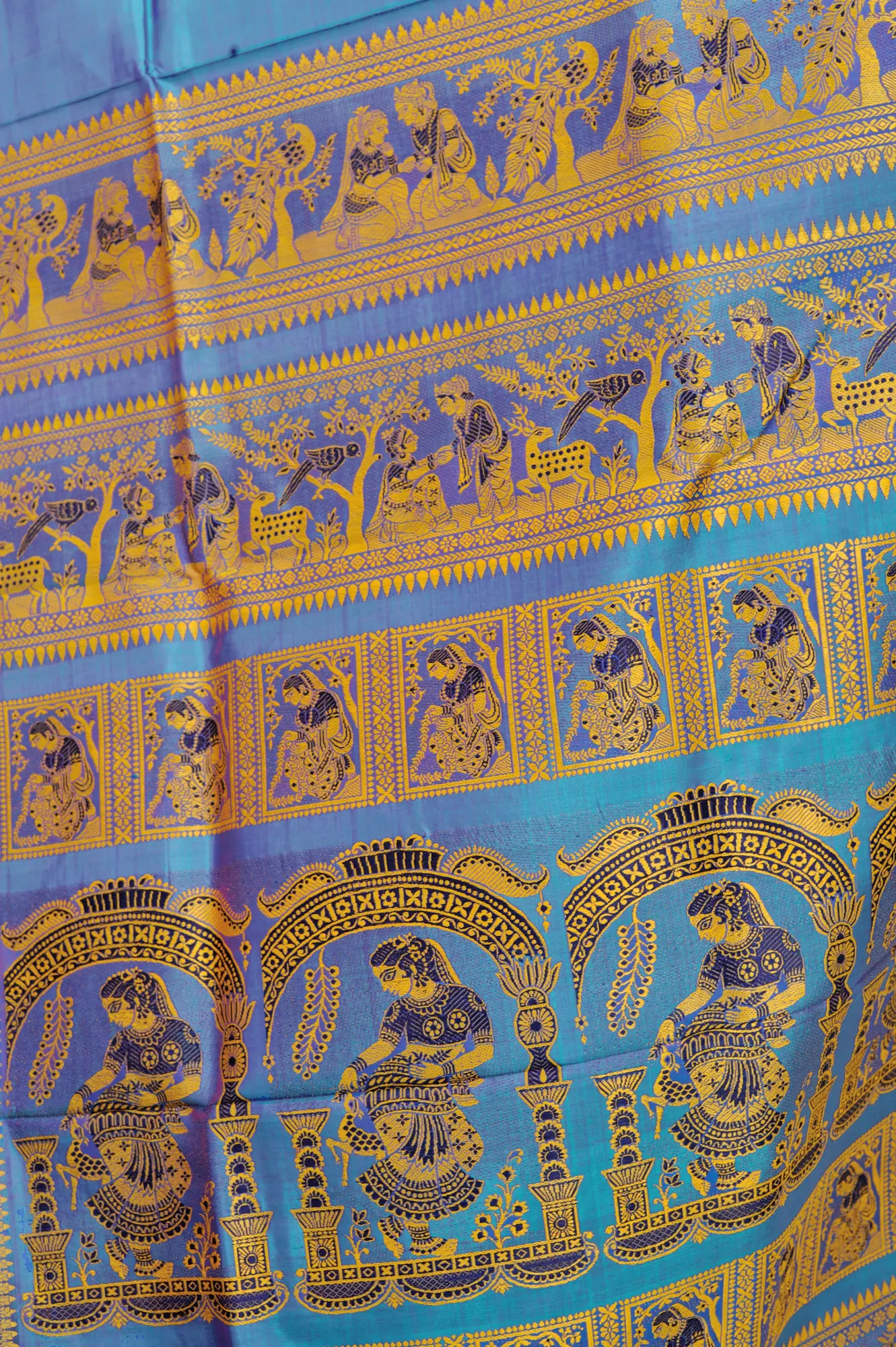 Dushyant-Shakuntala and Radha Krishna (Green-Lake Baluchari Love Sari)