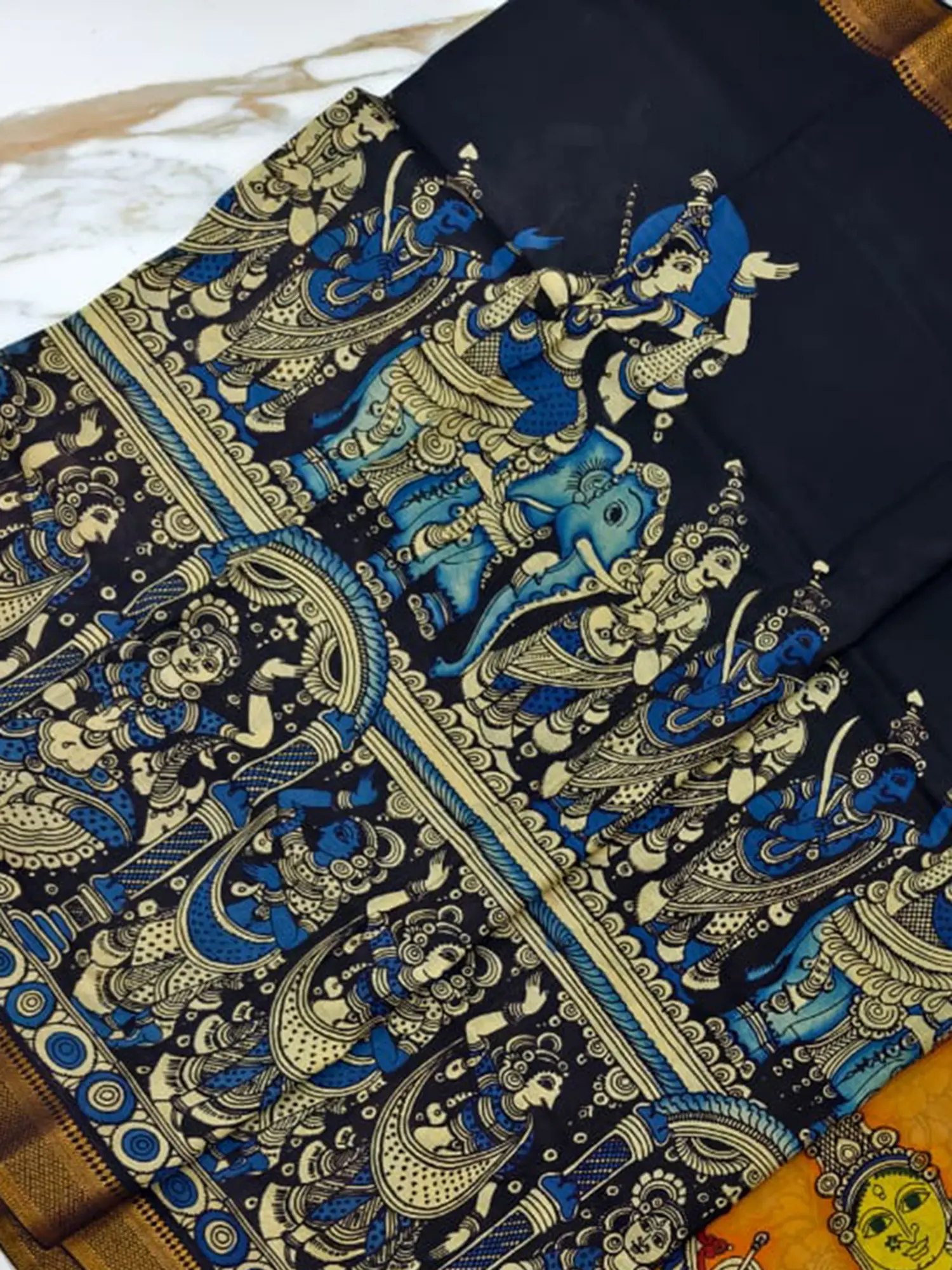 Beyond the captivating central motif, the body of the saree unfolds with a fascinating narrative. Traditional Kalamkari patterns, inspired by ancient Indian mythology and nature, adorn the fabric. You'll find depictions of celestial beings, elephants, peacocks, and floral designs, all rendered with remarkable precision and a symphony of blues and earthy tones against a classic black base. The contrast between the dark, elegant black of the main body and the lively, detailed artwork creates a visually stunning effect that is both sophisticated and culturally rich.