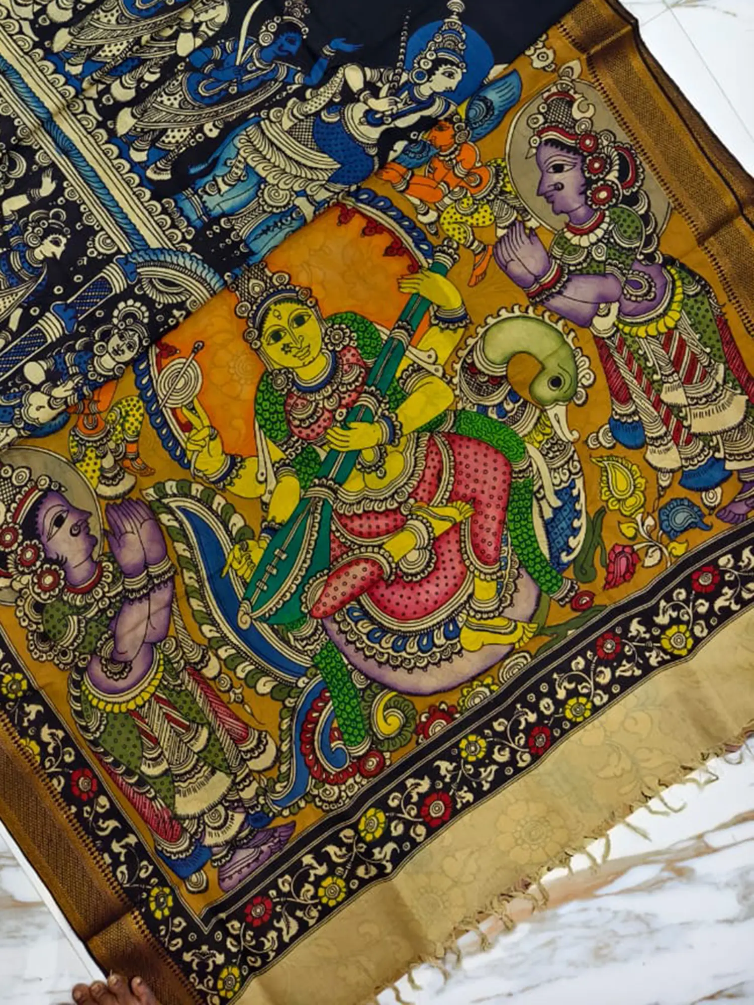 The true heart of this saree lies in its mesmerizing pallu. Here, Goddess Saraswati, the embodiment of knowledge, music, and arts, is depicted in all her celestial glory. Seated gracefully, she plays her Veena, surrounded by a symphony of colors and intricate motifs that speak of devotion and artistic expression. The meticulous hand-painting captures the serene expression of the goddess, the delicate curves of her instrument, and the lively ambiance of her divine presence. The vibrant yellow backdrop of the pallu serves as a radiant stage, further accentuating the divine imagery and the artistry of the Kalamkari work.