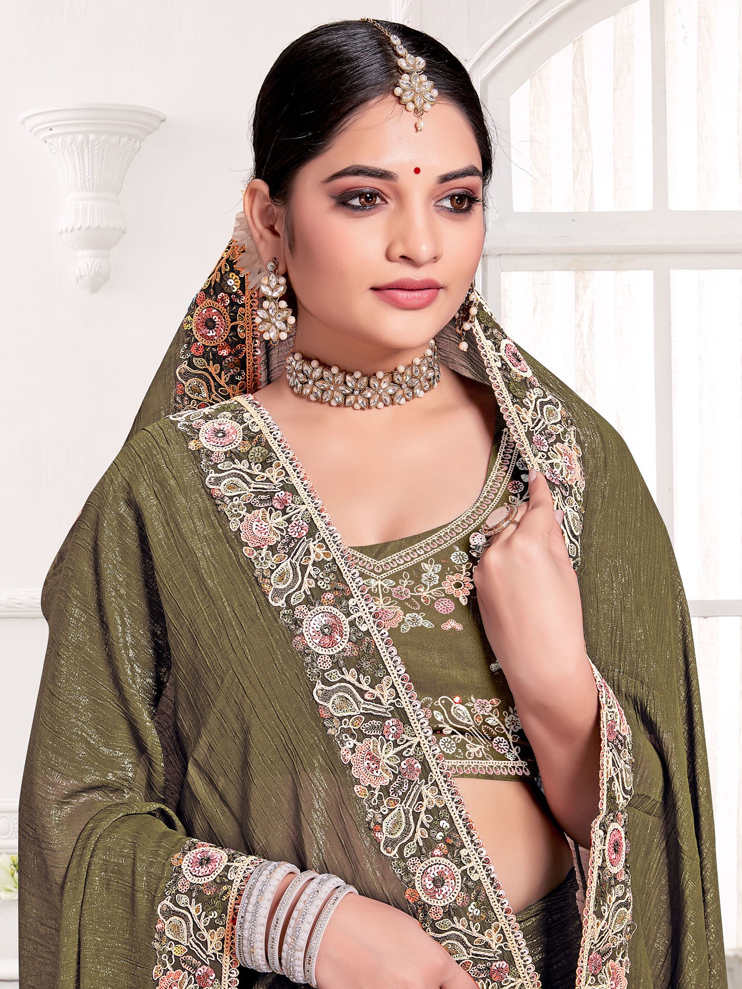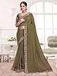 Kiwi-Green Saree from Bengal with Floral Border and Paisleys on Aanchal