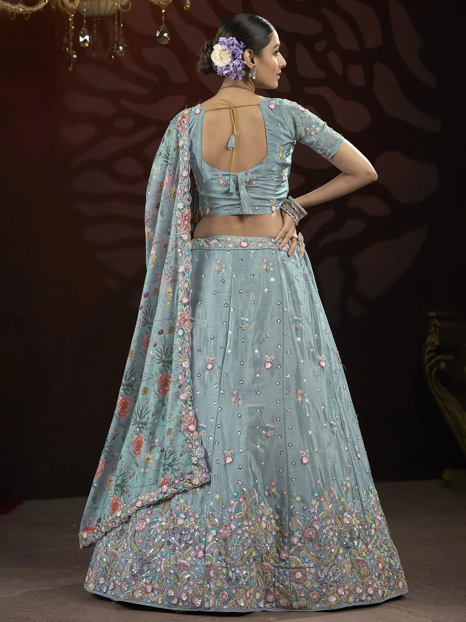 Make a statement at your next special occasion with this exquisite lehenga choli. Crafted from luxurious net fabric, this ensemble is designed to drape beautifully, accentuating your figure with graceful fluidity. The soft, dusty purple hue is both sophisticated and romantic, perfect for weddings, parties, or any celebration where you want to feel your absolute best. The intricate embroidery, a stunning blend of sequins and threads, adds a touch of opulence and sparkle, catching the light with every movement. Delicate floral patterns are meticulously embroidered throughout the lehenga and blouse, creating a captivating visual tapestry. The matching dupatta, adorned with a charming floral print, adds the perfect finishing touch, completing the ensemble with effortless style. This lehenga choli is more than just an outfit; it's an experience, a feeling of unparalleled confidence and timeless beauty.