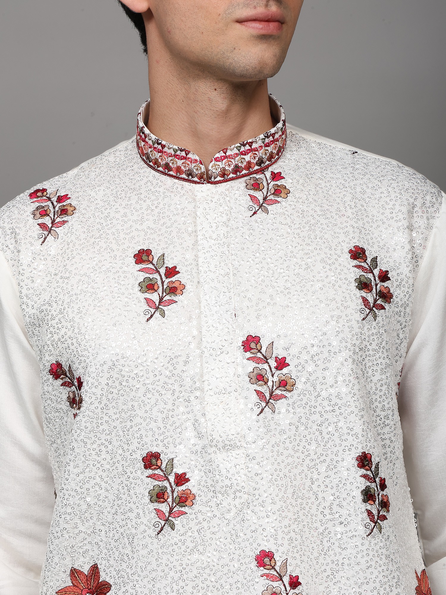 Three Piece Wedding Kurta Pajama Set with Poly-Velvet Jacket