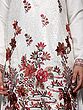 The kurta is the centerpiece of this stunning outfit, boasting an intricate display of artistry. Fine thread work forms a symphony of multicolored flowers, adding a vibrant touch against the background. Each floral motif is carefully crafted, showcasing attention to detail and an eye for aesthetic balance. The delicate shimmer of sequins further enhances the visual appeal, catching the light with every movement and adding a subtle touch of glamour. This fusion of traditional embroidery with modern embellishments creates a unique and captivating design. The neckline and cuffs are beautifully finished with subtle yet elegant detailing, tying the whole look together.