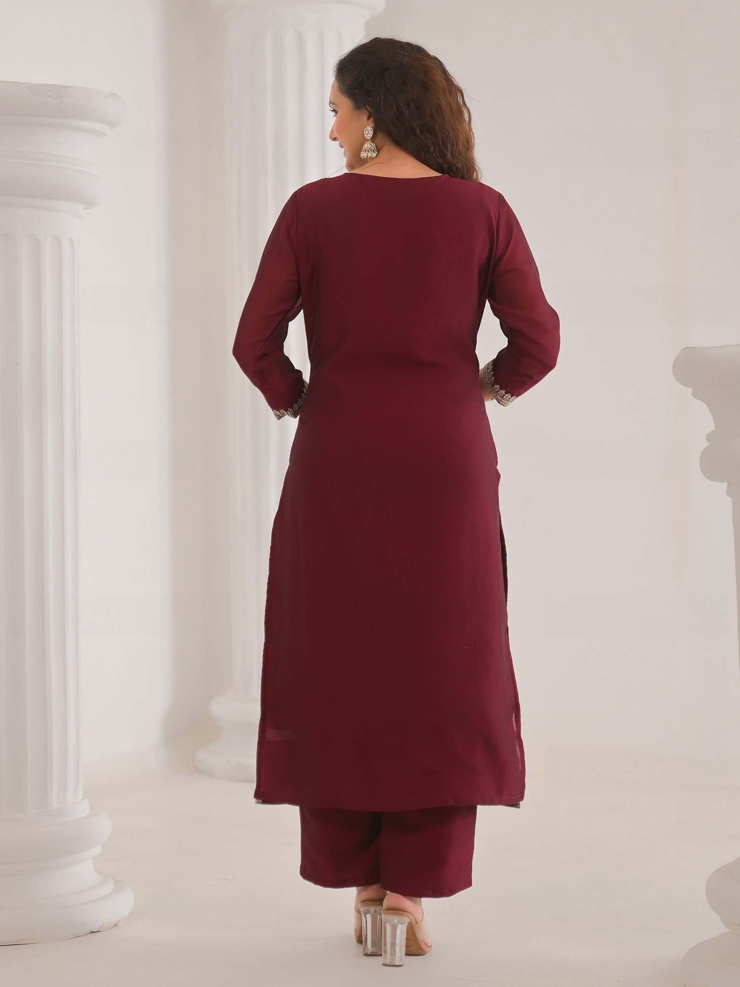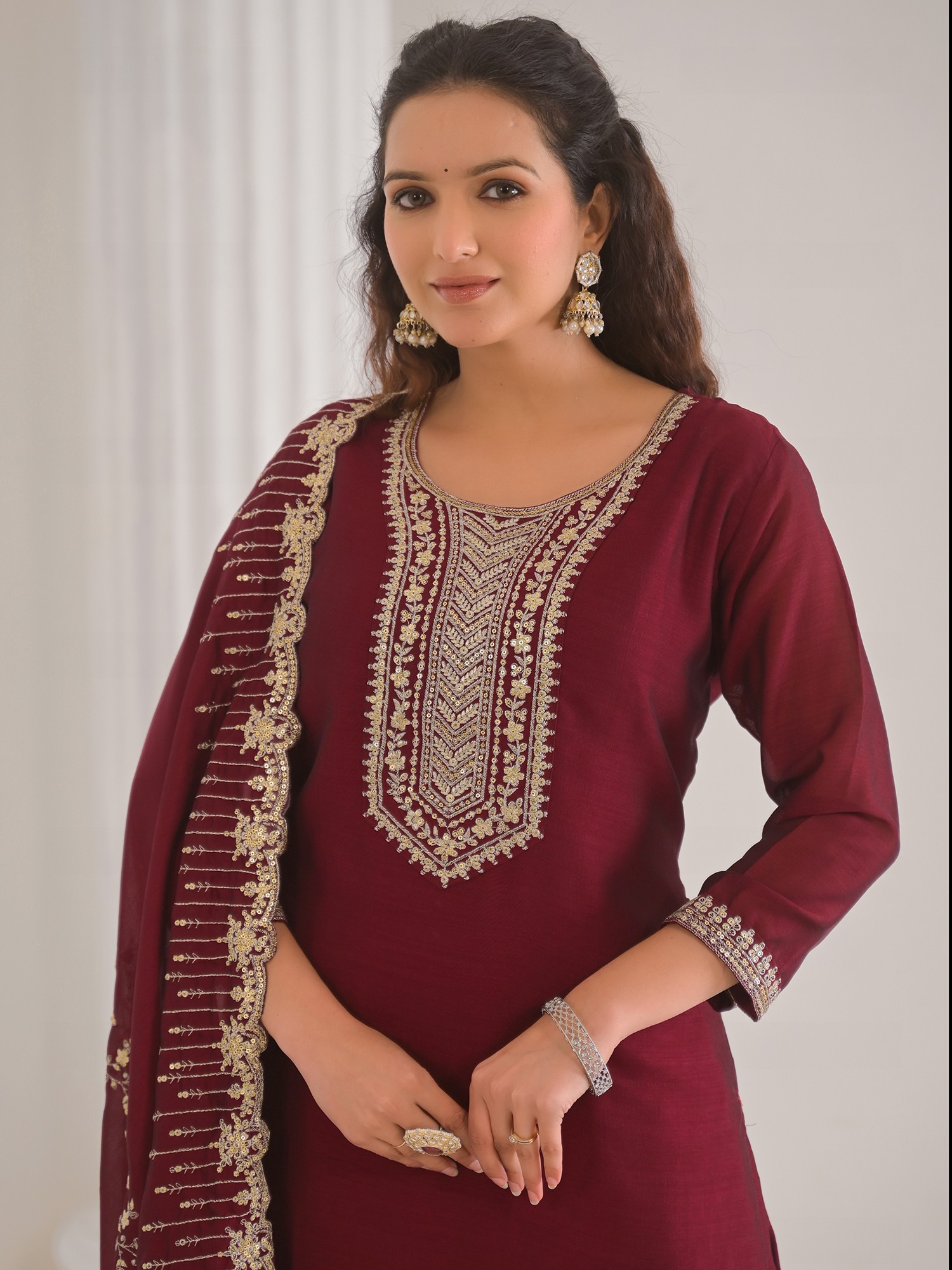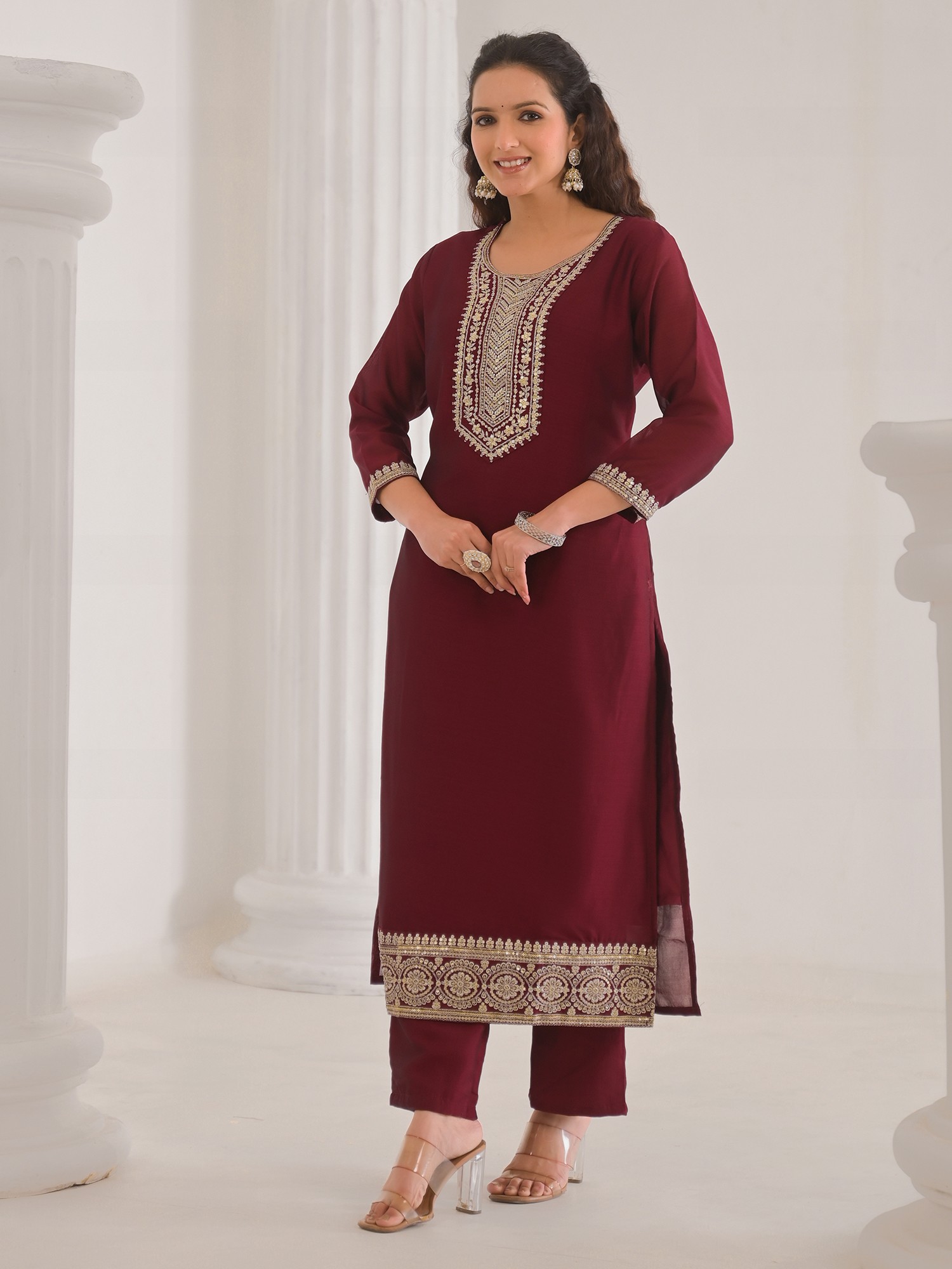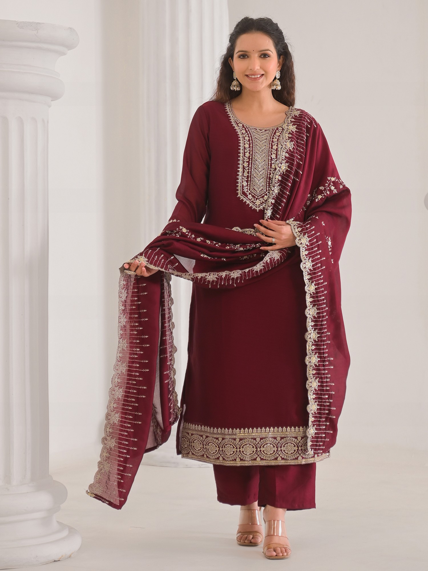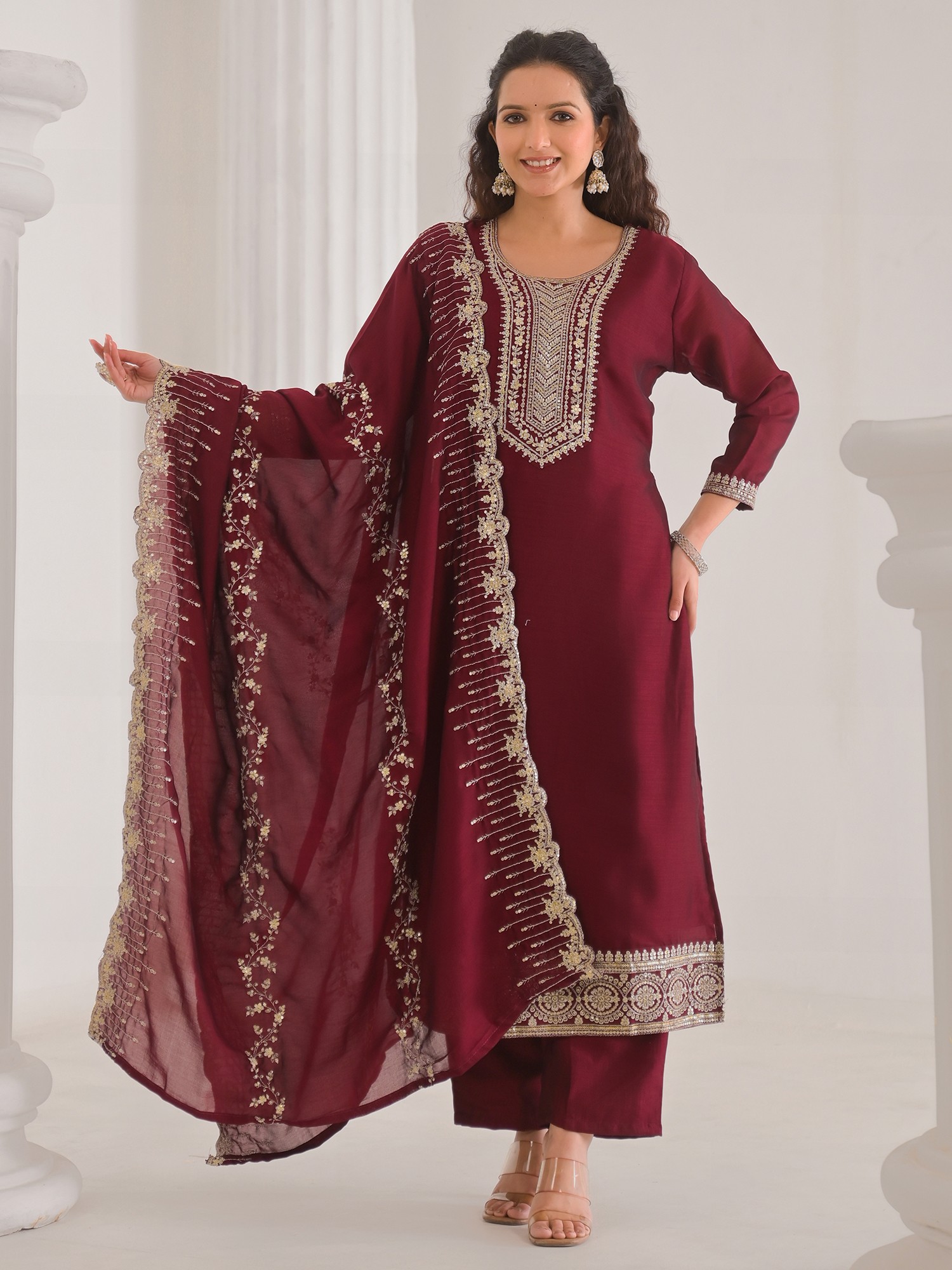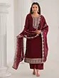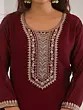 Vivid-Burgundy Floral Embroidery And Hand Work Round Neck Vichitra Silk Kurta With Trouser & Dupatta