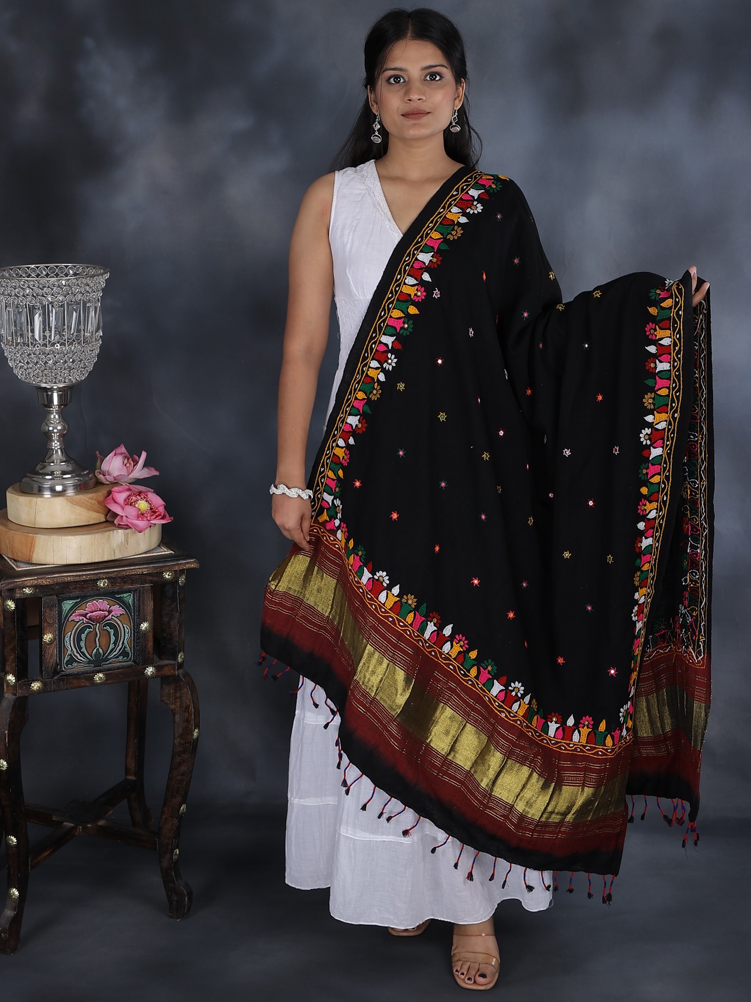 Indulge in the vibrant beauty of our Shawl from Kutch, embellished with multicolor mirror embroidered bootis and a golden Gajji Silk border. Crafted by skilled artisans in the heart of Kutch, this shawl is a masterpiece of tradition and craftsmanship. The mirror embroidery technique has deep roots in Kutch's heritage, where each mirror reflects the artisan's skill. Today, this shawl seamlessly aligns with contemporary fashion trends, adding a burst of color and artistry to your ensemble. The fusion of traditional bootis and the golden border creates a striking contrast, making this shawl a cherished accessory.