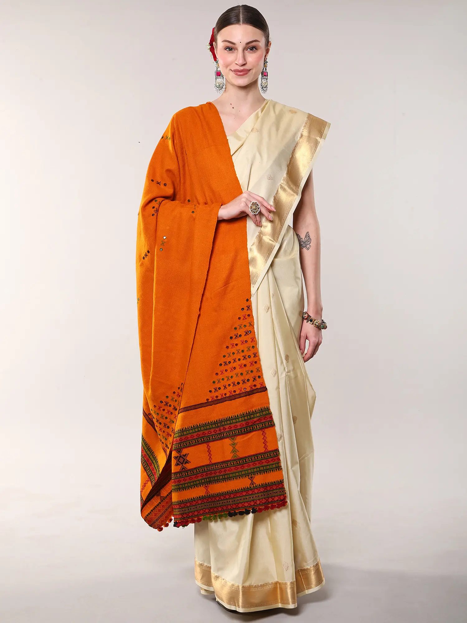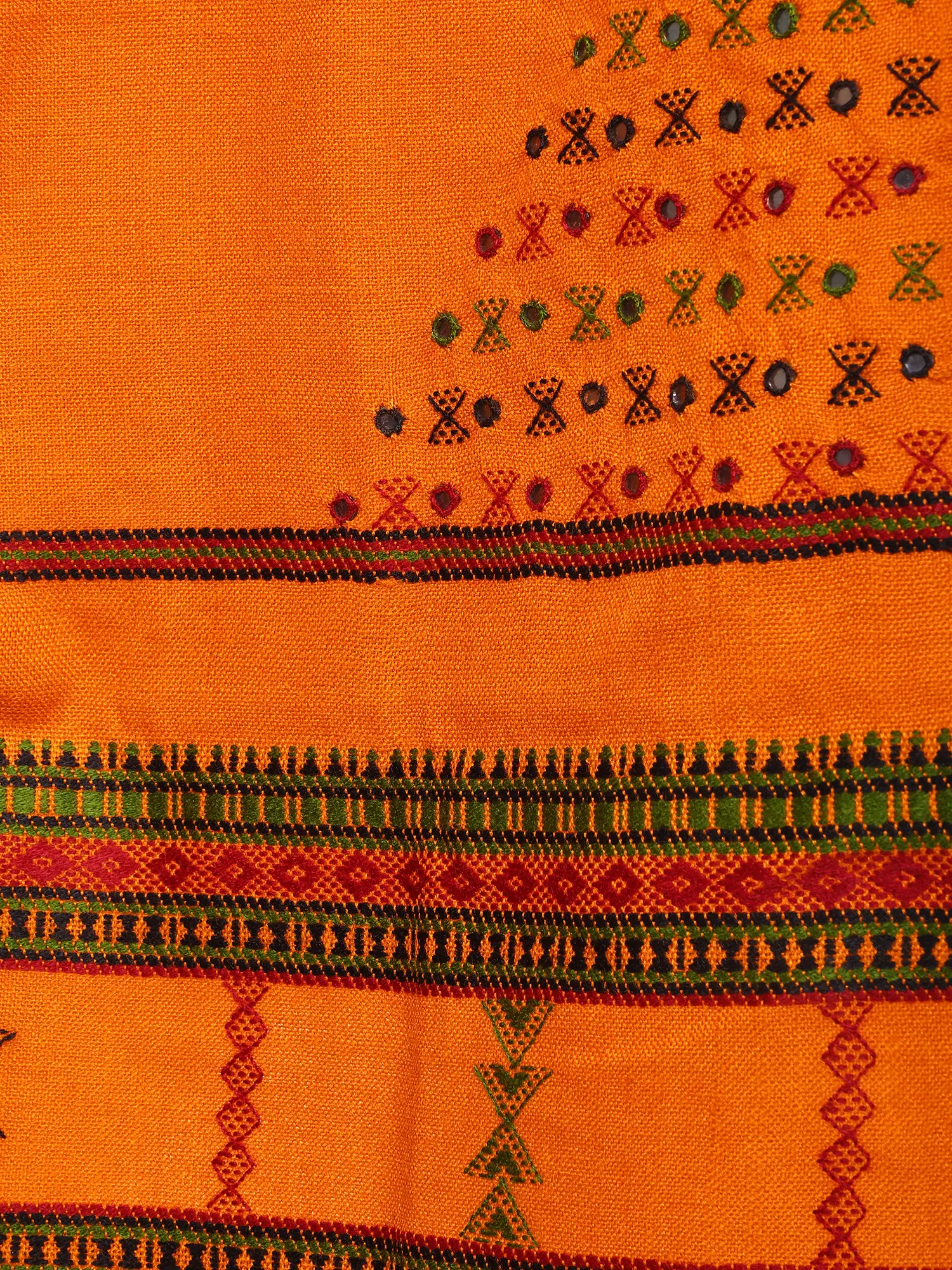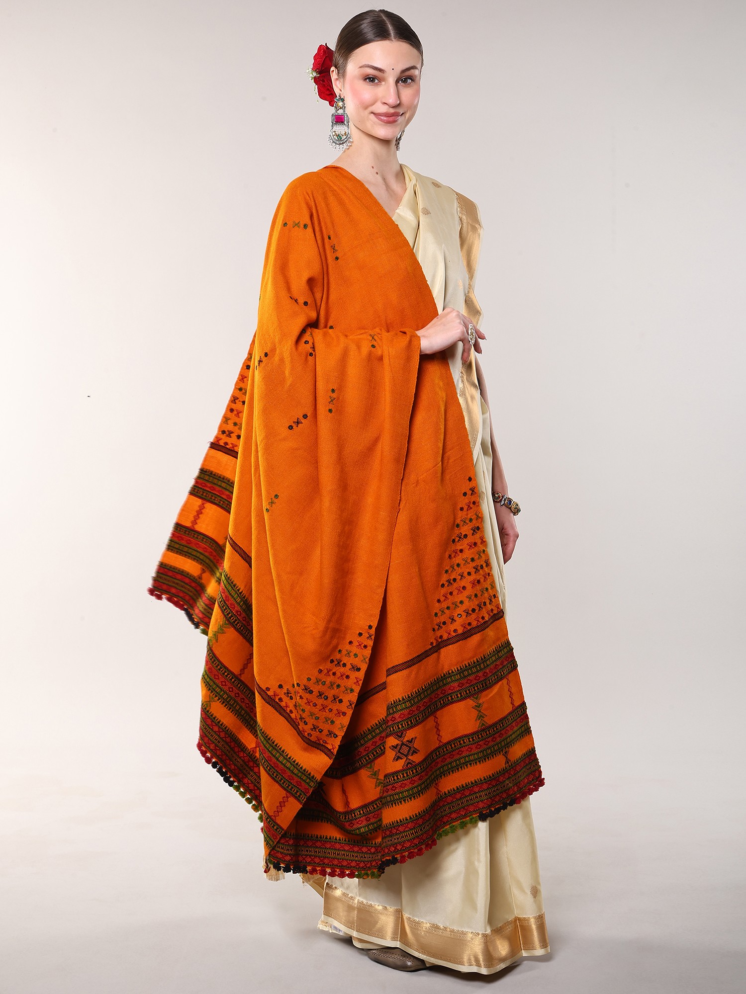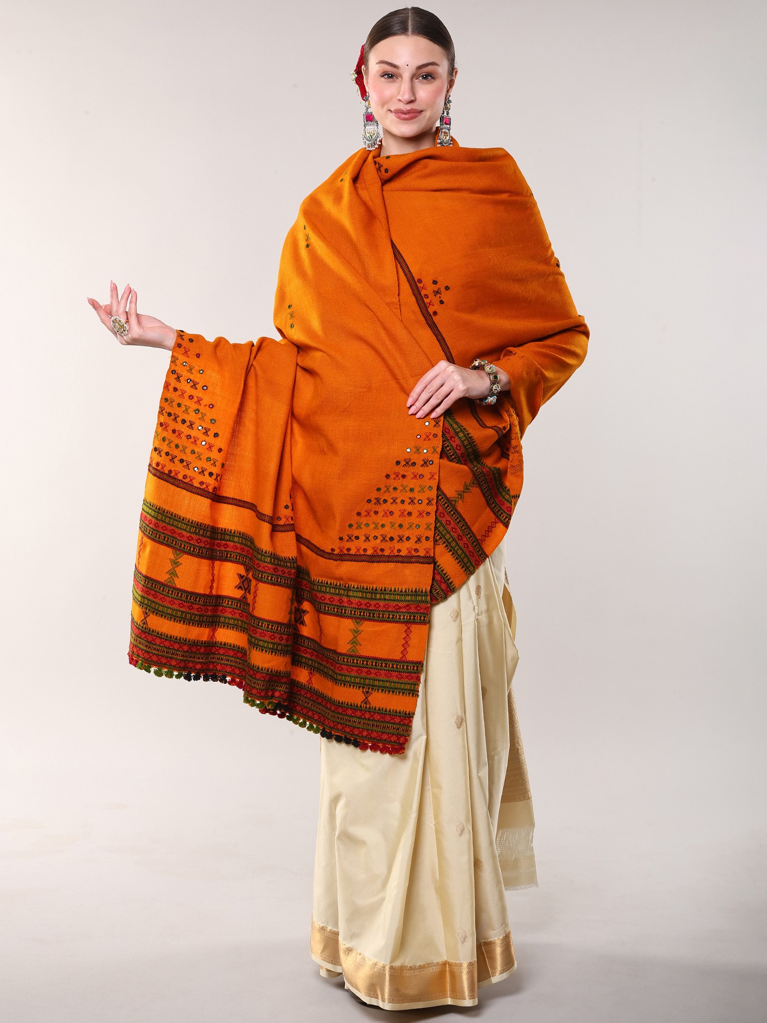 The vibrant culture of Kutch comes alive in this Shawl adorned with a woven border and embroidered mirrors. Kutch, a treasure trove of art, brings you this piece. The woven border, inspired by the region's heritage, carries the essence of Kutchi craftsmanship. Intricately embroidered mirrors add a touch of tradition to this contemporary masterpiece. The colors mirror the vibrancy of the desert landscape. Each mirror and thread reflect the dedication of Kutchi artisans, whose skills have been honed over generations. Wearing this shawl, you adorn yourself with not just a garment but a piece of Kutch's rich artistic legacy.