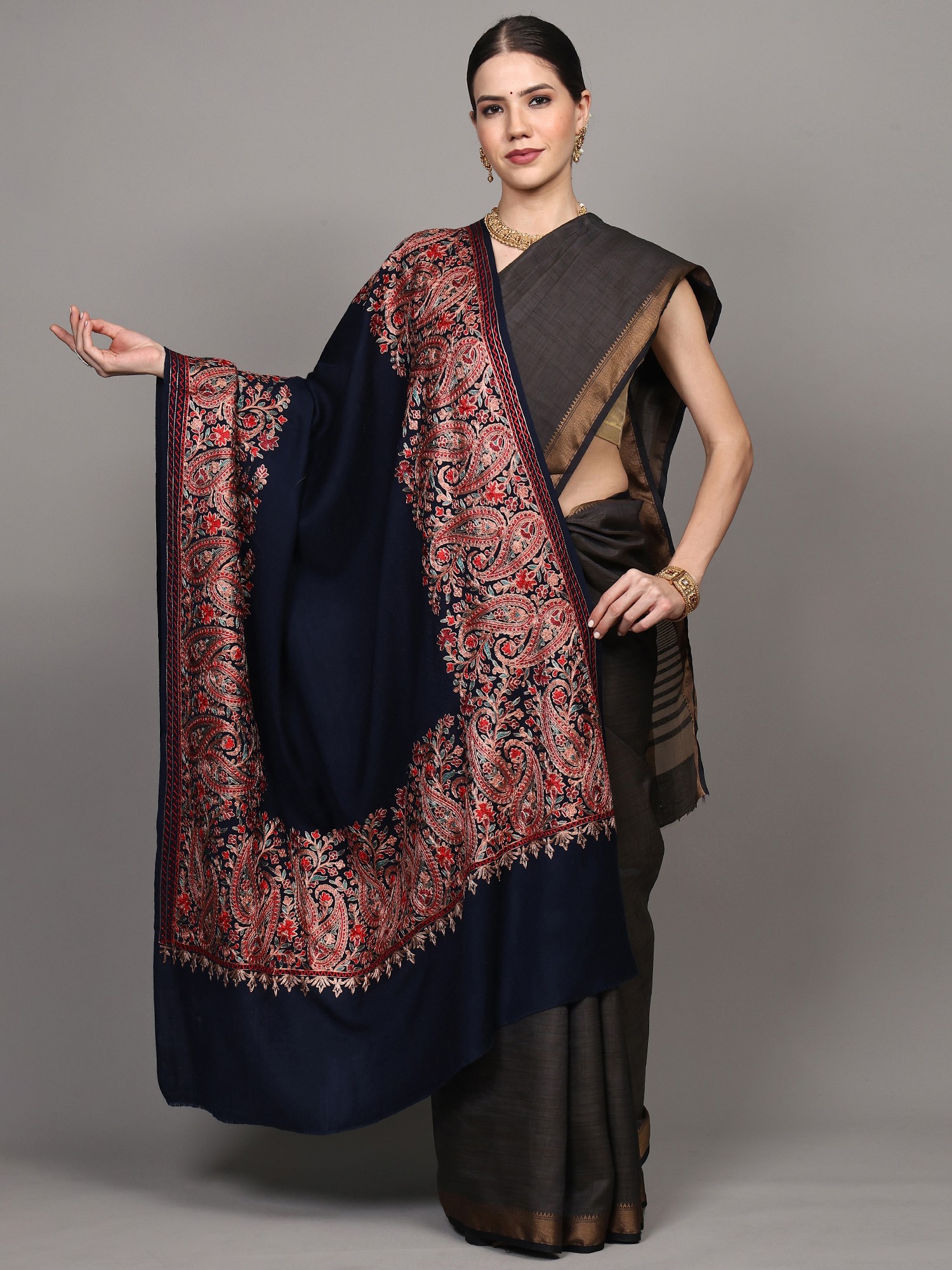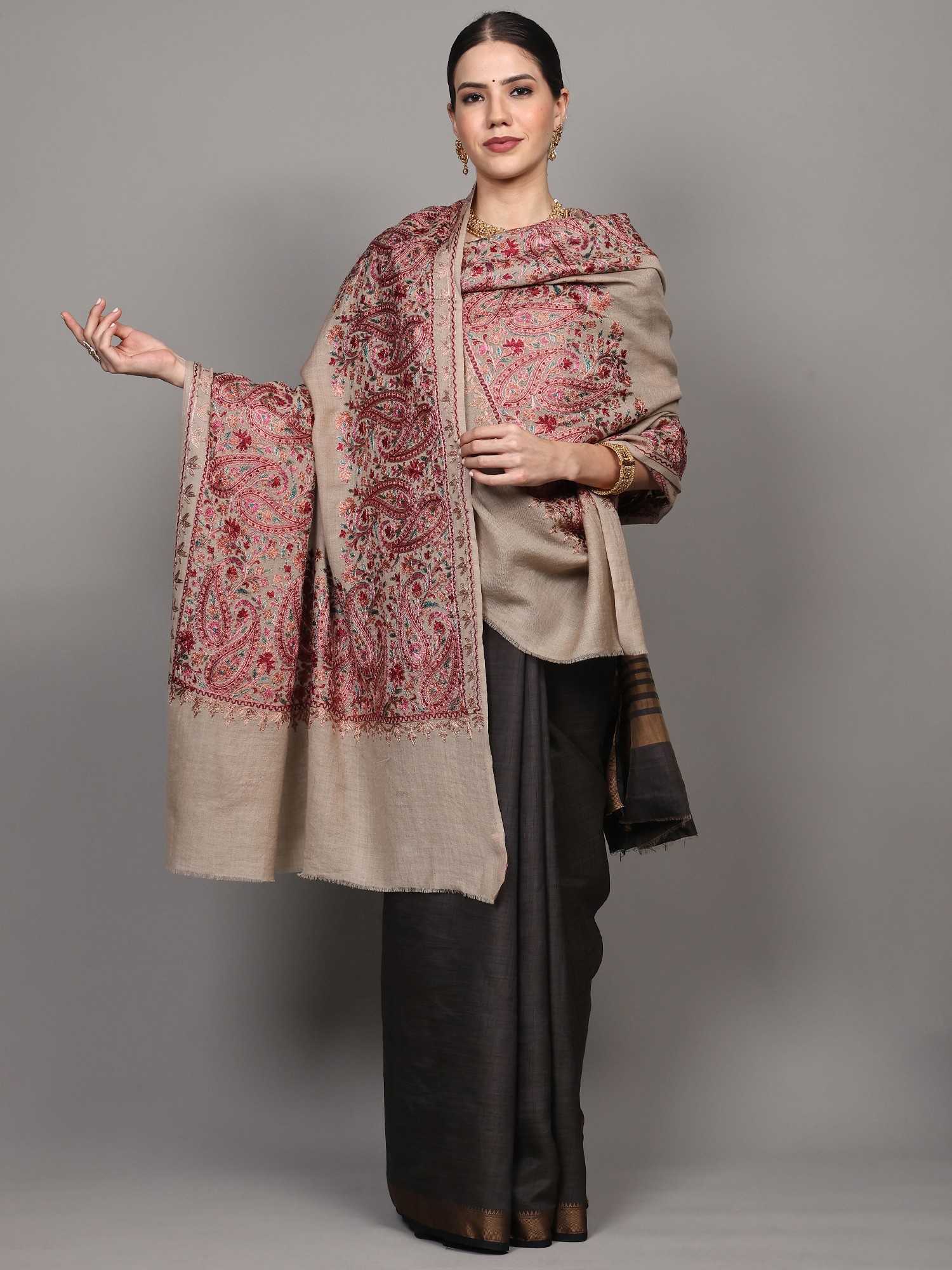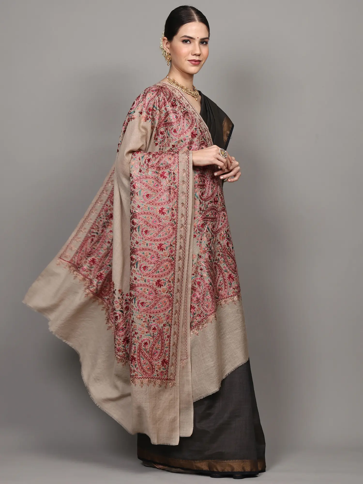 Pure Wool Plain Kashmiri Tusha Shawl with Sozni Hand Embroidered Wide Border
