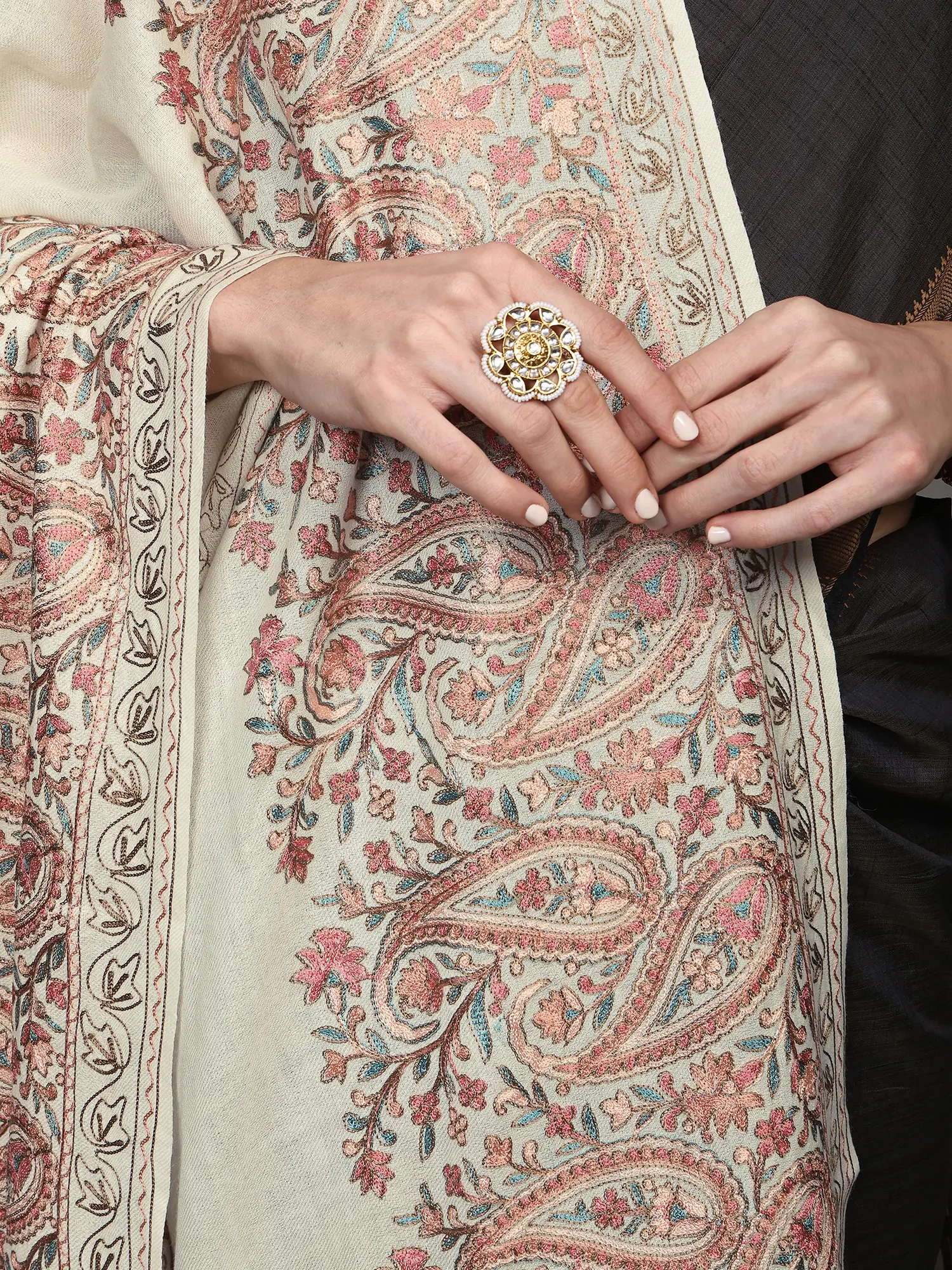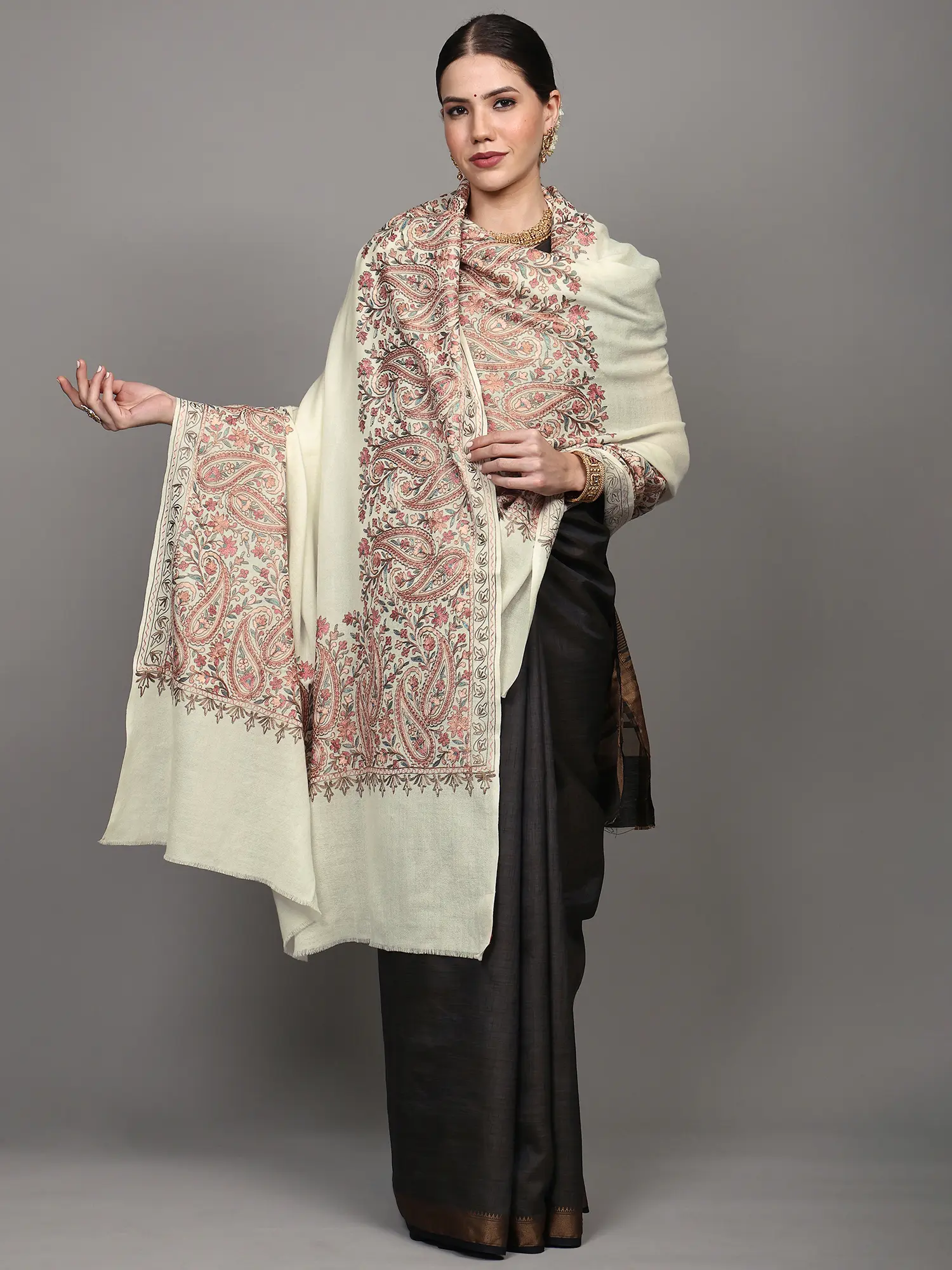 Antique-White Pure Pashmina Shawl with Intricate Sozni Embroidered Paisley Border
