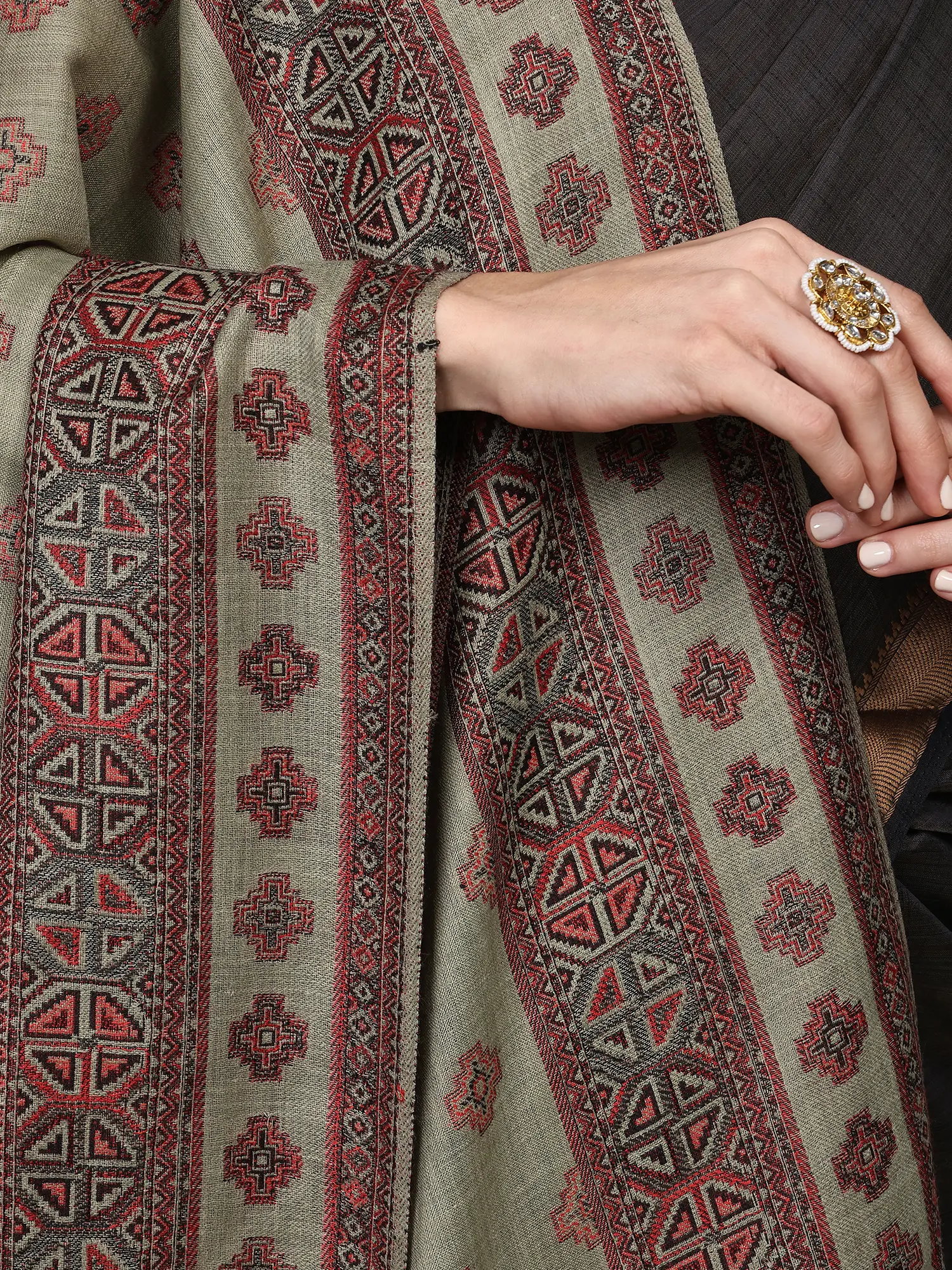 Crafted from premium wool, this shawl offers unparalleled warmth and a luxuriously soft feel against the skin. Its generous dimensions ensure it can be draped and styled in numerous ways, offering both comfort and elegance. Whether you choose to wrap it snugly around your shoulders on a chilly evening, let it cascade elegantly over your outfit, or even use it as a statement accent piece, this shawl promises to elevate your ensemble. The detailed weaving showcases a dynamic interplay of geometric shapes and subtle floral elements, drawing the eye and adding a sophisticated flair to any look.