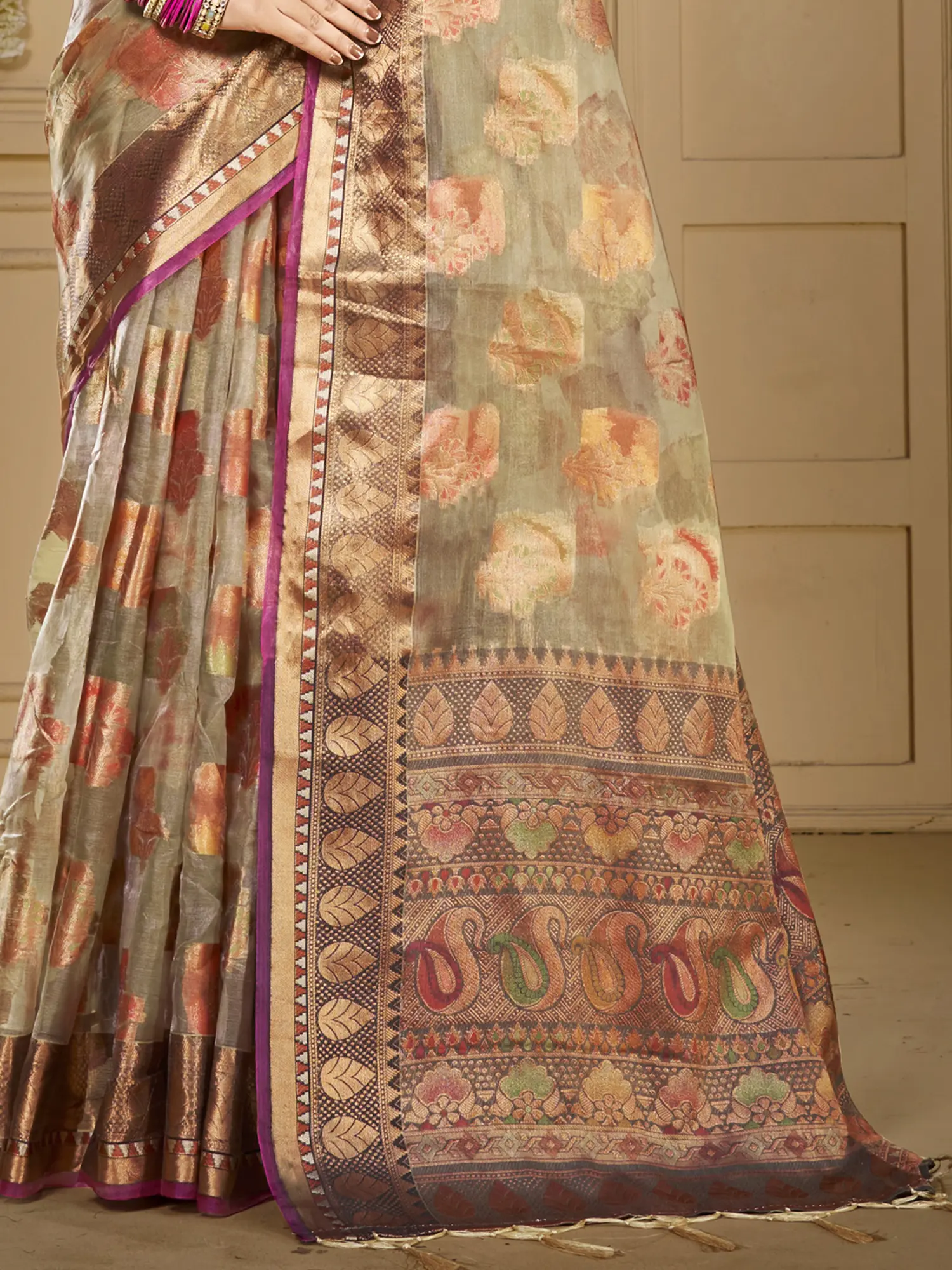 The body of the saree is adorned with a delicate scattering of floral and leaf motifs, rendered in soft, muted tones that exude a natural, organic beauty. These charming patterns are interspersed with the rich, intricate designs of paisleys, which add a touch of classic Indian artistry and a warm, inviting feel. The contrast border, a striking band of deep color and metallic threads, frames the delicate motifs with sophistication. This border is further enhanced by the presence of traditional paisley motifs, meticulously woven to create a rich tapestry of design. The pallu, the most significant part of the saree, is a true spectacle. It features a densely patterned design, showcasing the grandeur of paisley motifs that are synonymous with Indian heritage and auspiciousness. The addition of delicate tassels at the hem of the pallu lends a playful yet refined finish, completing the visual narrative of this stunning garment.