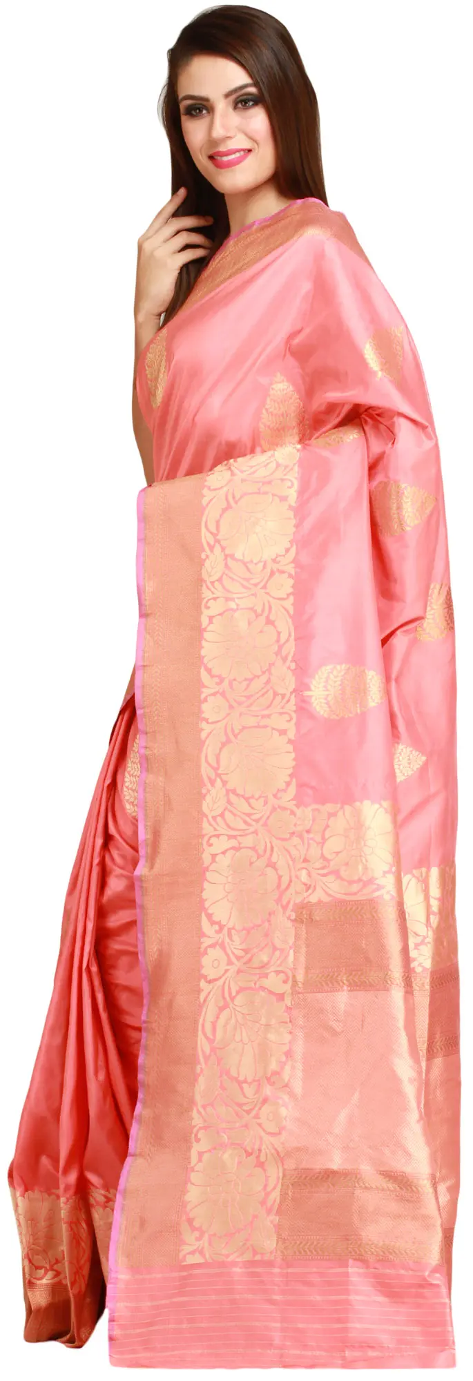 Shell-Pink Banarasi Handloom Sari with Woven Floral Border in Zari Thread